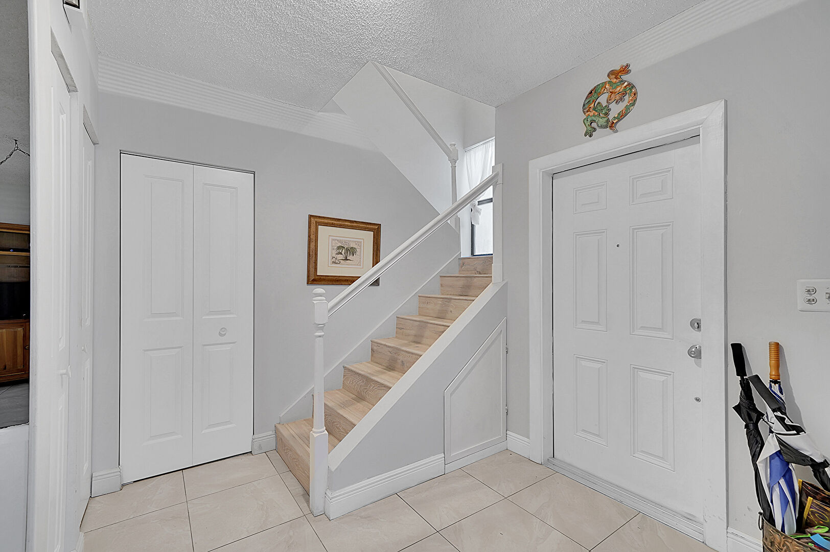 Baseboards Wall, Drywall, Natural Light, Stairs, Tile Floor, Textured Ceiling