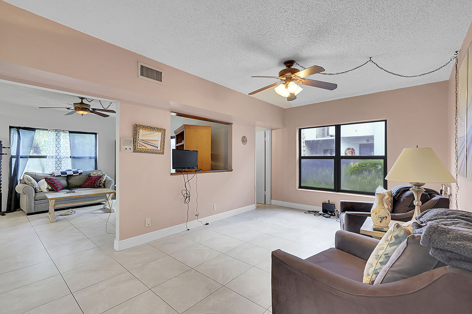 Baseboards Wall, Ceiling Fan, Drywall, Natural Light, Textured Ceiling, Tile Floor, U Shaped Kitchen, Vent, Drywall, Textured Ceiling