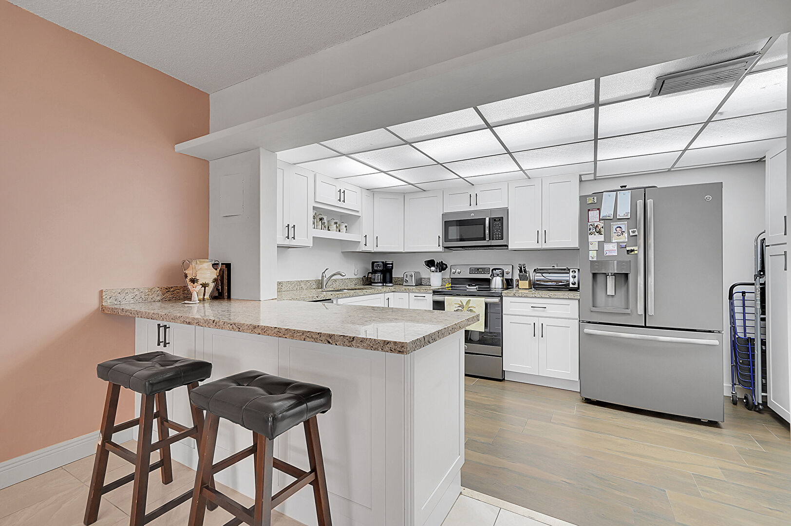 Baseboards Wall, Drywall, Kitchen Bar, Kitchen Peninsula, Opens To Living Area, Pendant Lighting, Shaker Cabinets, Stone Countertops, Textured Ceiling, Tile Floor, Toaster, U Shaped Kitchen, Vent, Kitchen Peninsula, Textured Ceiling