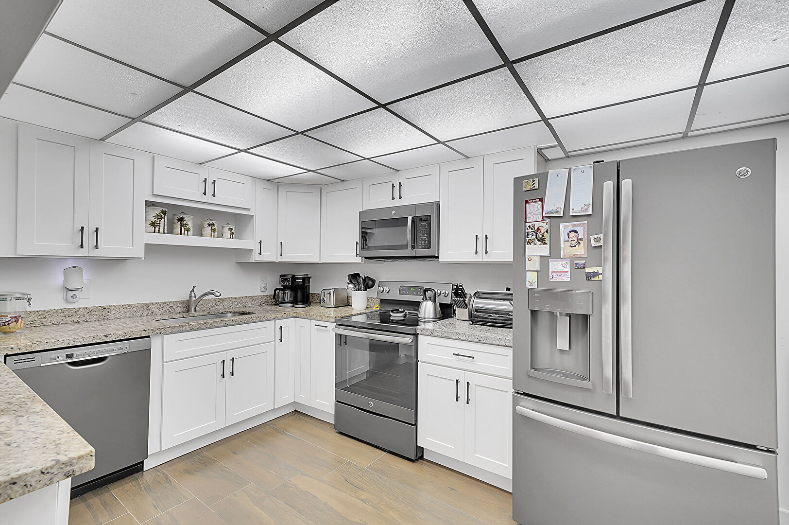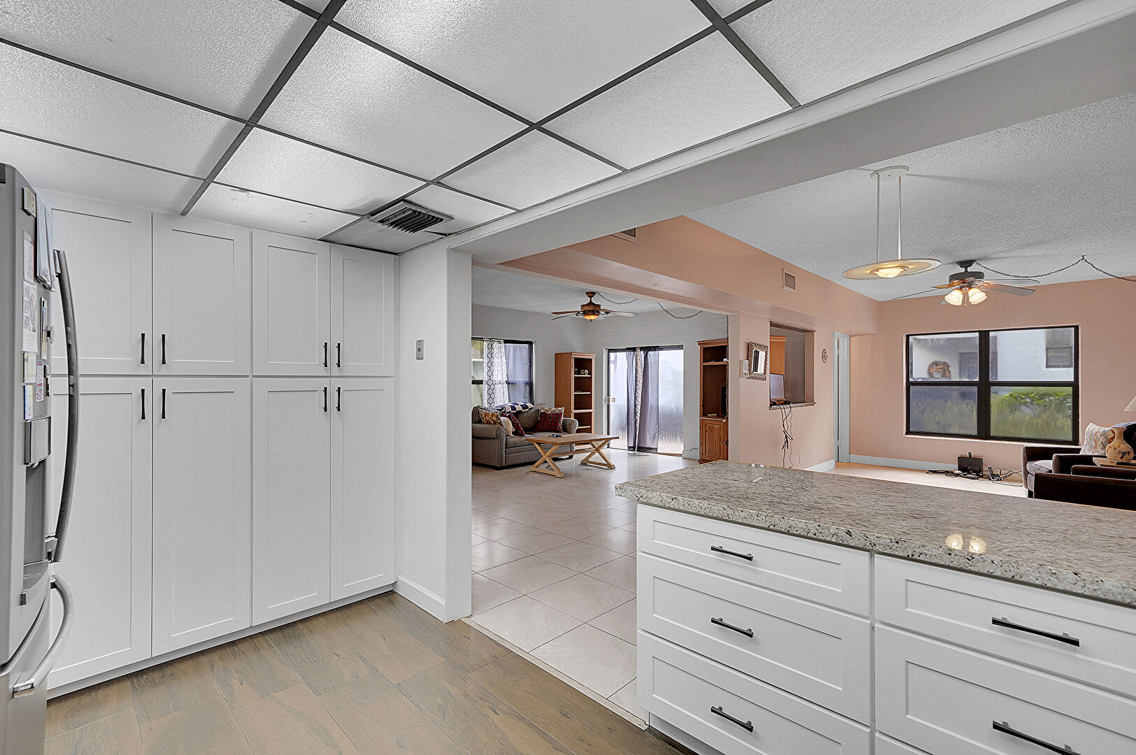 Baseboards Wall, Ceiling Fan, Drop Ceiling, Drywall, Kitchen Bar, Kitchen Peninsula, Natural Light, Open Shelves, Opens To Living Area, Pendant Lighting, Shaker Cabinets, Stone Countertops, Textured Ceiling, Tile Floor, Toaster, U Shaped Kitchen, Vent, Wood Finish Floor, Drywall, Tile Floor, Vent