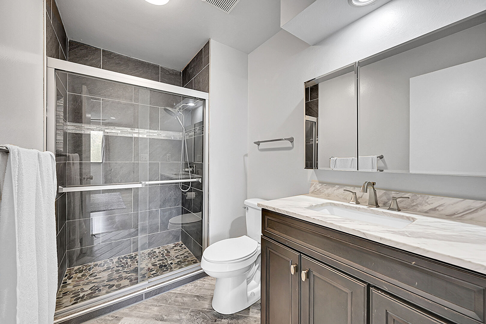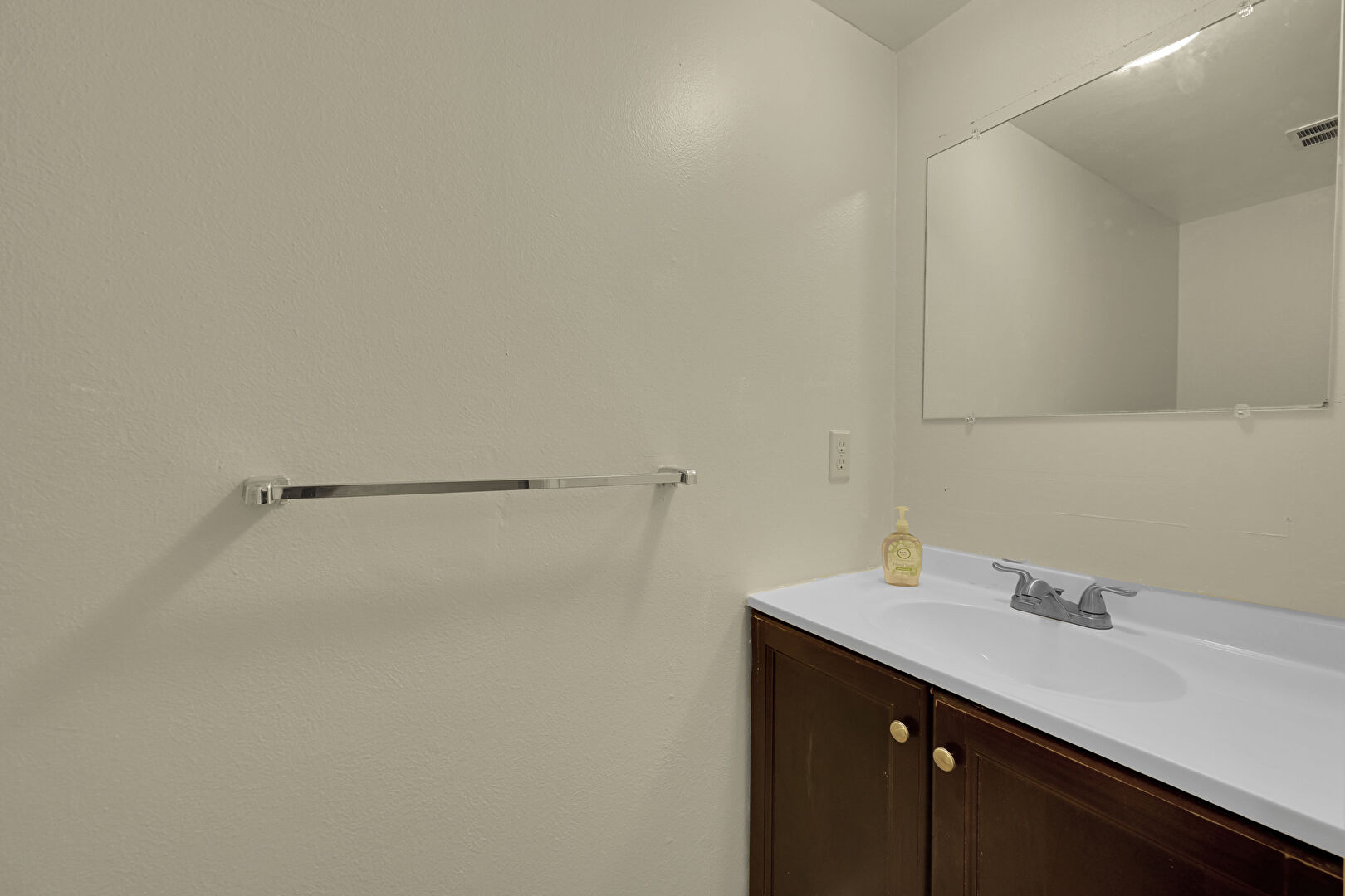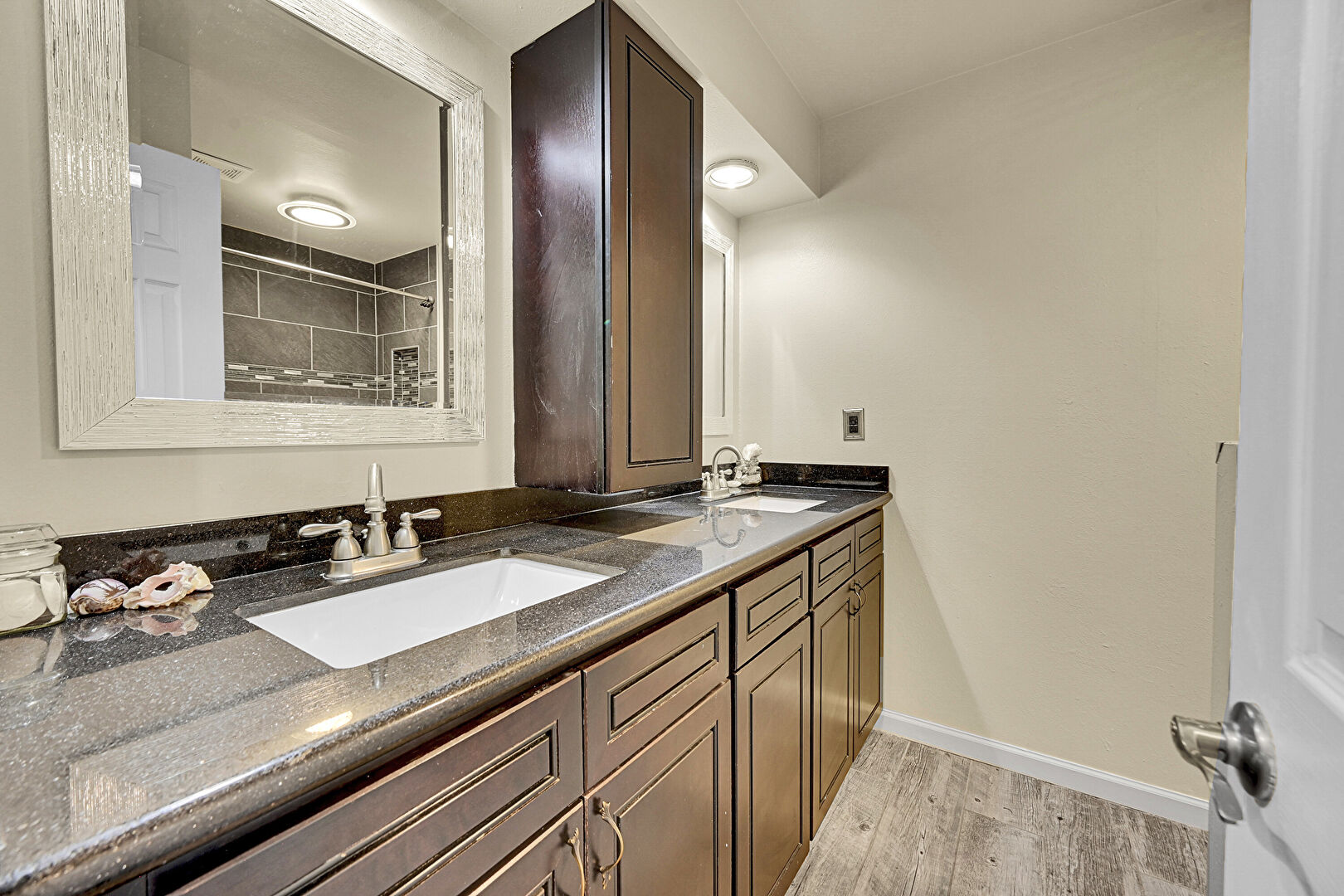 Baseboards Wall, Double Vanity, Drywall, Full Bathroom, Recessed Lighting, Textured Wall, Vanity, Vent, Wood Finish Floor, Combined Bath Shower, Drywall, Full Bathroom, Wood Finish Floor