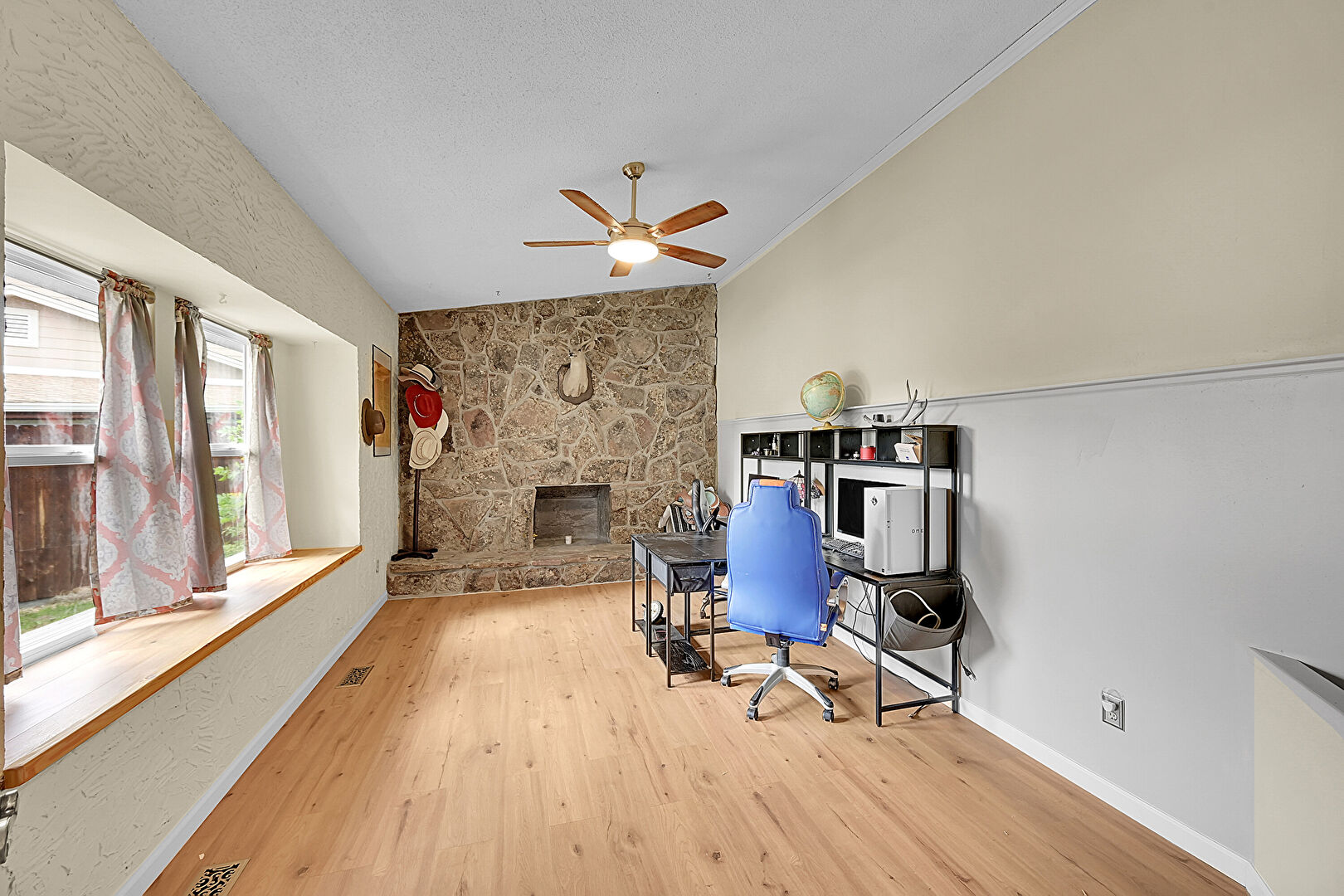 Baseboards Wall, Ceiling Fan, Crown Molding, Drywall, Fireplace, French Doors, High Ceiling, Natural Light, Office Area, Textured Ceiling, Vaulted Ceiling, Vent, Wood Finish Floor