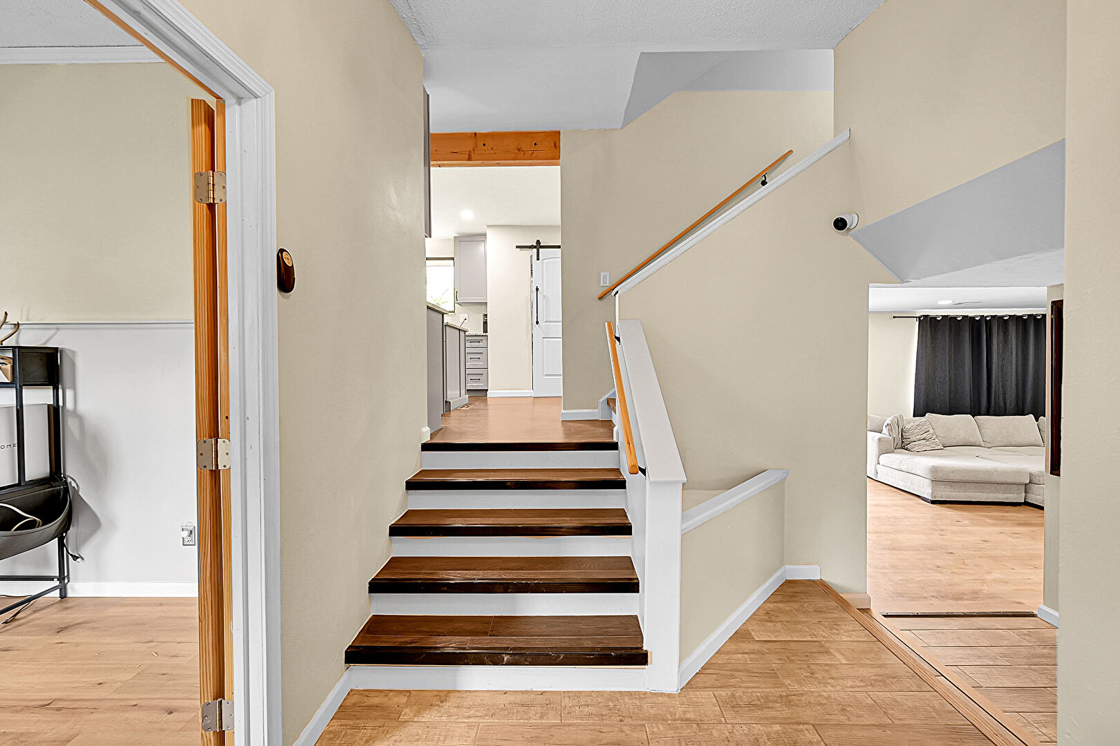 Barn Door, Drywall, Recessed Lighting, Stairs, Wood Finish Floor, Baseboards Wall