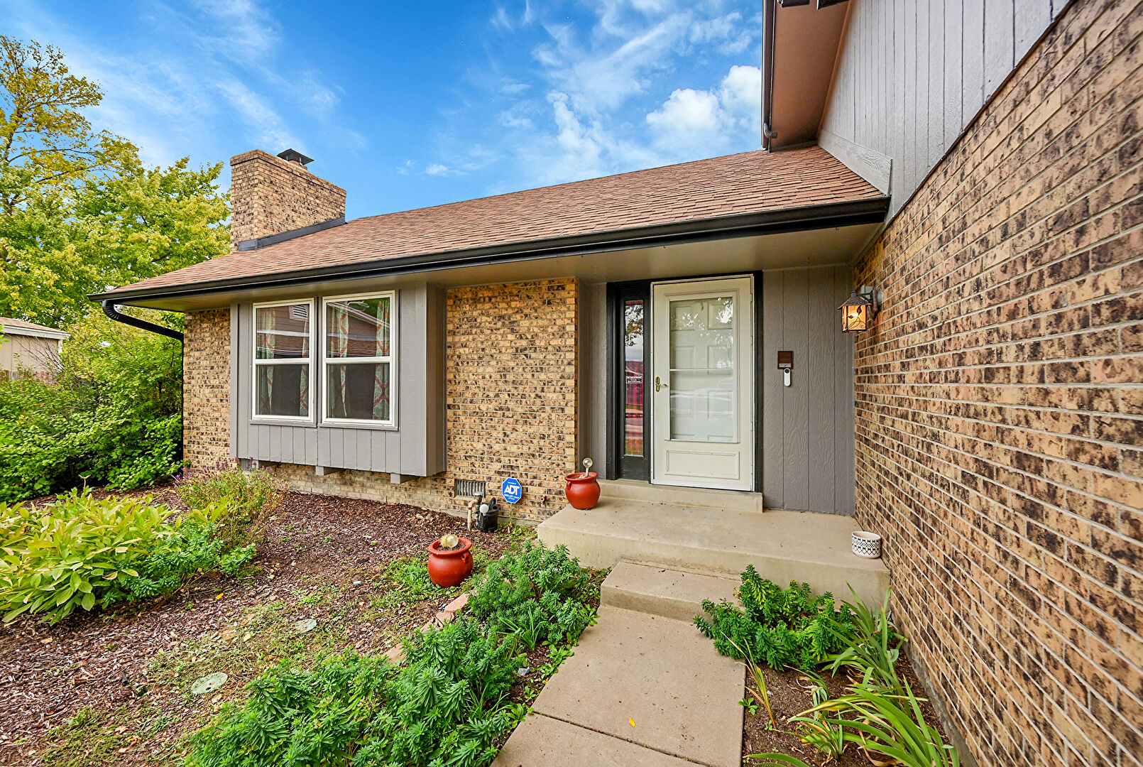 Brick Siding, Chimney, Downspout, Gutters, Shingle Roof, Vertical Siding, Stoop