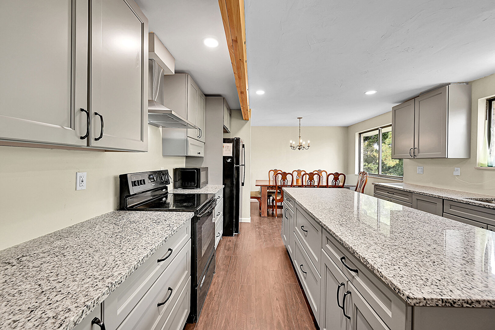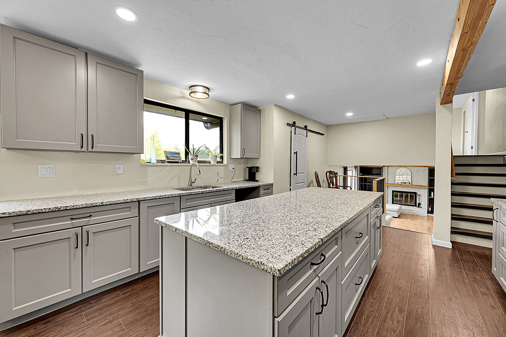 Barn Door, Baseboards Wall, Beamed Ceiling, Drywall, Gray Cabinets, Kitchen Island, Natural Light, Notable Chandelier, Pendant Lighting, Recessed Lighting, Shaker Cabinets, Stone Countertops, Vent, Wood Finish Floor, Gray Cabinets, Notable Chandelier, Opens To Living Area