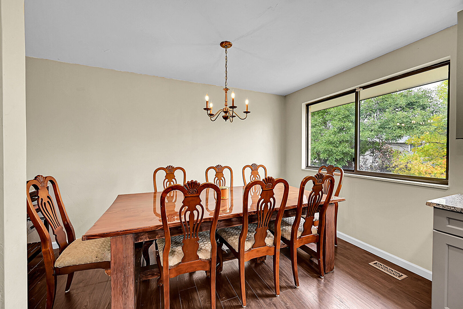 Baseboards Wall, Drywall, Natural Light, Notable Chandelier, Recessed Lighting, Stairs, U Shaped Kitchen, Vent, Wood Finish Floor, Drywall, Wood Finish Floor