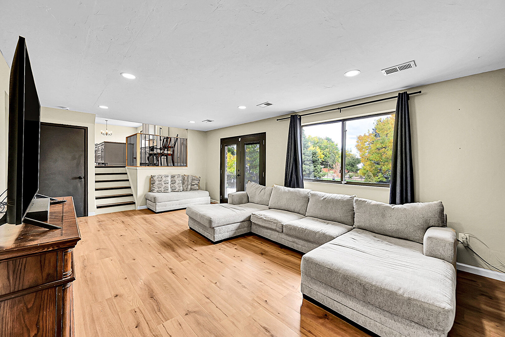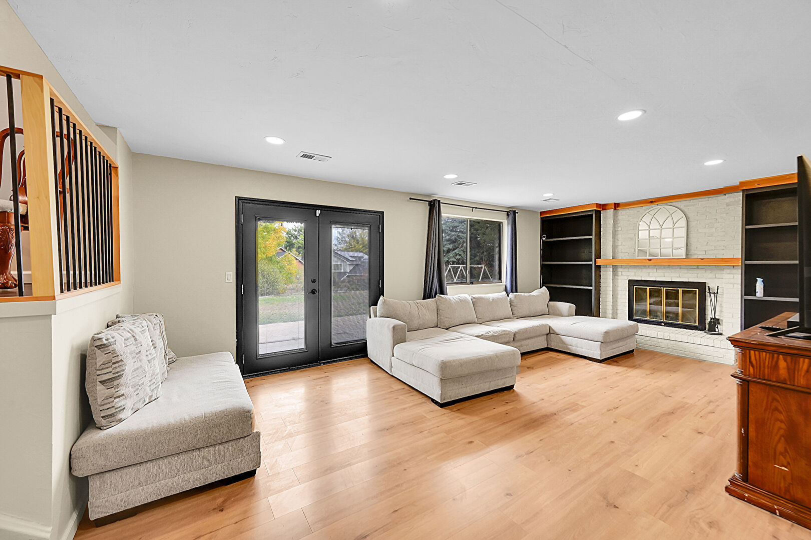Baseboards Wall, Built In Shelves, Drywall, Fireplace, French Doors, Natural Light, Recessed Lighting, Stairs, Vent, Wood Finish Floor, Built In Shelves, Drywall, Fireplace