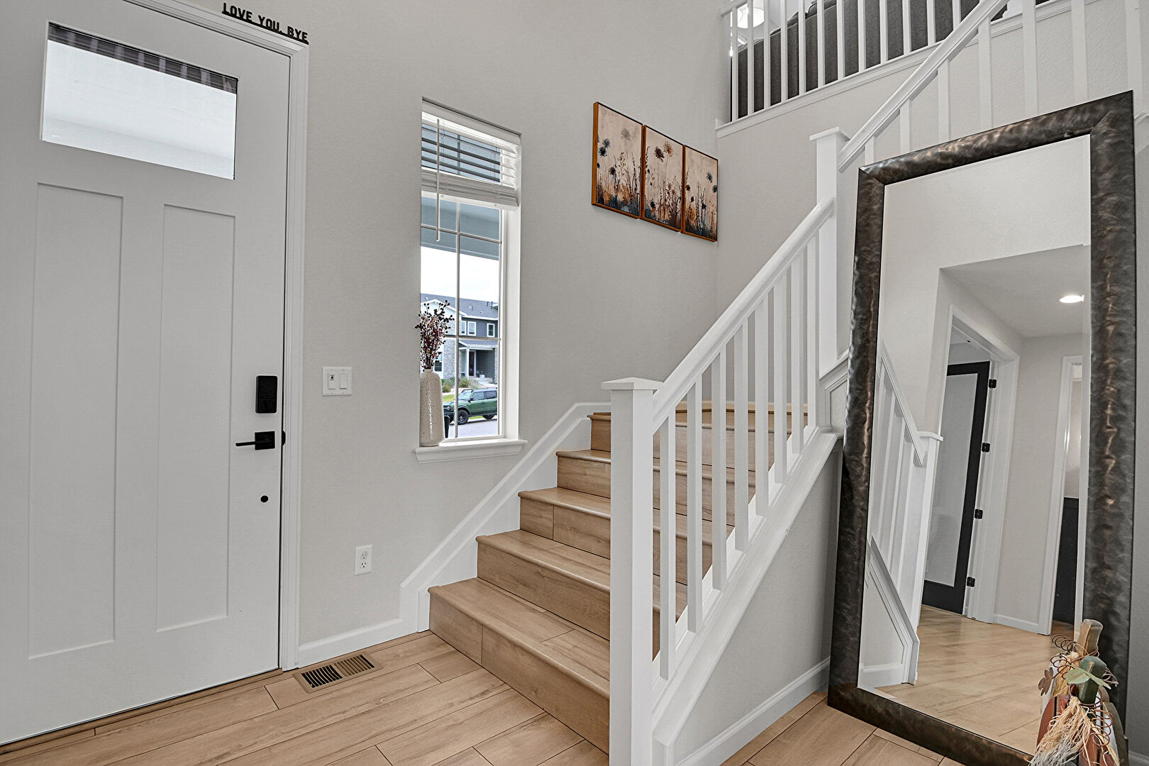Baseboards Wall, Drywall, High Ceiling, Natural Light, Vent, Wood Finish Floor, Stairs