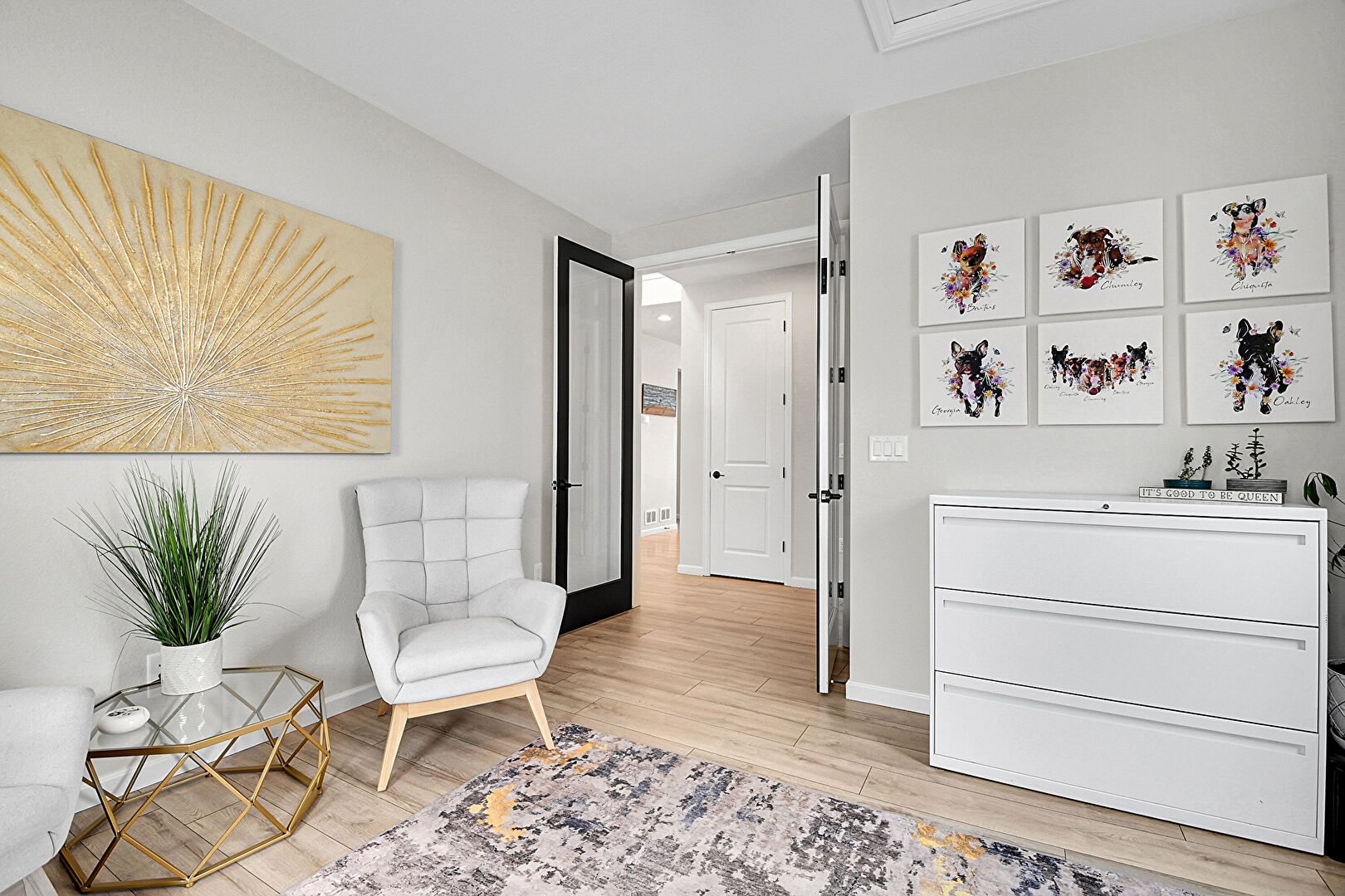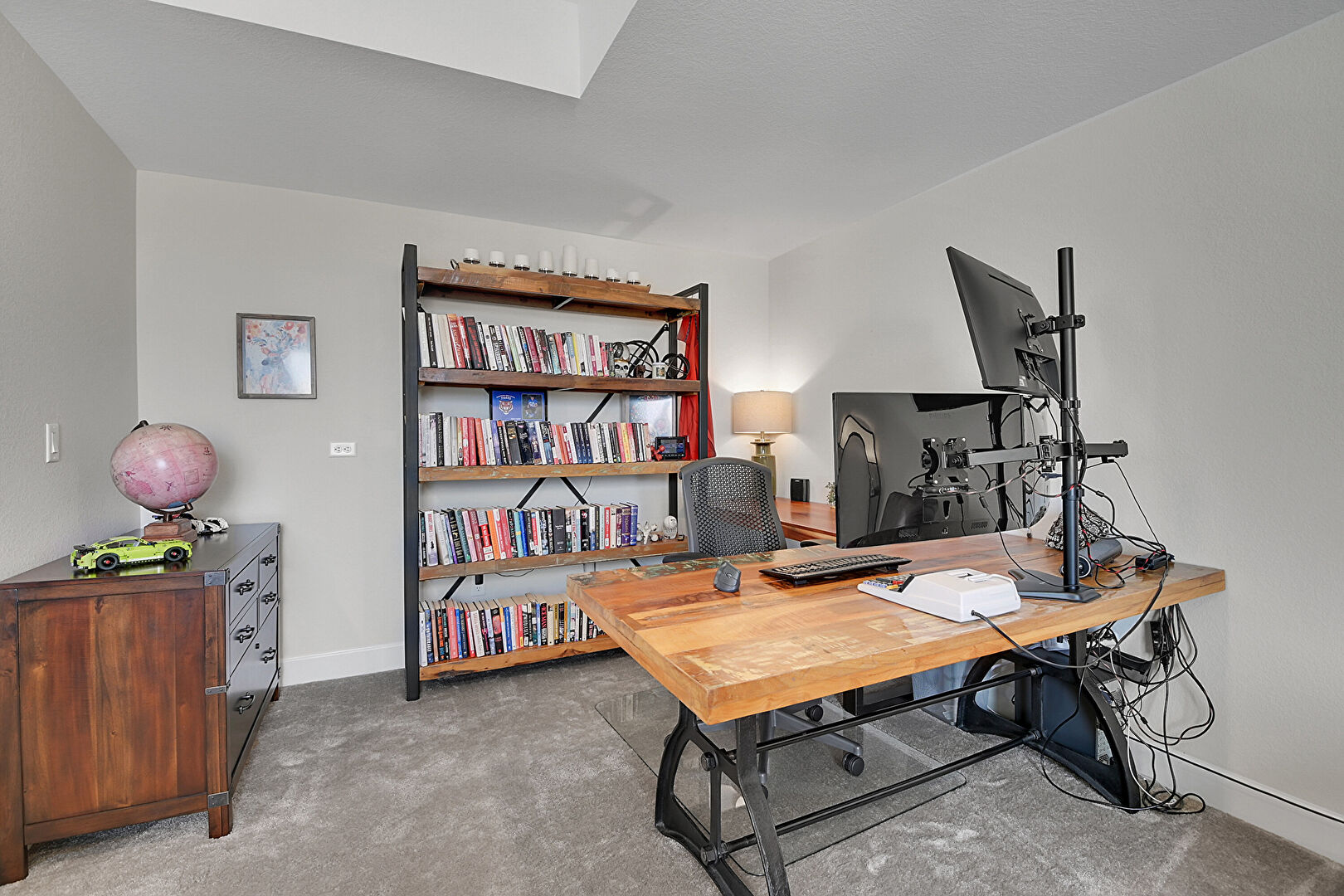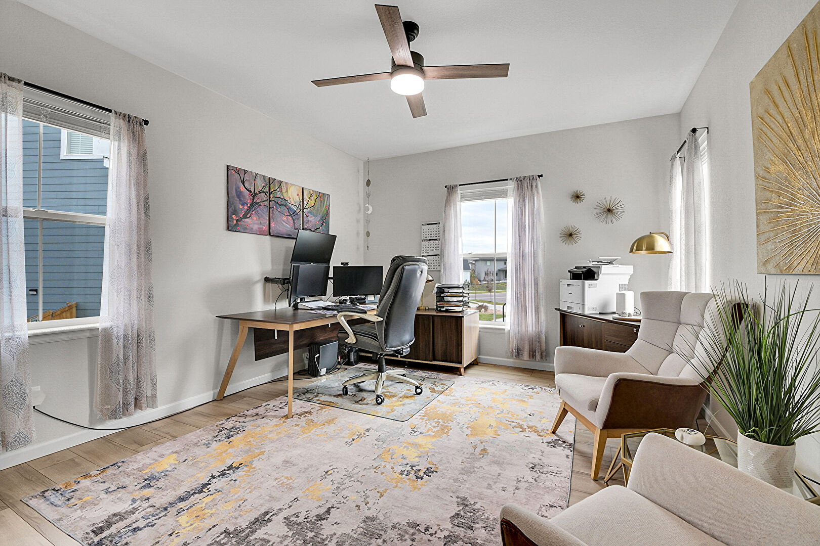 Baseboards Wall, Carpet, Ceiling Fan, Drywall, Natural Light, Office Area, Wood Finish Floor, Drywall, Office Area
