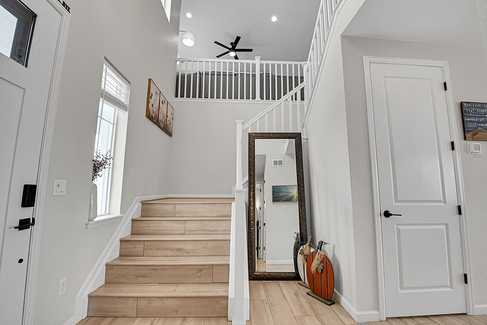 Baseboards Wall, Ceiling Fan, Drywall, High Ceiling, Natural Light, Recessed Lighting, Vent, Wood Finish Floor, Stairs