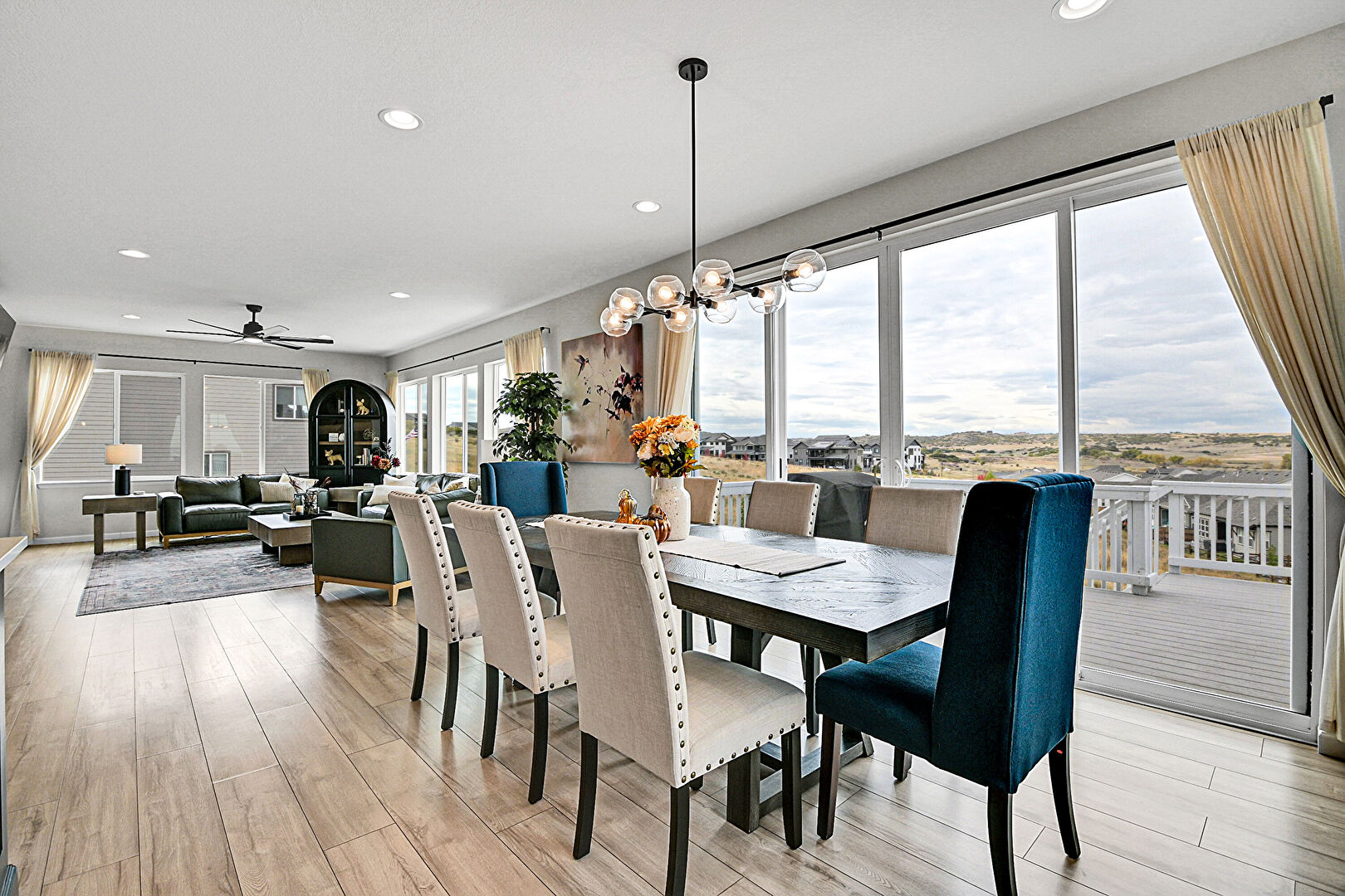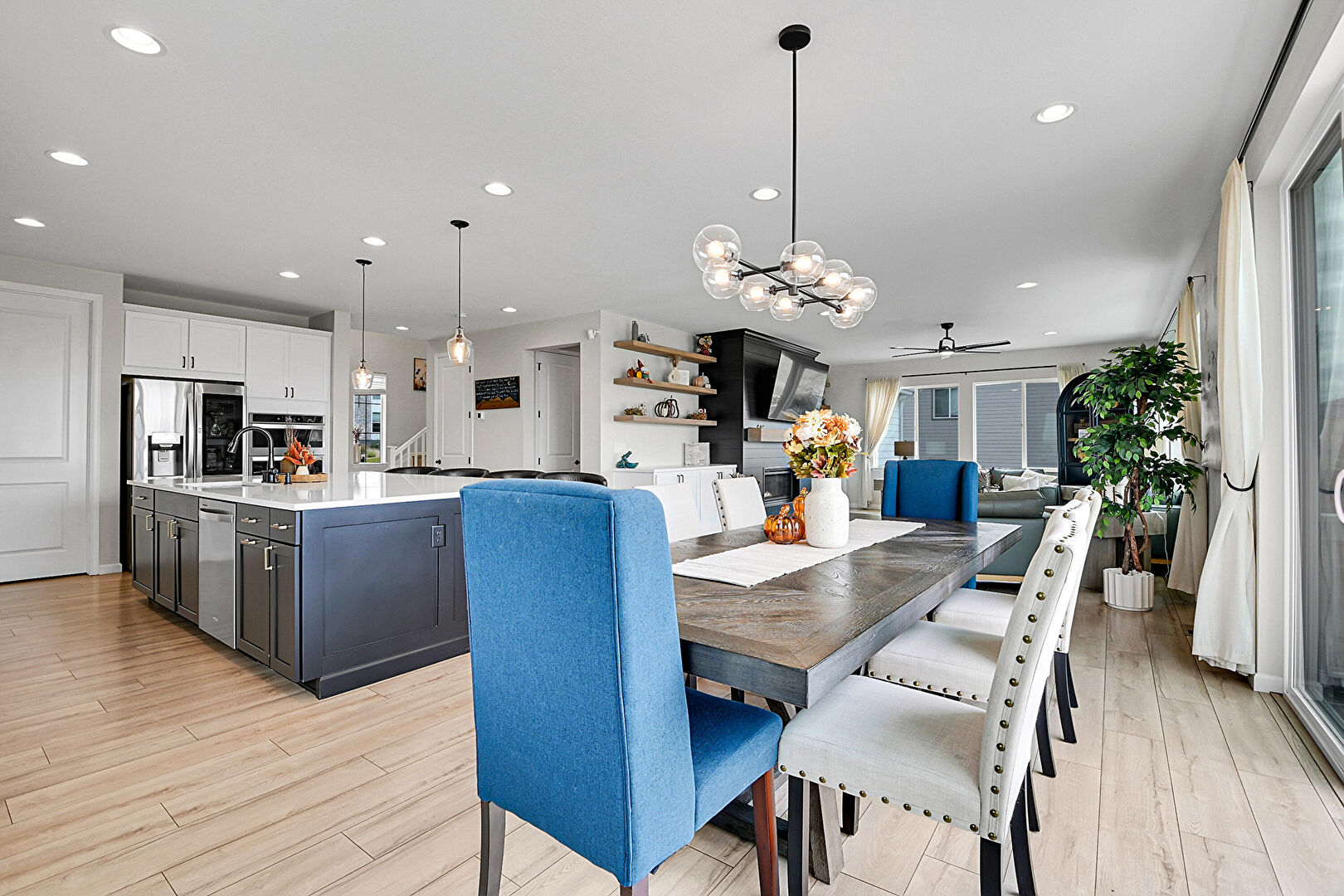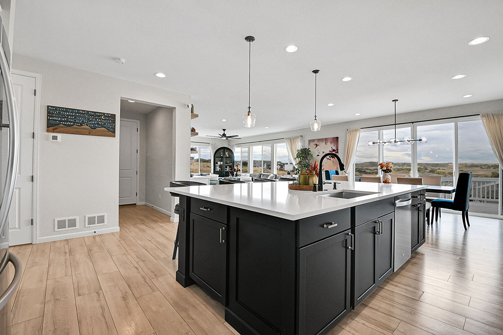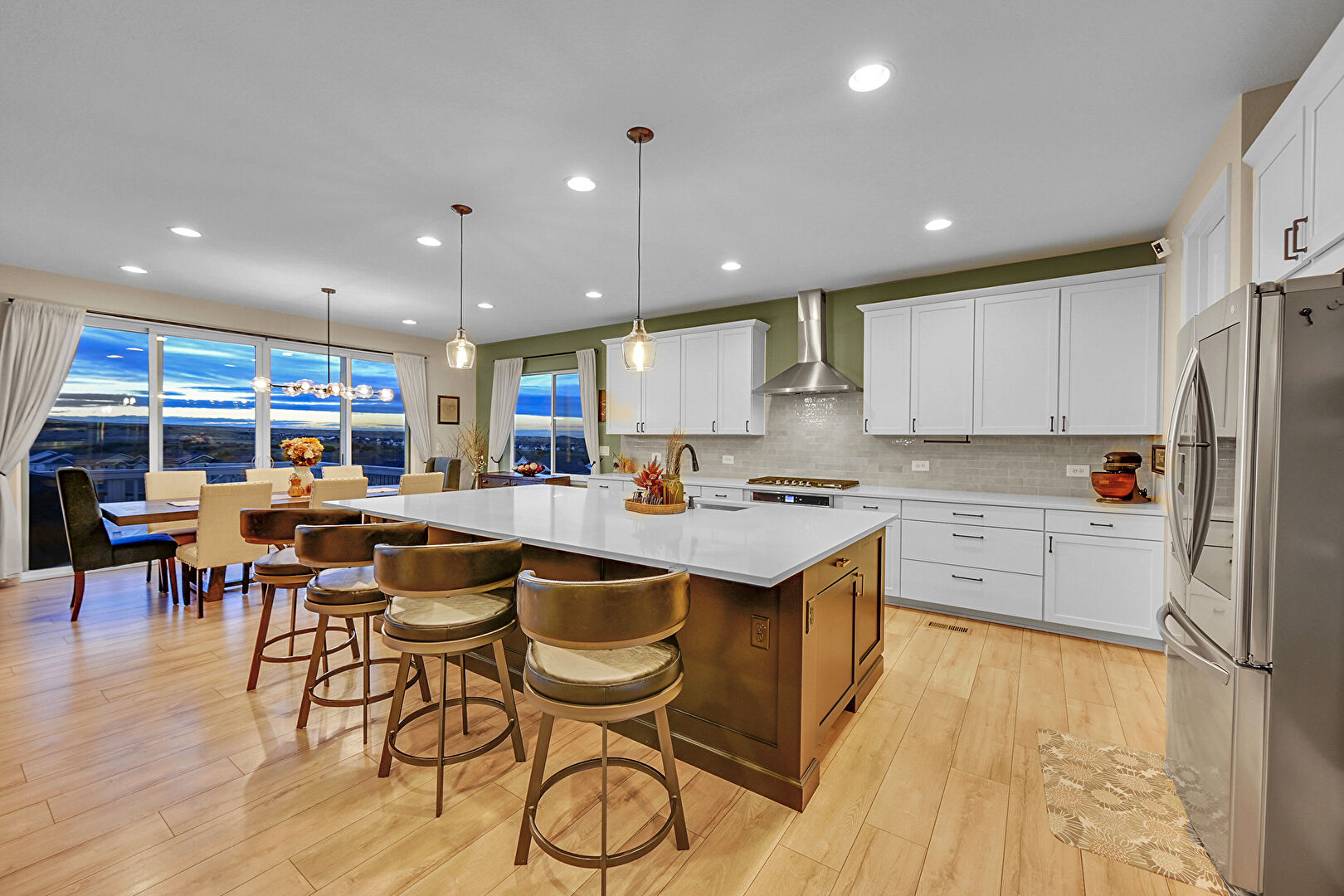 Ceiling Fan, Drywall, L Shaped Kitchen, Natural Light, Notable Chandelier, Recessed Lighting, Wood Finish Floor, Baseboards Wall, Ceiling Fan, Drywall, Wood Finish Floor