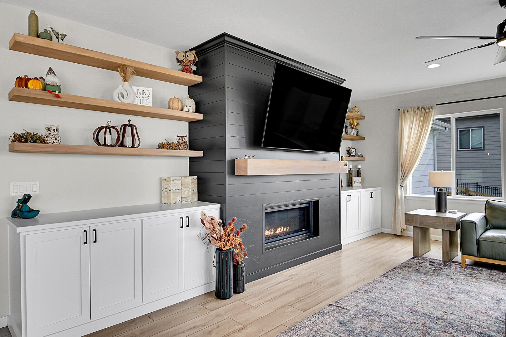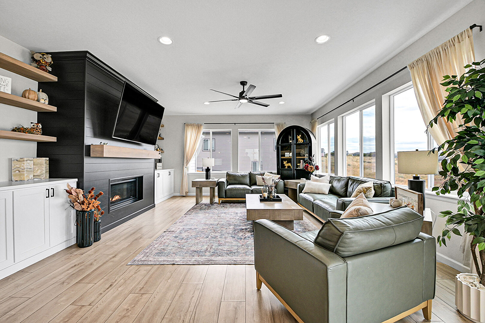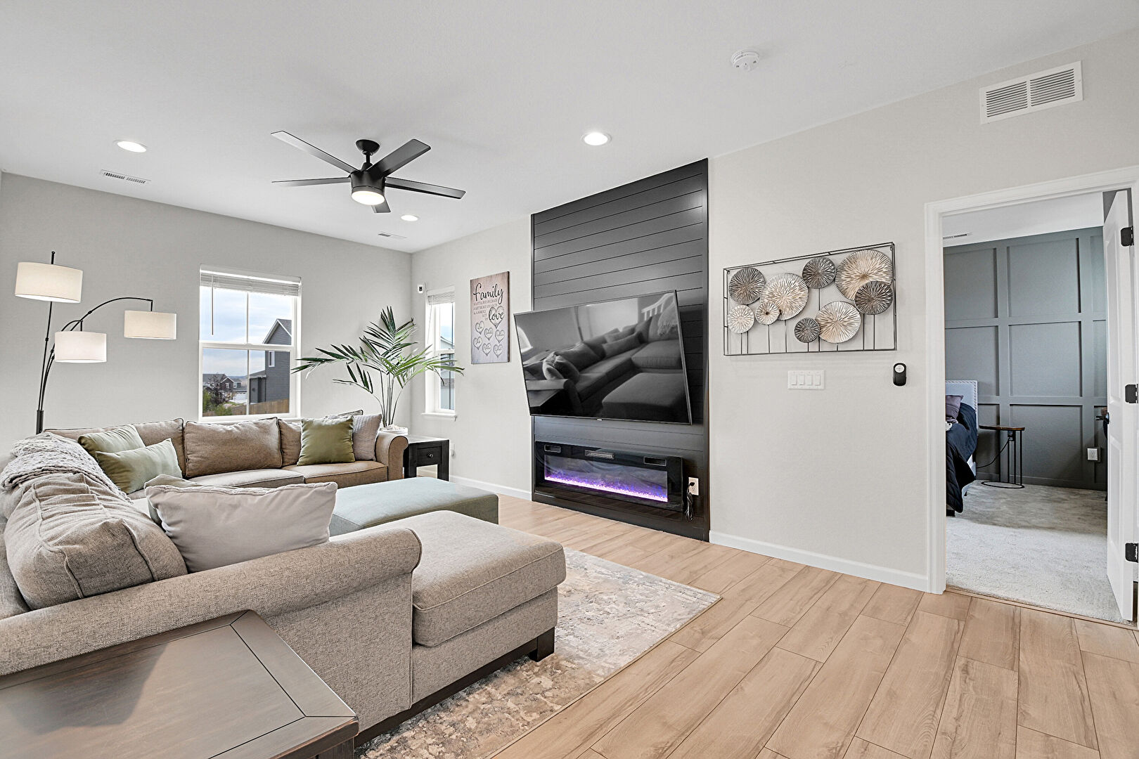 Baseboards Wall, Ceiling Fan, Drywall, Fireplace, Natural Light, Recessed Lighting, Vent, Wood Finish Floor, Ceiling Fan, Drywall, Fireplace, Recessed Lighting, Vent, Wood Finish Floor