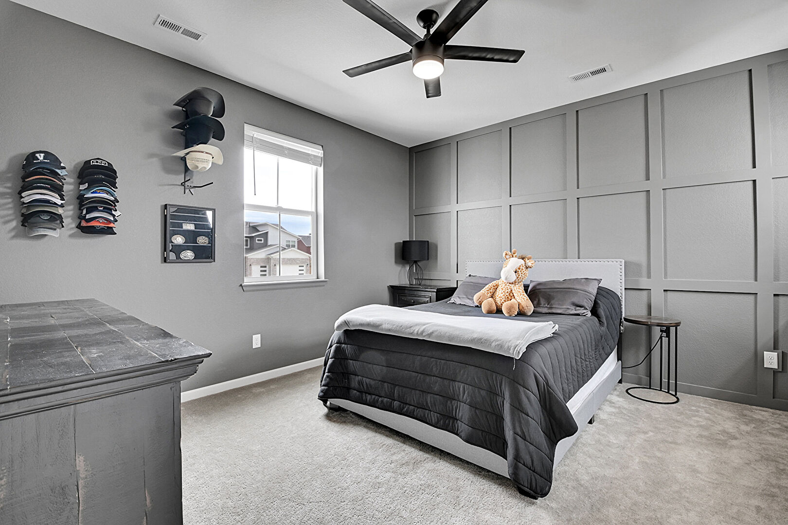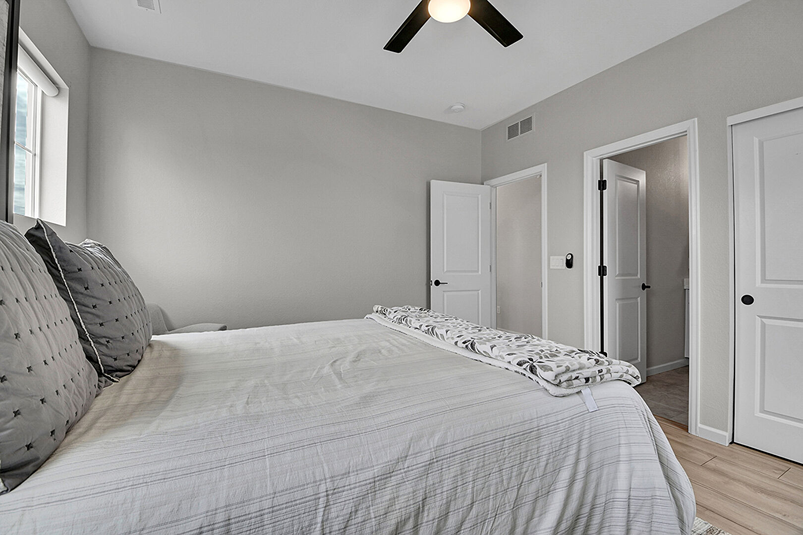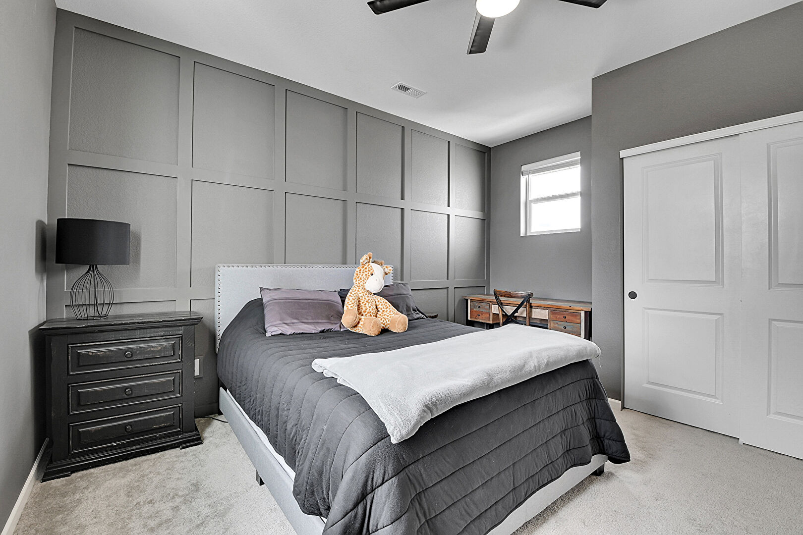 Baseboards Wall, Beamed Ceiling, Ceiling Fan, Closet, Drywall, Natural Light, Paneling Wall, Textured Ceiling, Vent, Wood Finish Floor, Baseboards Wall, Carpet, Ceiling Fan, Natural Light, Vent