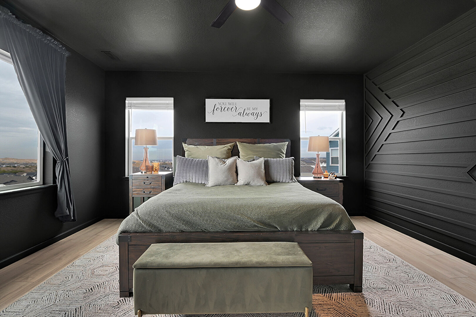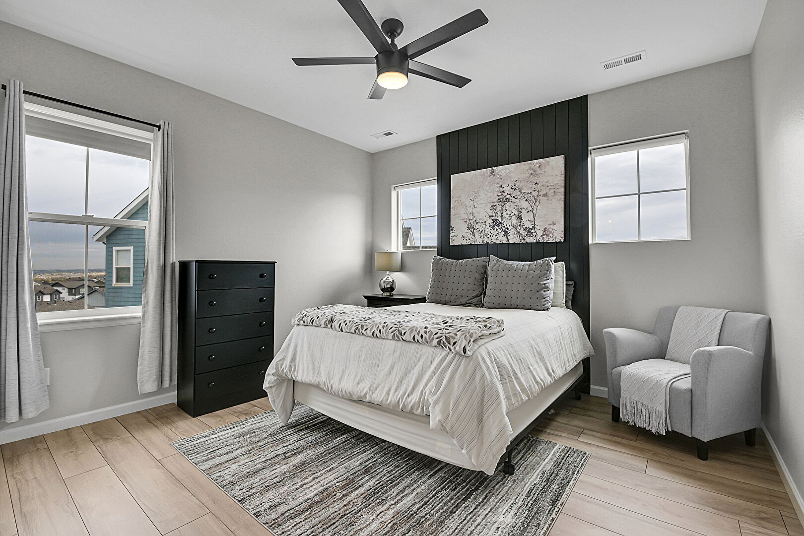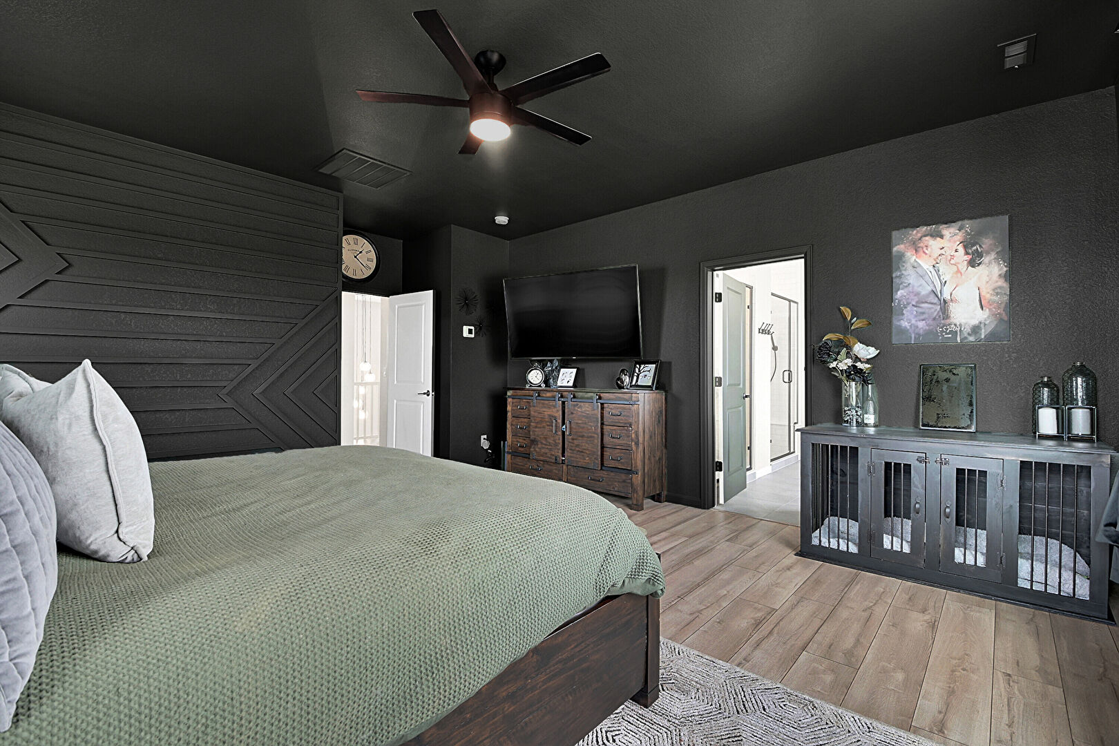 Baseboards Wall, Beamed Ceiling, Ceiling Fan, Closet, Drywall, Natural Light, Paneling Wall, Textured Ceiling, Vent, Wood Finish Floor, Baseboards Wall, Carpet, Ceiling Fan, Natural Light, Vent