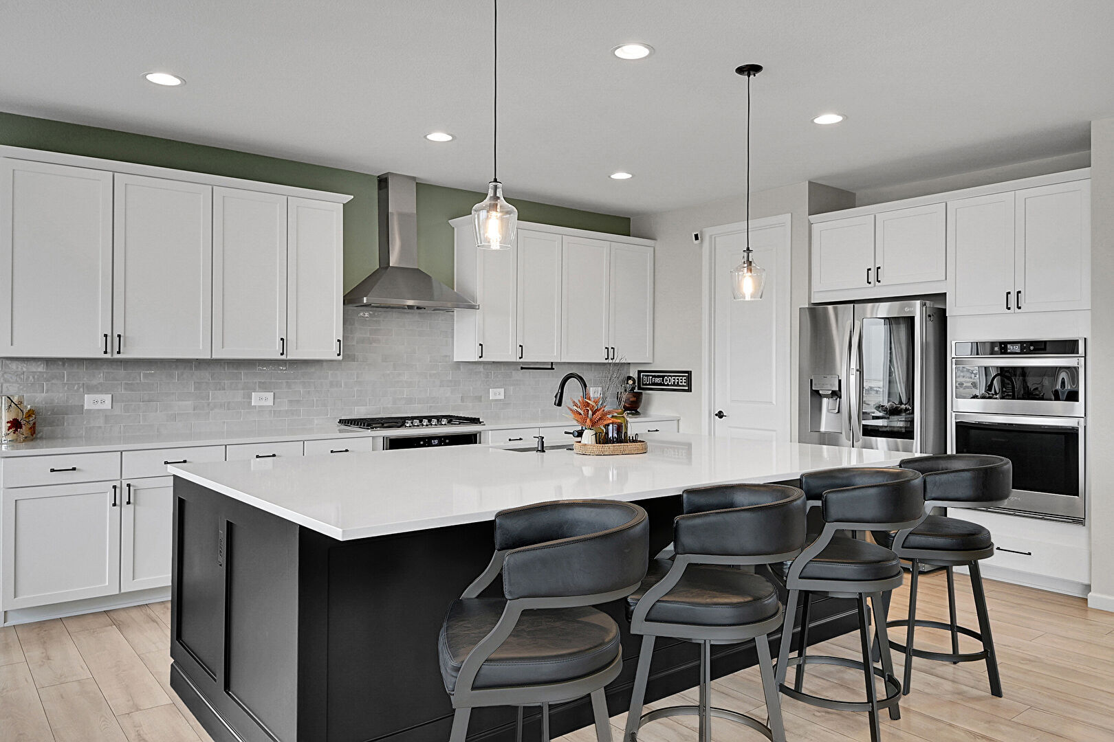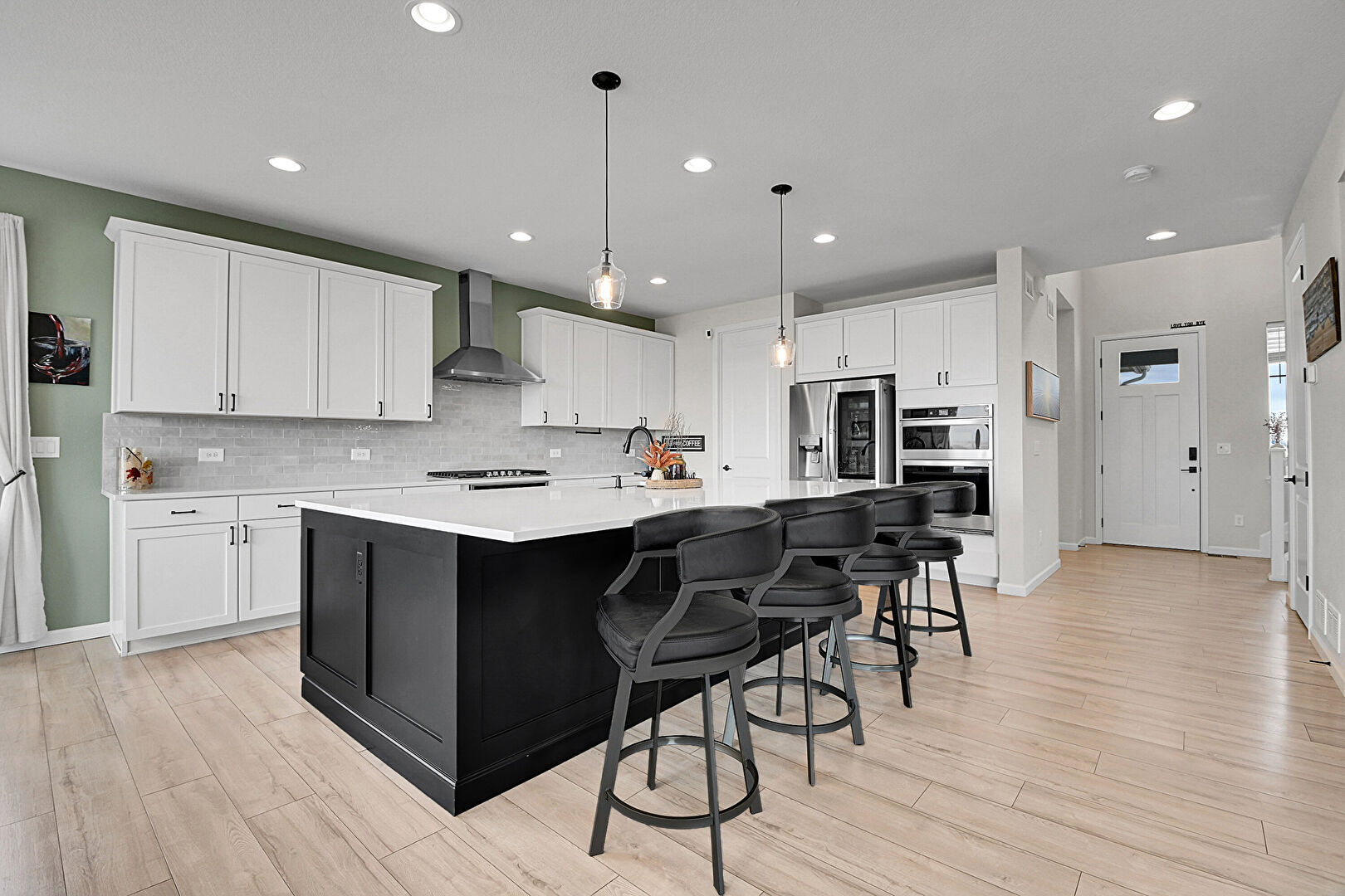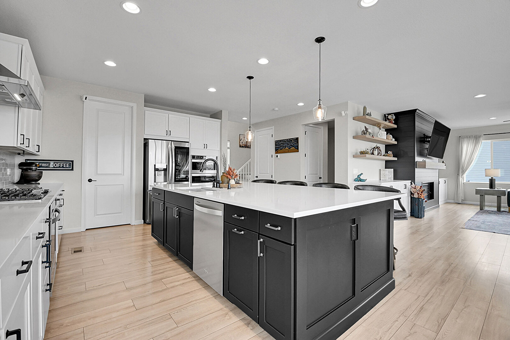 Baseboards Wall, Black Cabinets, Ceiling Fan, Crown Molding Cabinets, Double Oven, Drywall, Fireplace, Gray Cabinets, Kitchen Bar, Kitchen Island, L Shaped Kitchen, Medium Brown Cabinets, Natural Light, Notable Chandelier, Opens To Living Area, Pendant Lighting, Recessed Lighting, Security Camera, Shaker Cabinets, Smoke Carbon Monoxide Detector, Stone Countertops, Vent, Wood Finish Floor, Black Cabinets, Drywall, Gray Cabinets, Natural Light, Notable Chandelier, Pendant Lighting, Wood Finish Floor