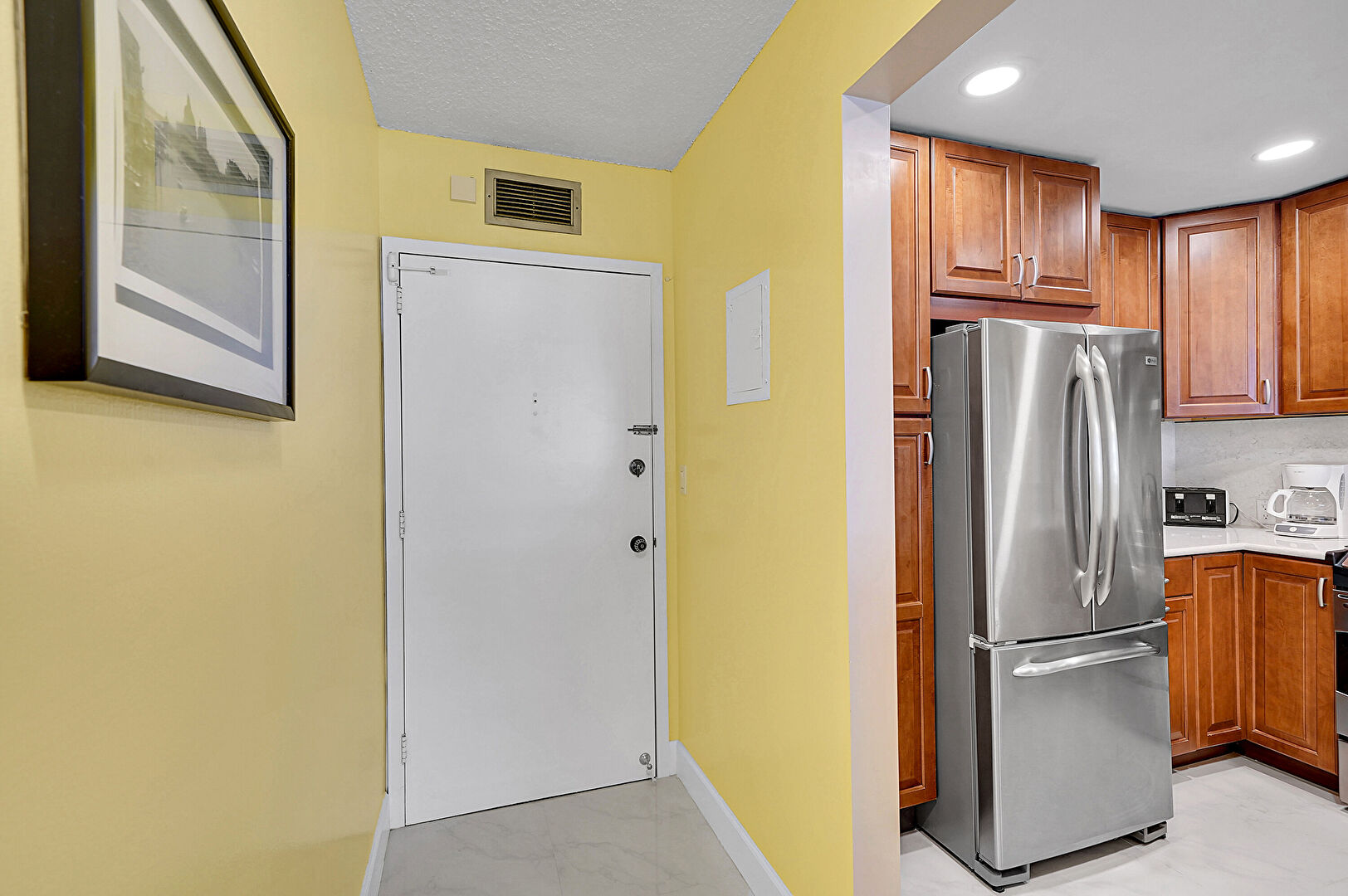 Baseboards Wall, Drywall, Marble Finish Floor, Medium Brown Cabinets, Recessed Lighting, Stone Countertops, Textured Ceiling, Toaster, Vent, Raised Cabinets