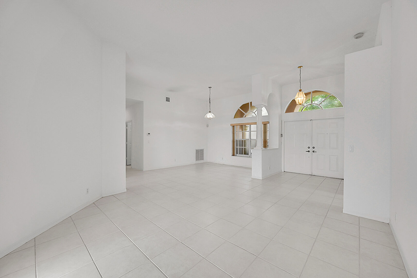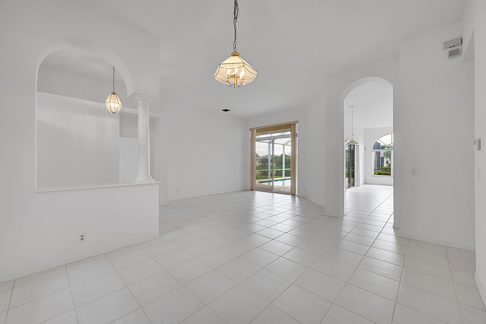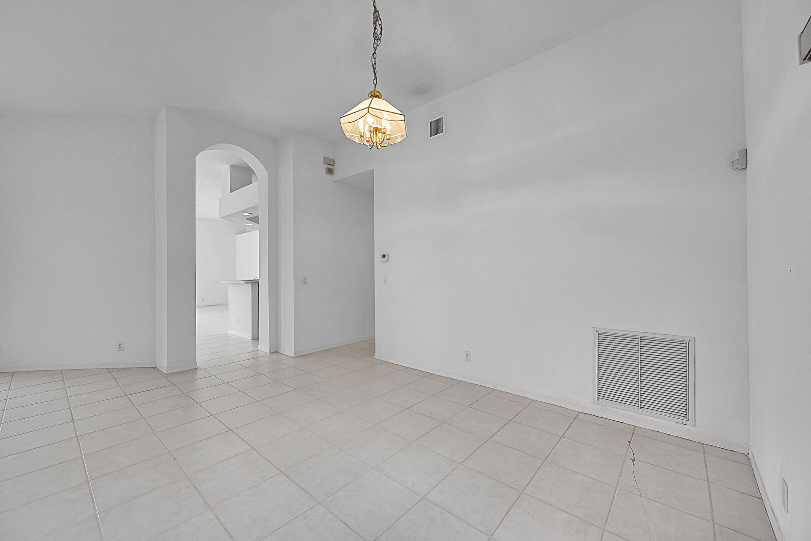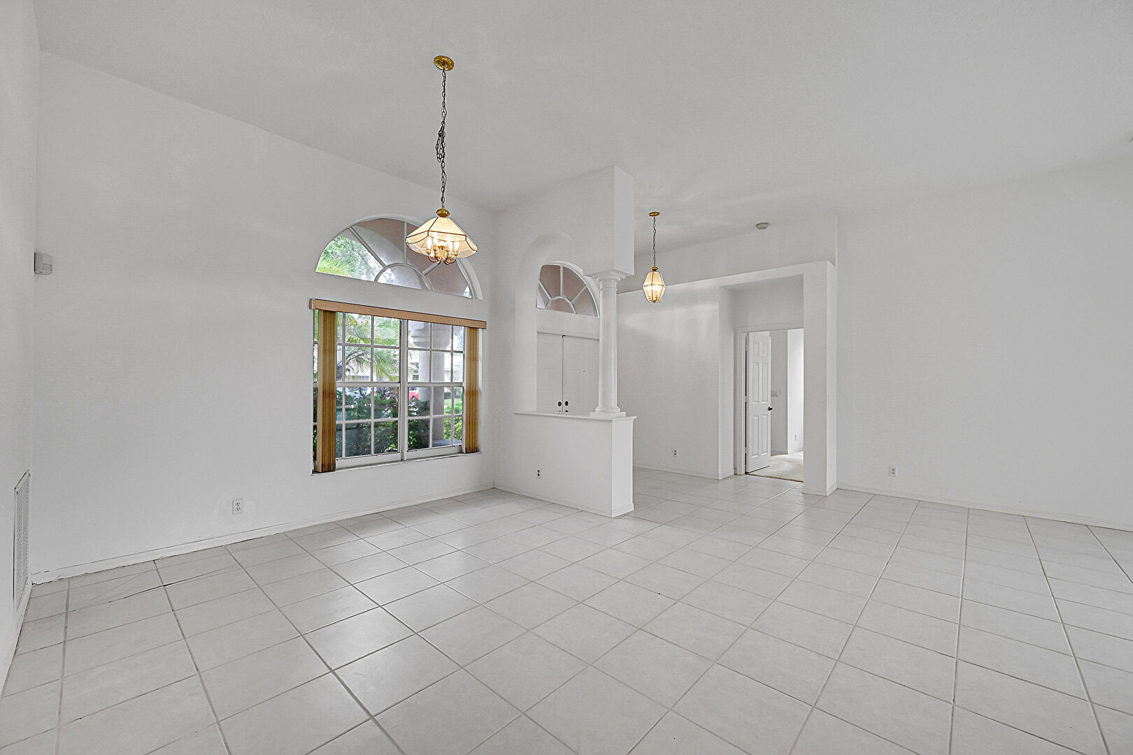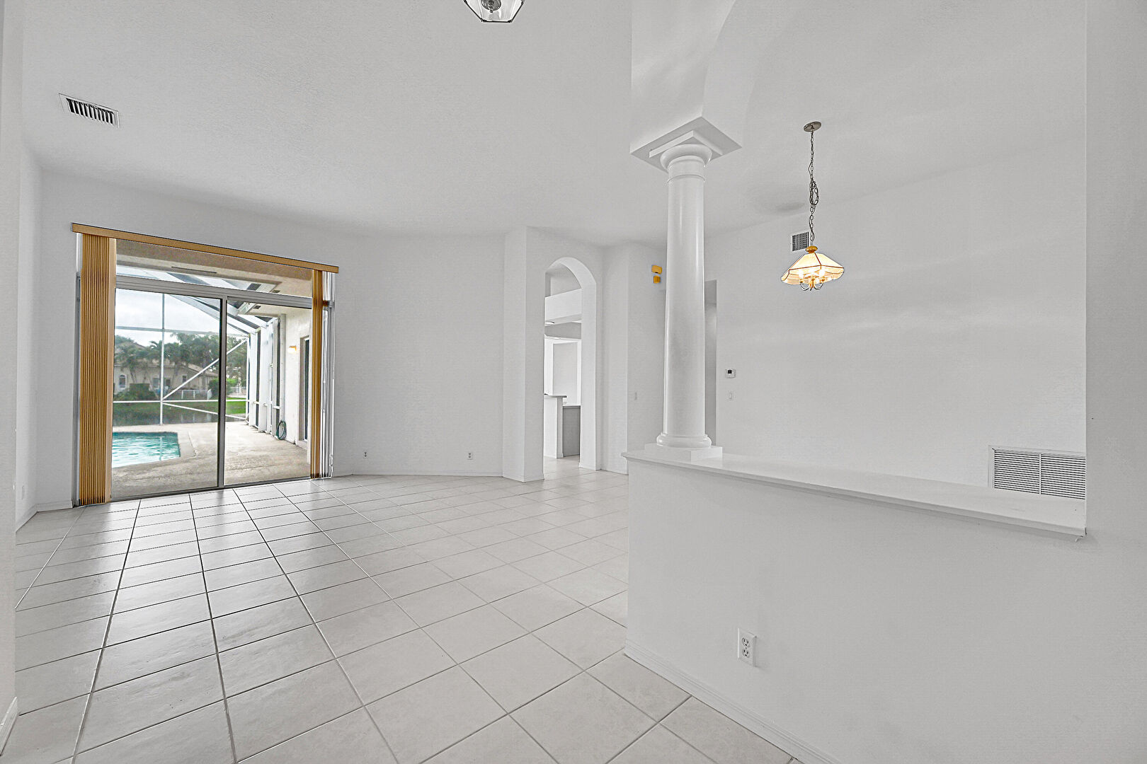 Arched Walkways,  Baseboards Wall,  Drywall,  Natural Light,  Notable Chandelier,  Tile Floor,  Vent, Decorative Columns, Drywall, Notable Chandelier