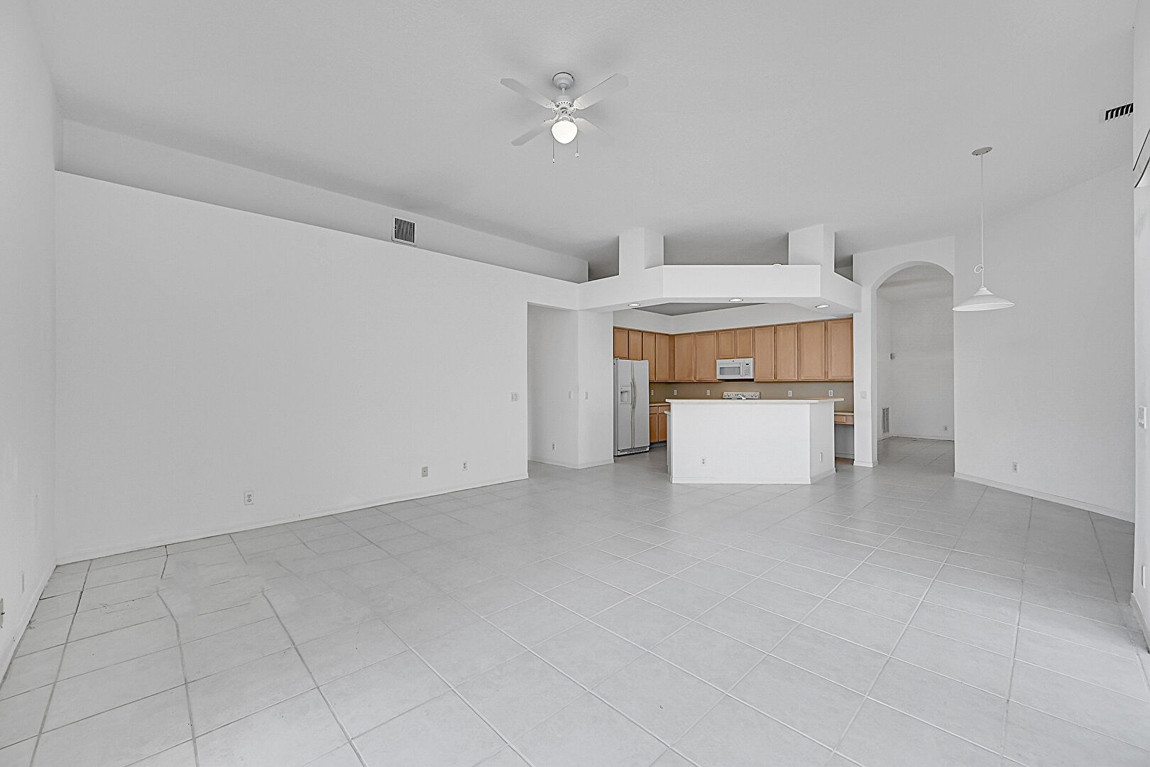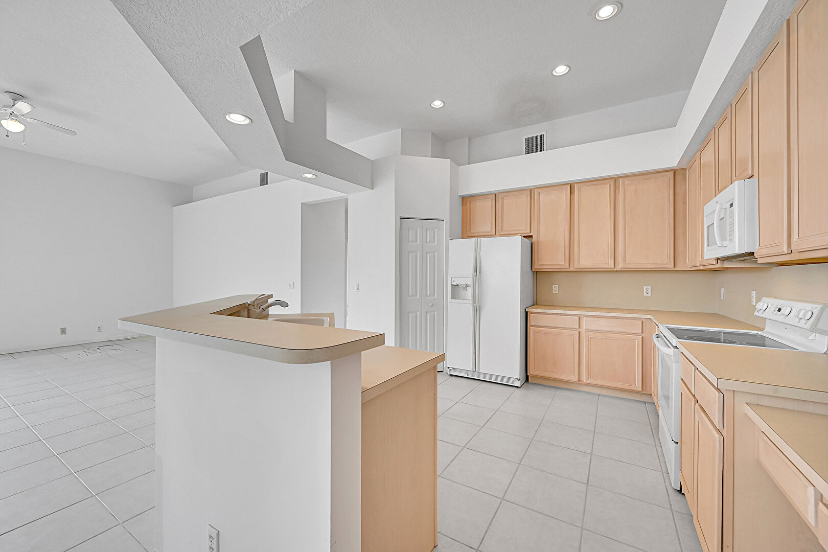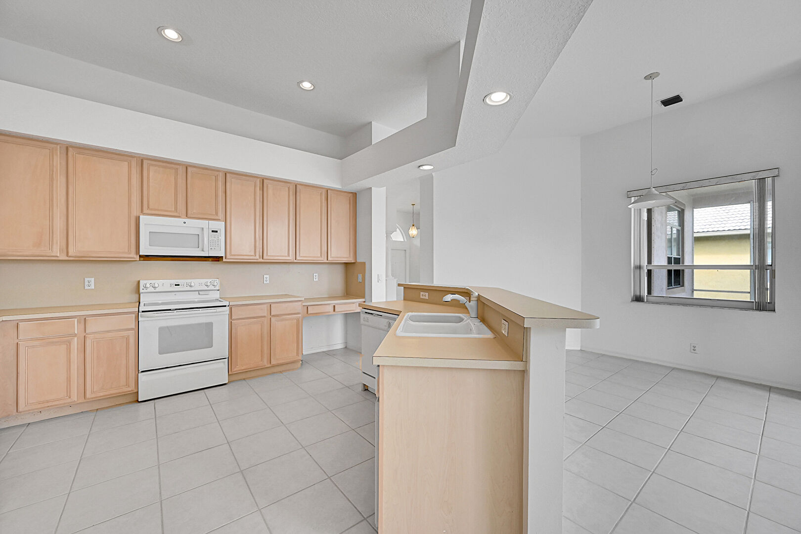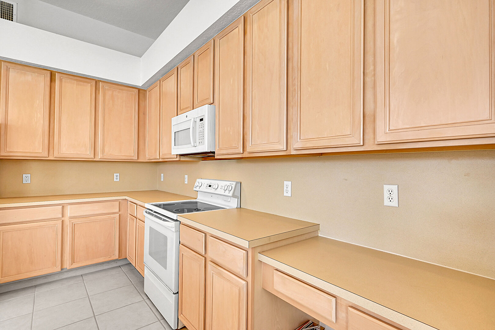 Baseboards Wall,  Ceiling Fan,  Drywall,  High Ceiling,  Kitchen Bar,  Kitchen Island,  L Shaped Kitchen,  Natural Light,  Opens To Living Area,  Recessed Lighting,  Shaker Cabinets,  Textured Ceiling,  Tile Floor,  Vent, Natural Light, Pendant Lighting, Shaker Cabinets, Vent