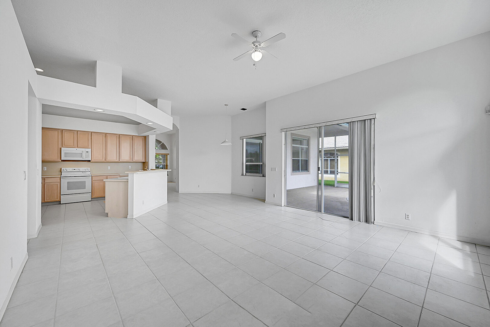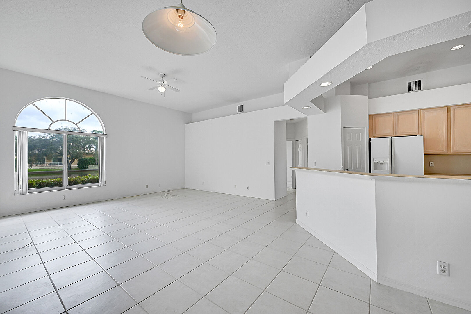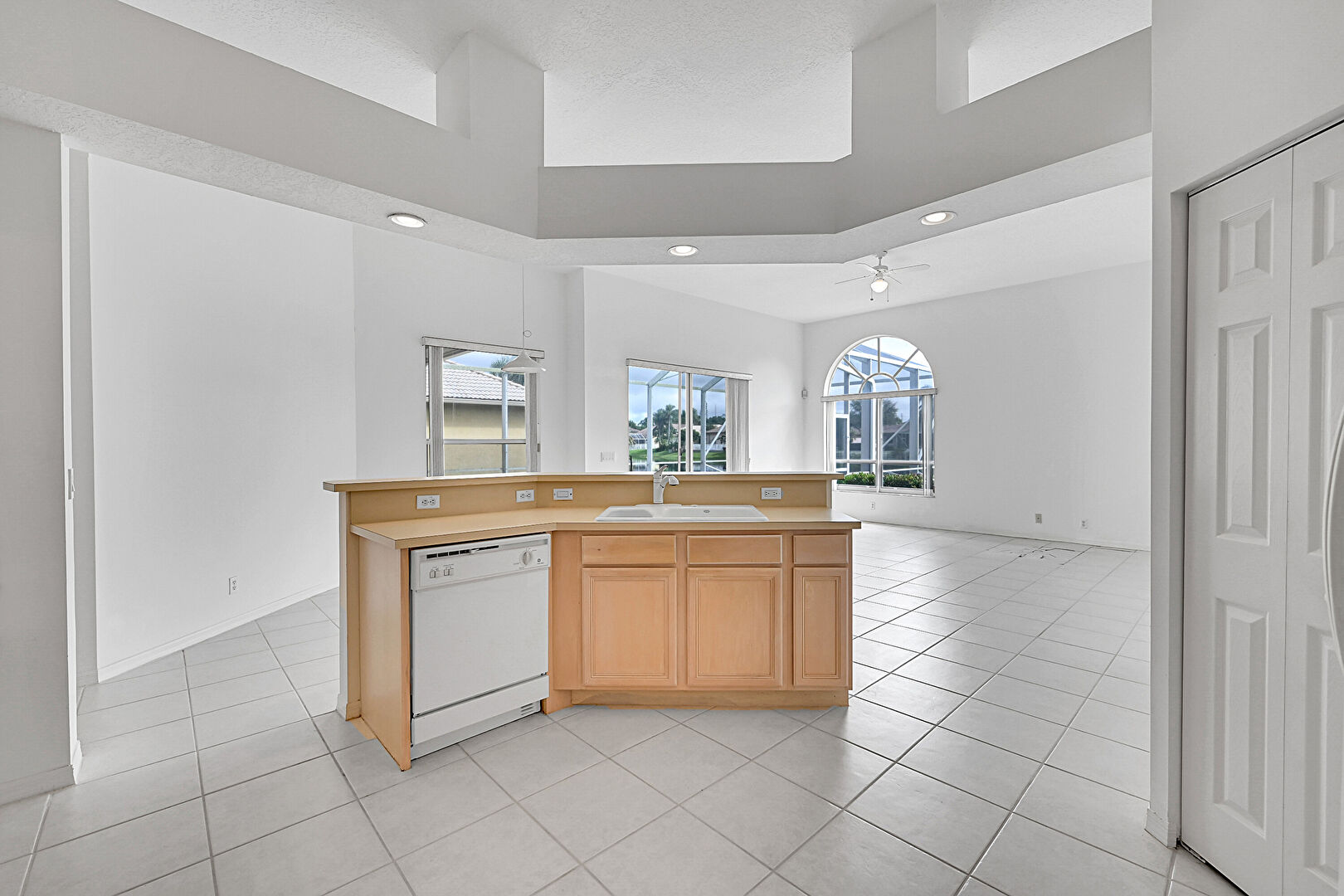 Arched Walkways,  Baseboards Wall,  Ceiling Fan,  Drywall,  High Ceiling,  L Shaped Kitchen,  Natural Light,  Recessed Lighting,  Sunroom,  Tile Floor,  Vent, Baseboards Wall, Ceiling Fan, Drywall, Natural Light, Tile Floor