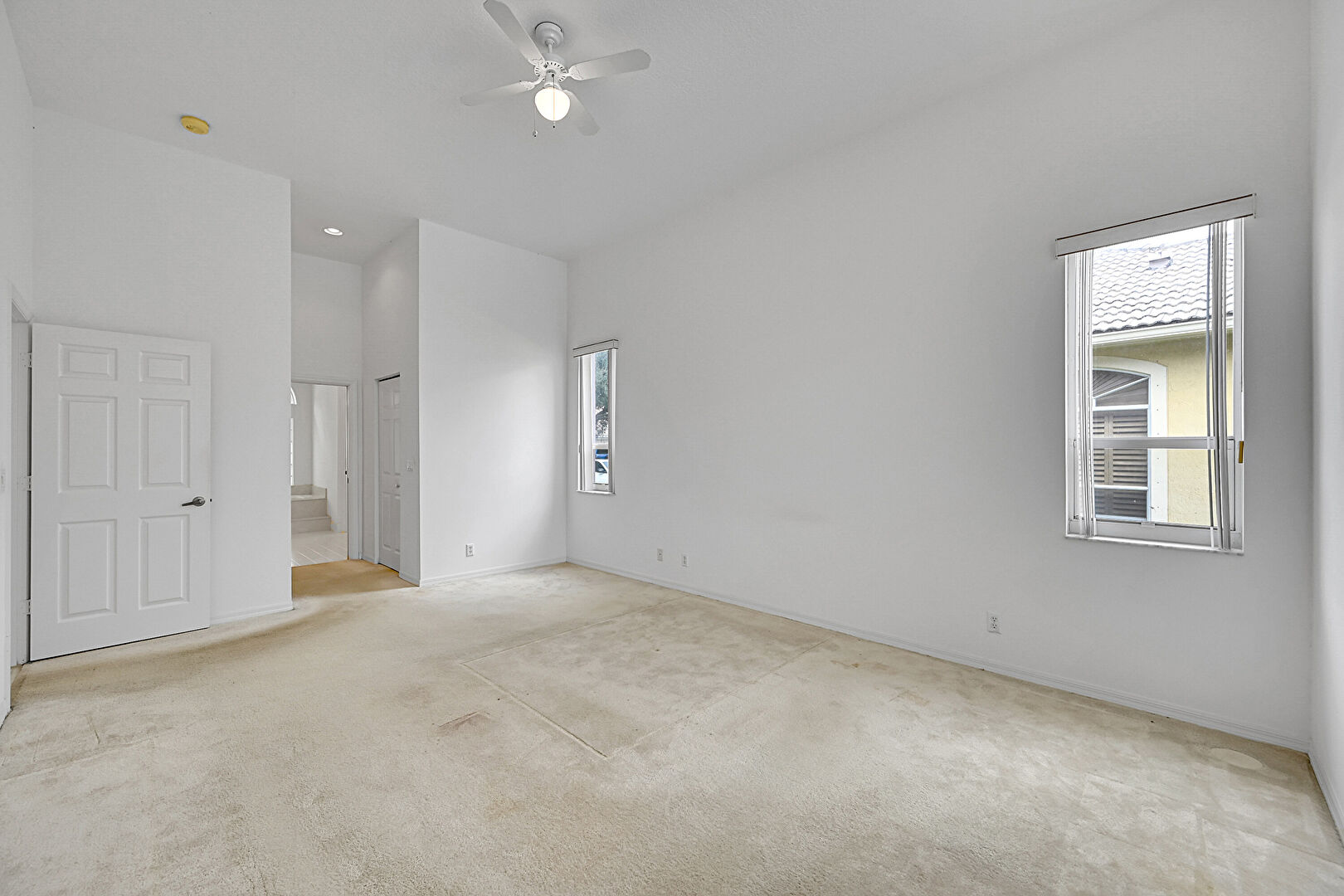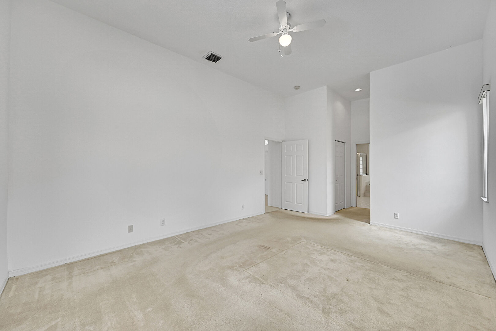 Baseboards Wall,  Carpet,  Ceiling Fan,  Closet,  Drywall,  Ensuite Bathroom,  High Ceiling,  Natural Light,  Tile Floor,  Vent, Carpet, Ceiling Fan, Recessed Lighting, Vaulted Ceiling