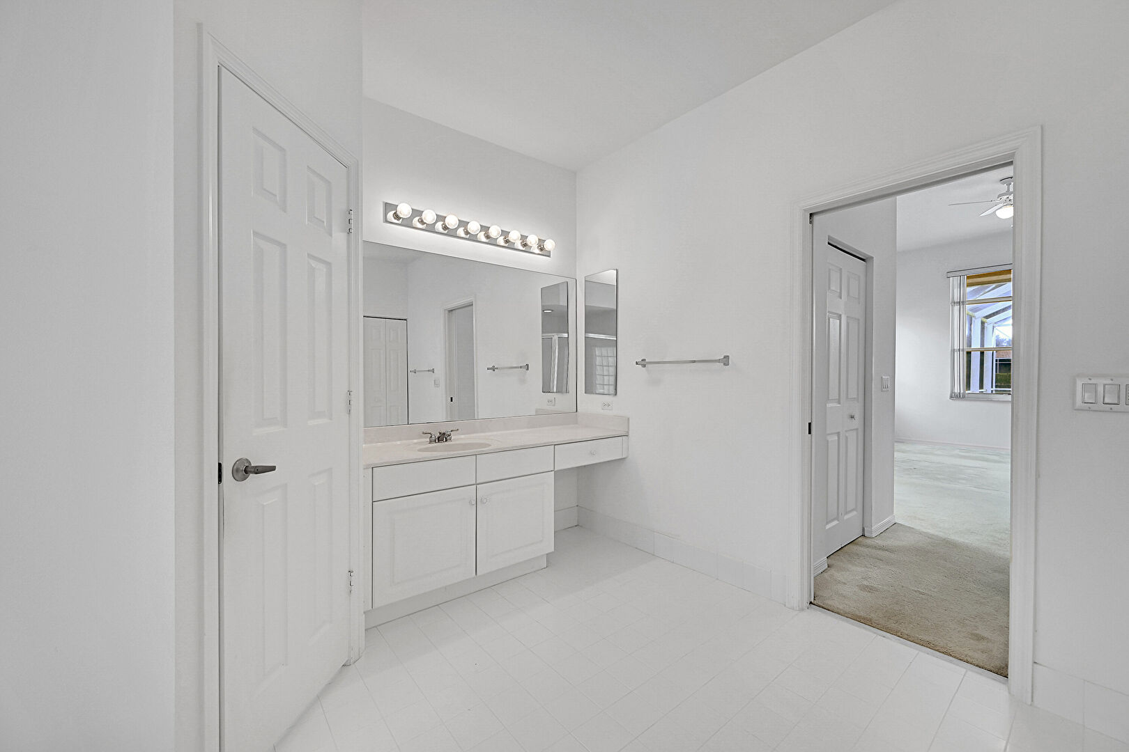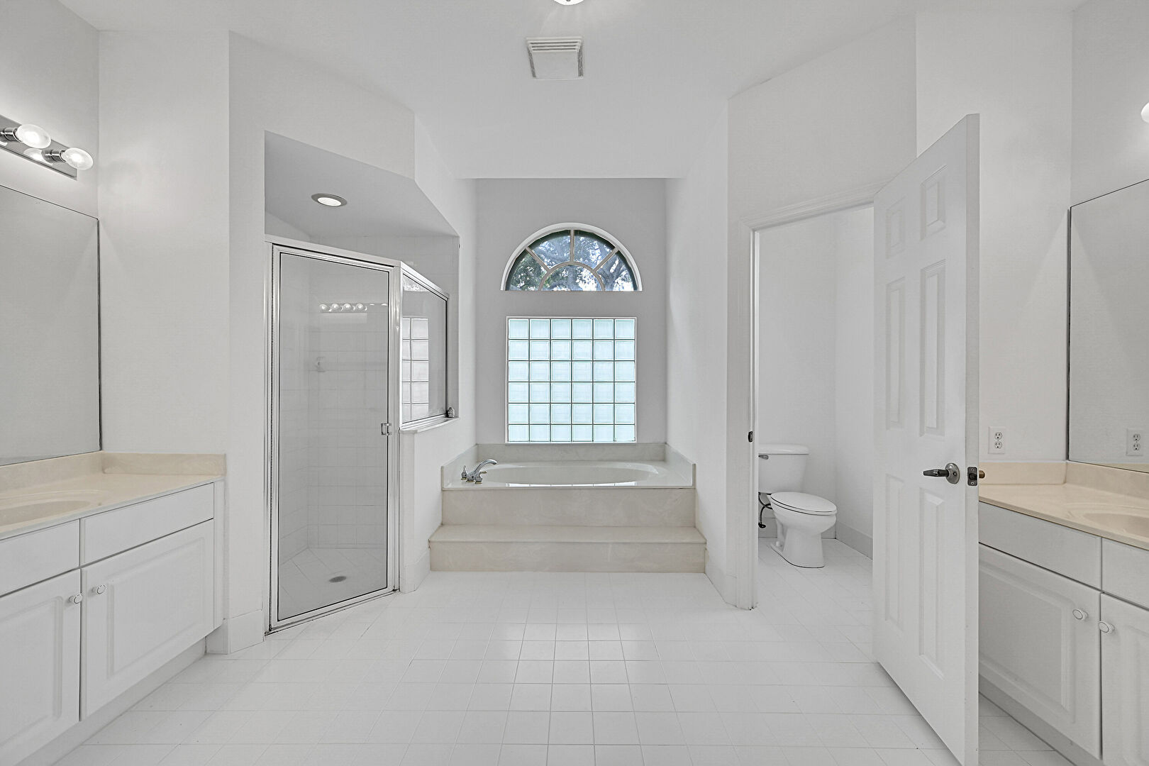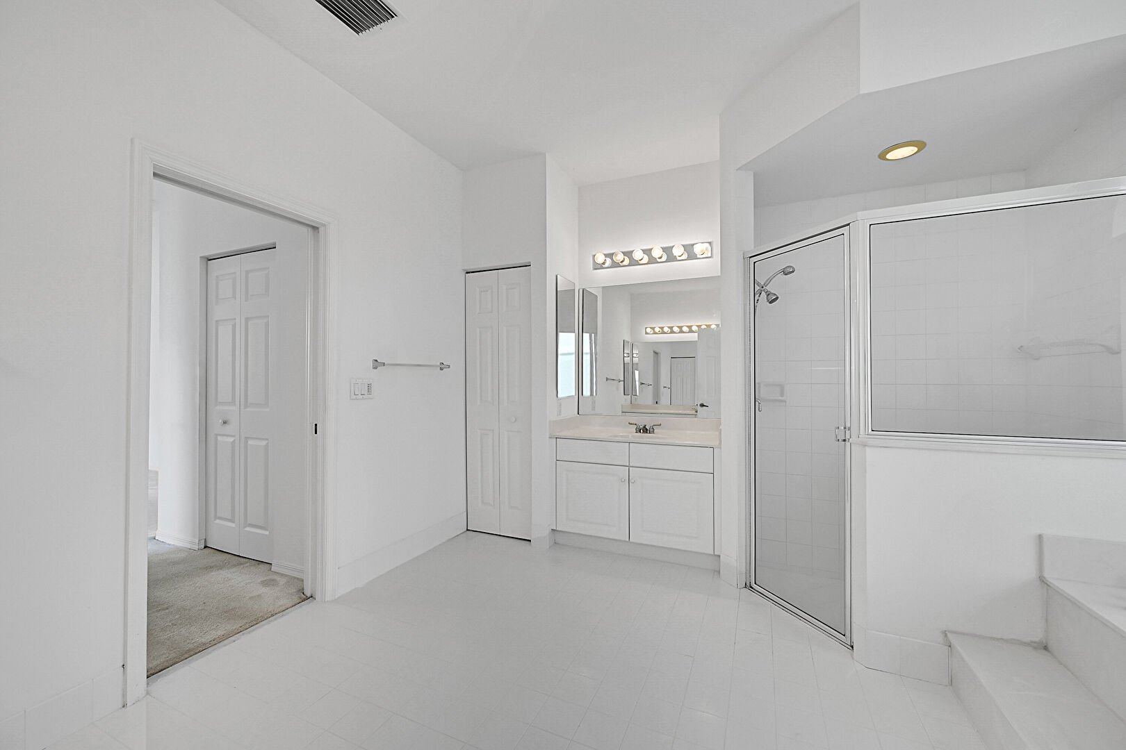 Baseboards Wall,  Carpet,  Closet,  Drywall,  Full Bathroom,  Natural Light,  Recessed Lighting,  Tile Floor,  Vanity,  Vent,  Vinyl Floor,  Water Closet, Closet, Two Single Vanities, Vanity