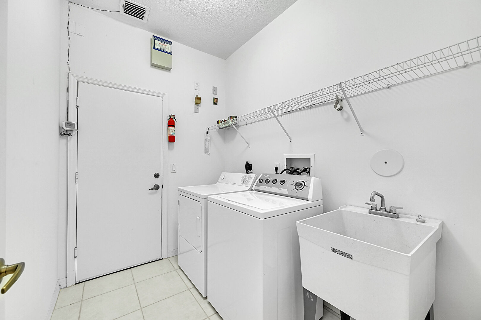 Drywall,  Fire Extinguisher,  Laundry,  Textured Ceiling,  Tile Floor,  Vent,  Washer Hookup, Electric Dryer Hookup