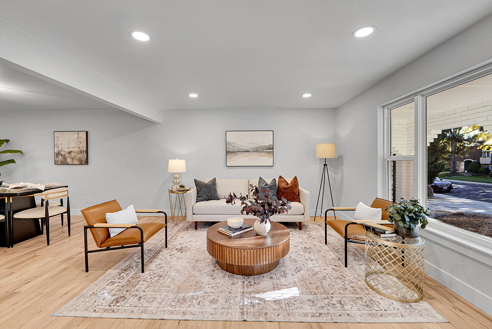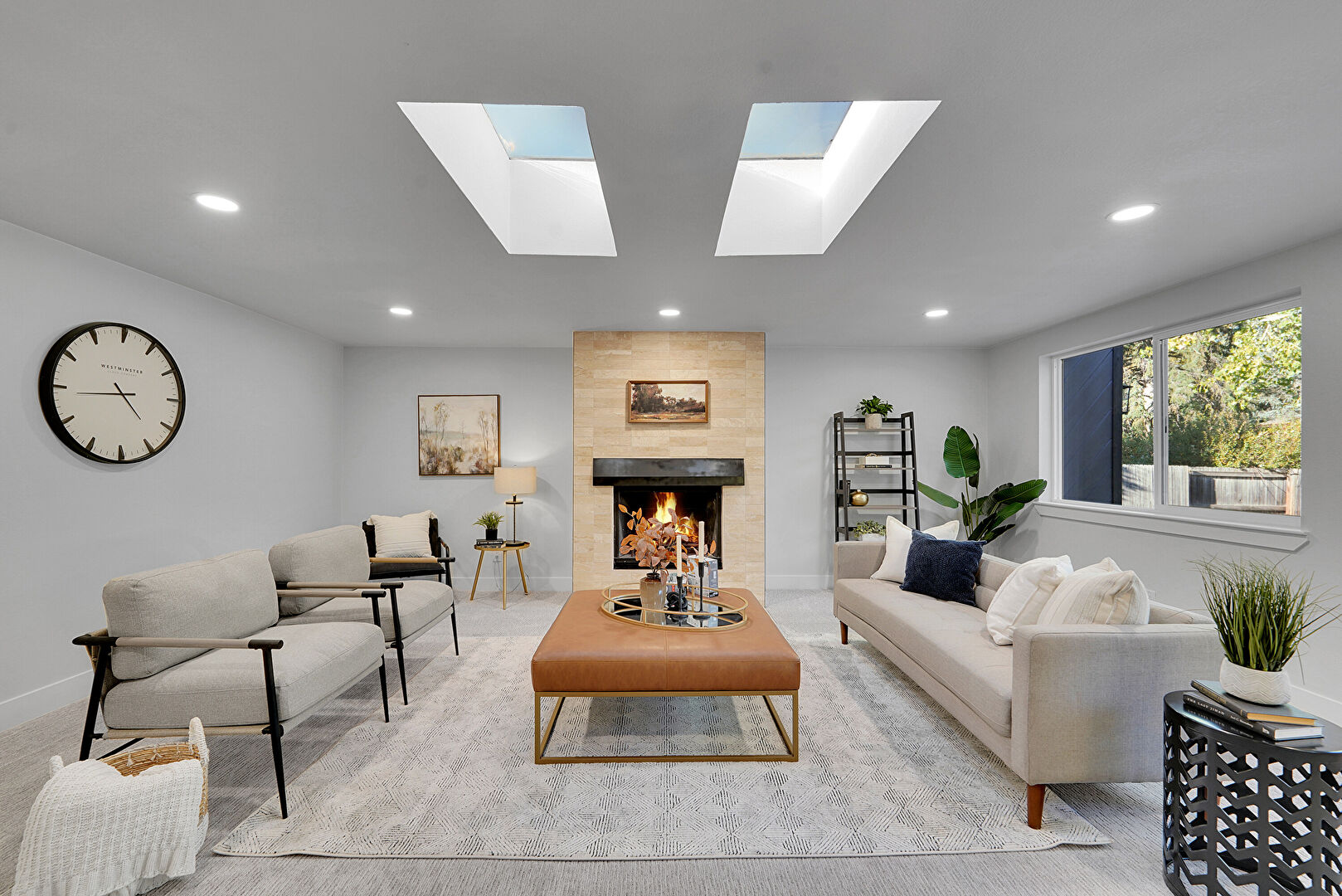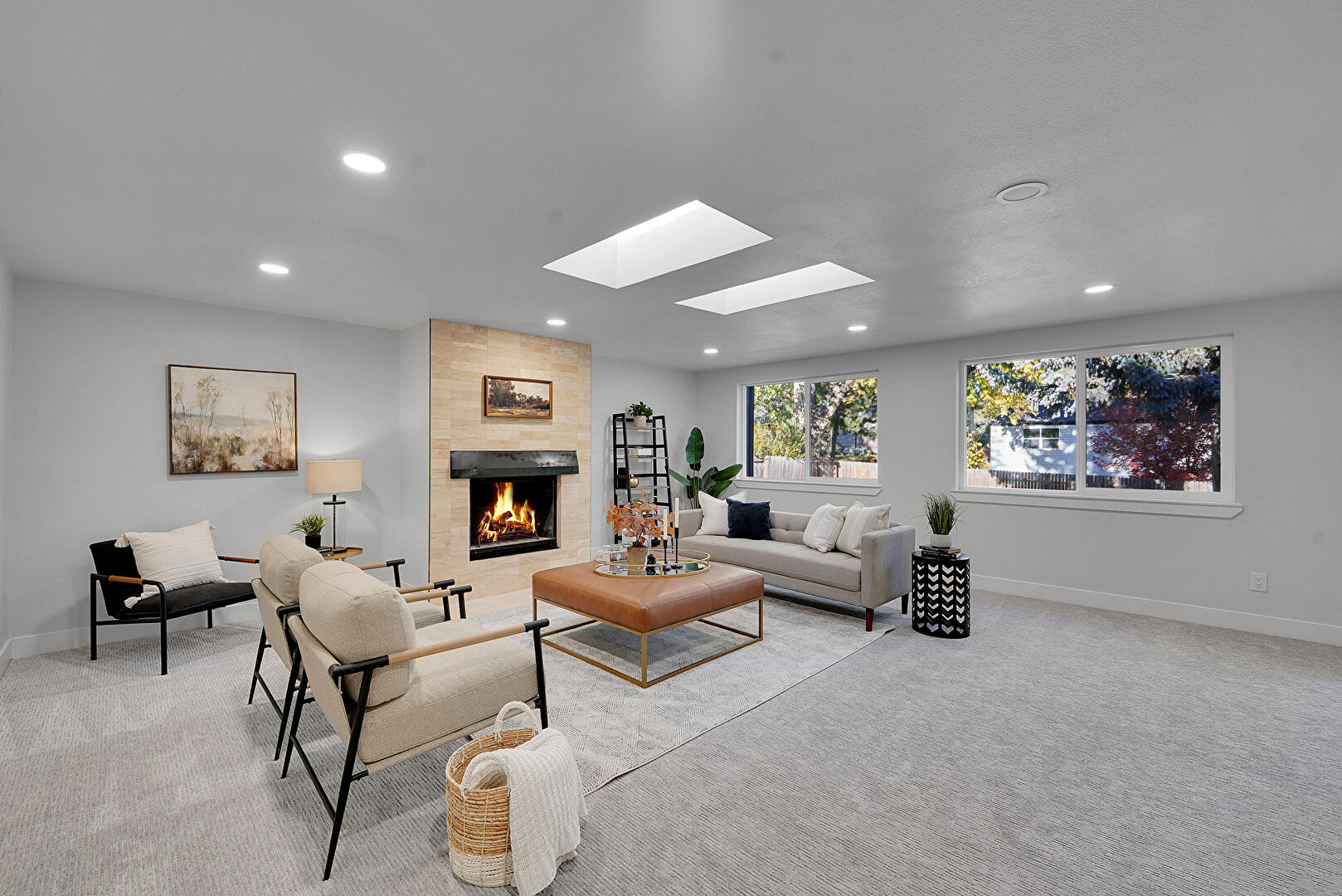 Baseboards Wall,  Carpet,  Drywall,  Fireplace,  Natural Light,  Recessed Lighting,  Skylight,  Wood Finish Floor, Baseboards Wall, Beamed Ceiling, Carpet, Natural Light