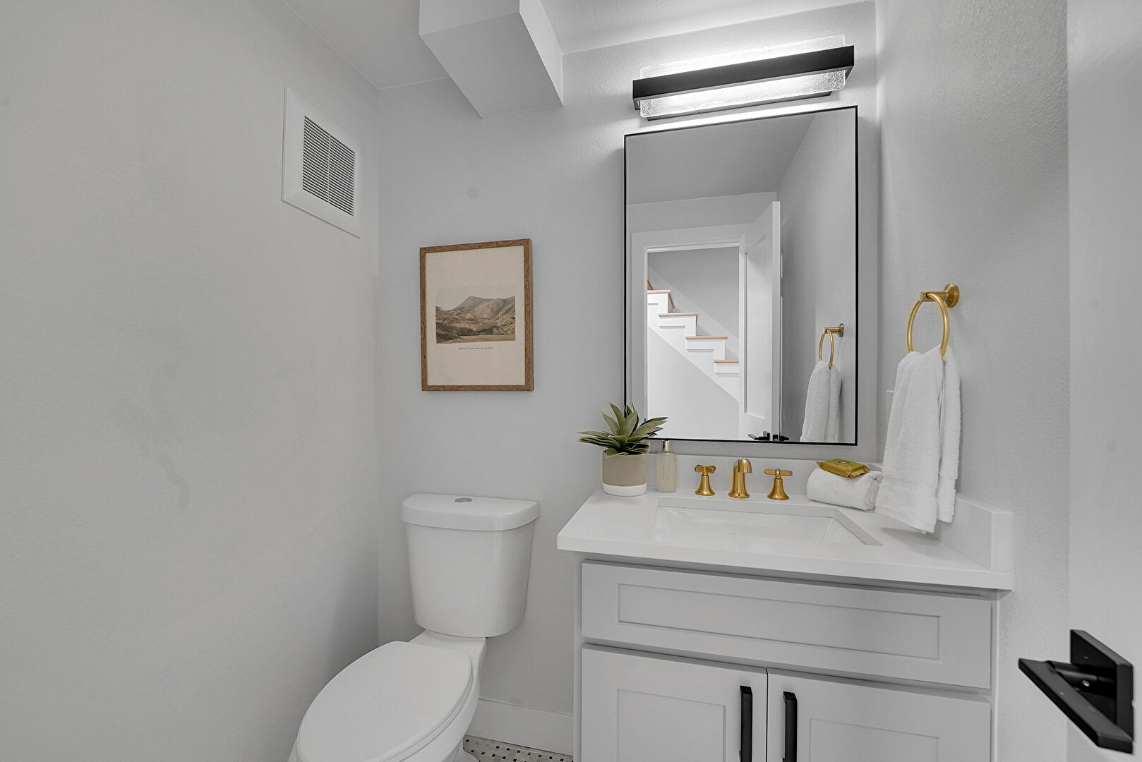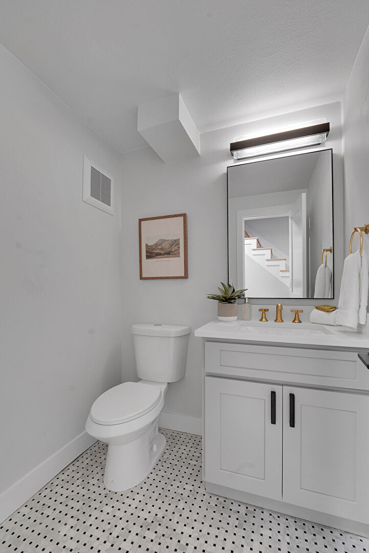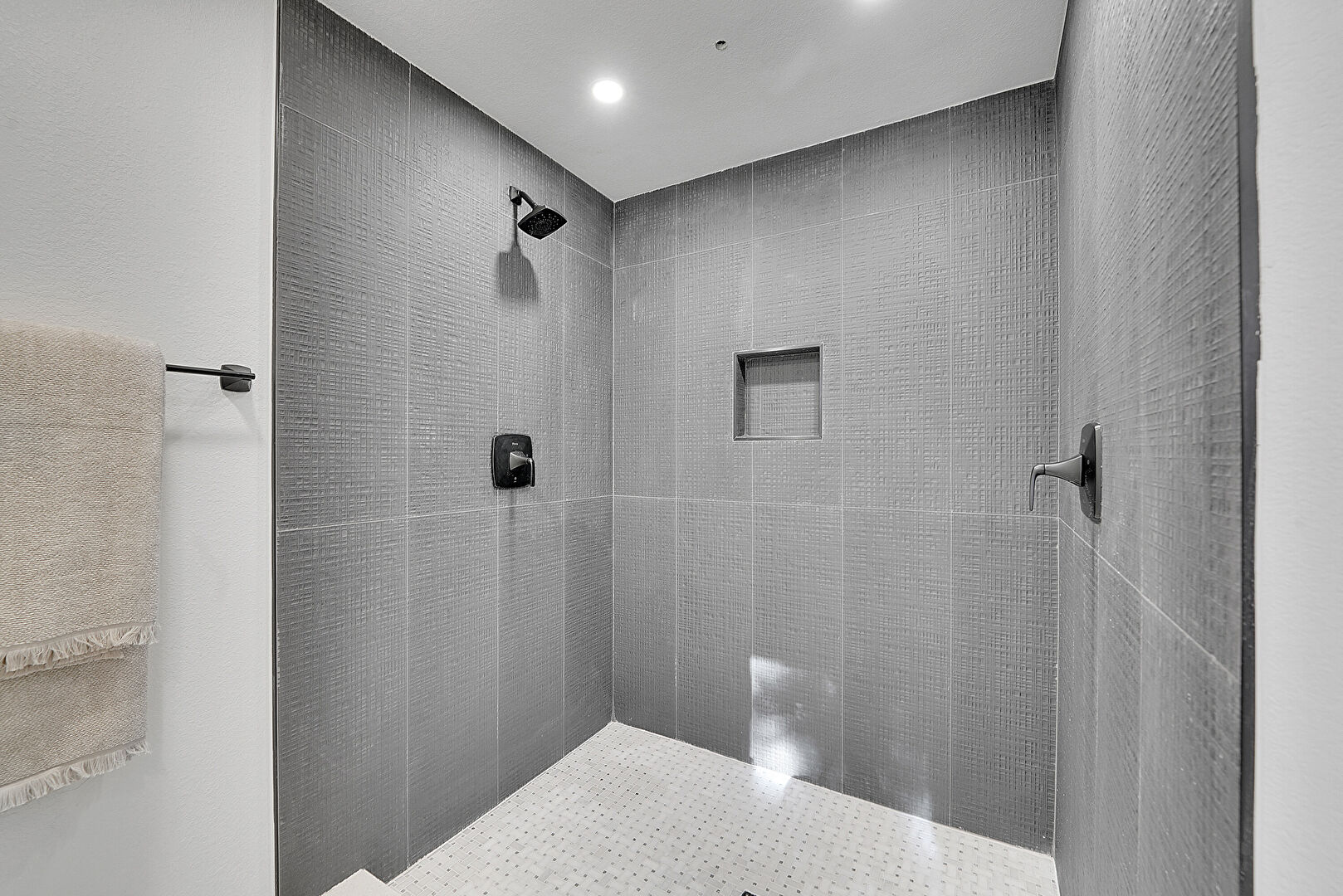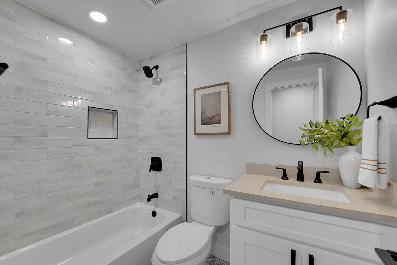 Baseboards Wall,  Combined Bath Shower,  Drywall,  Full Bathroom,  Half Bathroom,  Recessed Lighting,  Tile Floor,  Vanity,  Vent, Baseboards Wall, Double Vanity, Drywall, Textured Ceiling, Vanity