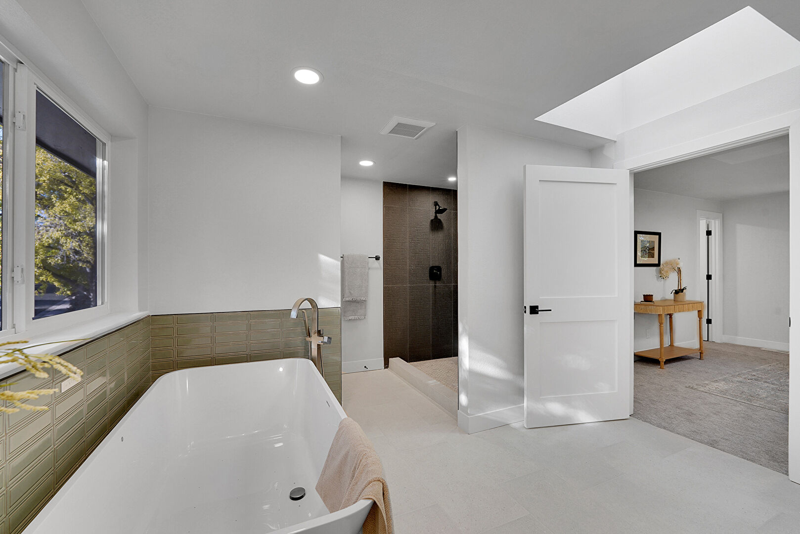 Baseboards Wall,  Carpet,  Double Vanity,  Drywall,  Full Bathroom,  Natural Light,  Recessed Lighting,  Tile Floor,  Tile Wall,  Vent,  Wainscot Wall, Baseboards Wall, Drywall, Full Bathroom