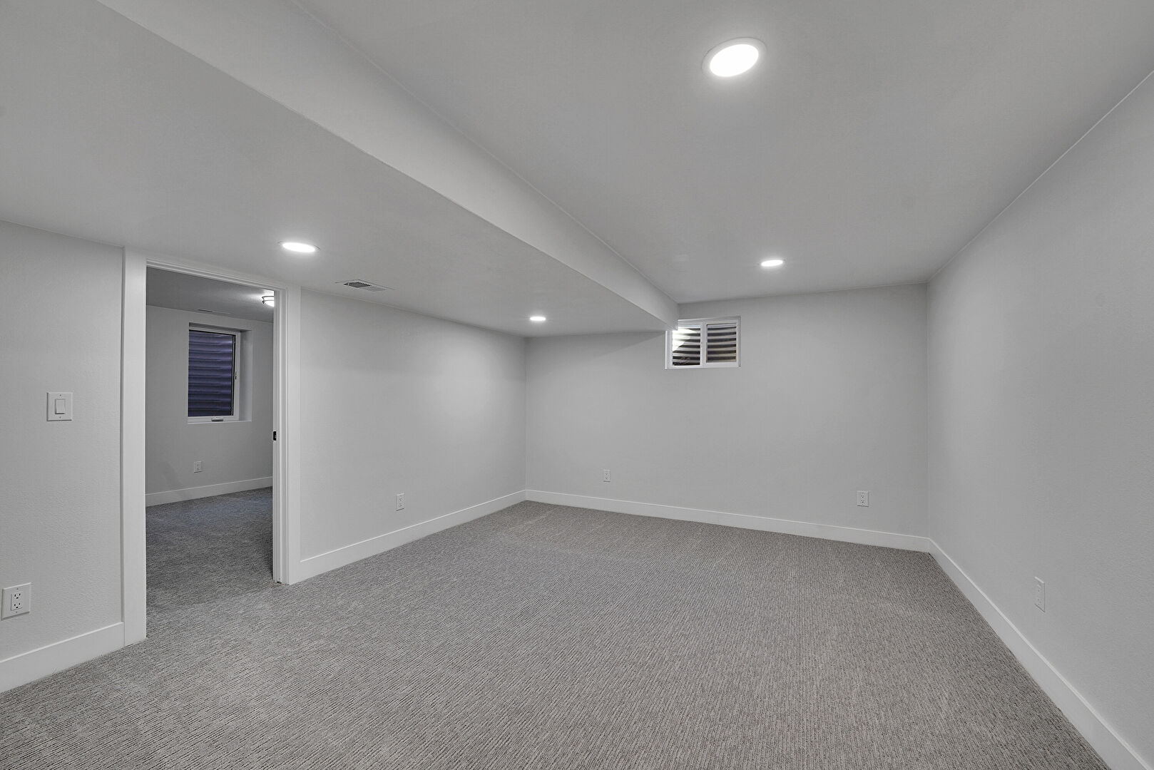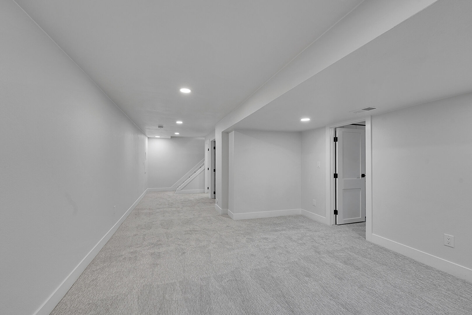 Baseboards Wall,  Basement,  Carpet,  Drywall,  Recessed Lighting,  Vent, Basement, Vent