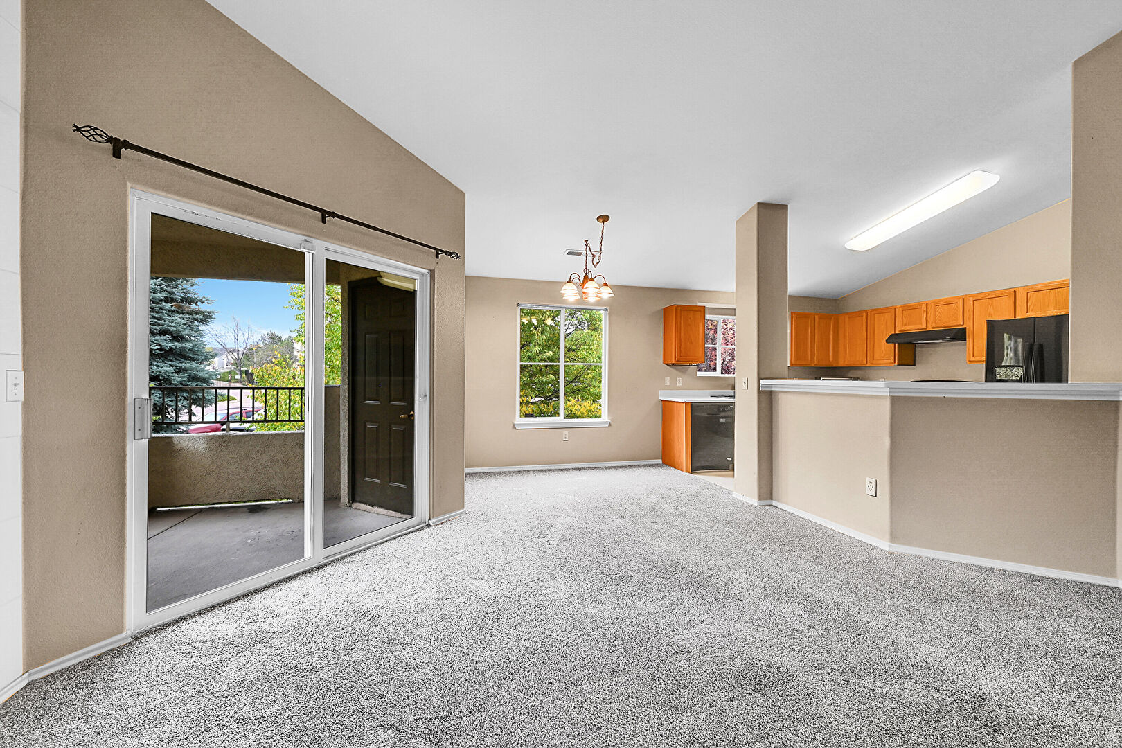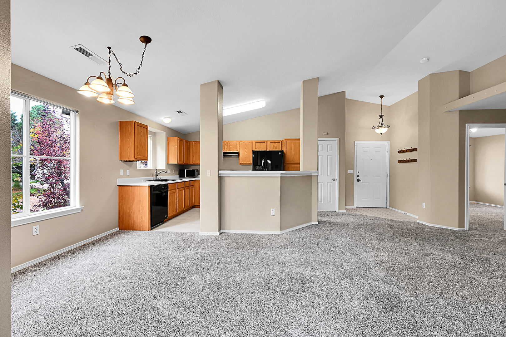 Baseboards Wall, Carpet, Drywall, Medium Brown Cabinets, Natural Light, Notable Chandelier, Opens To Living Area, Pendant Lighting, Shaker Cabinets, Vaulted Ceiling, Vent, Vinyl Floor, Pass Through Window, Vaulted Ceiling, Vent, Vinyl Floor