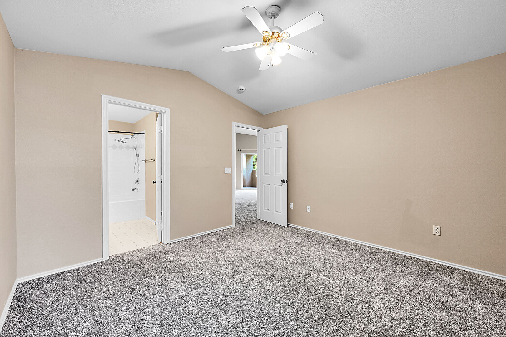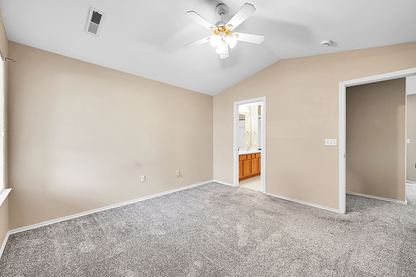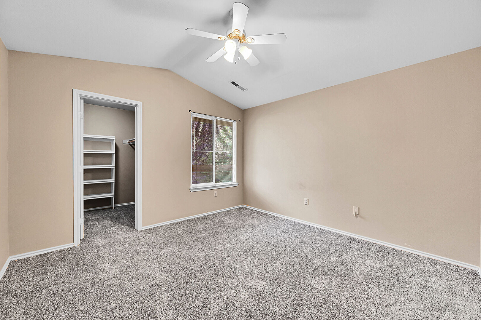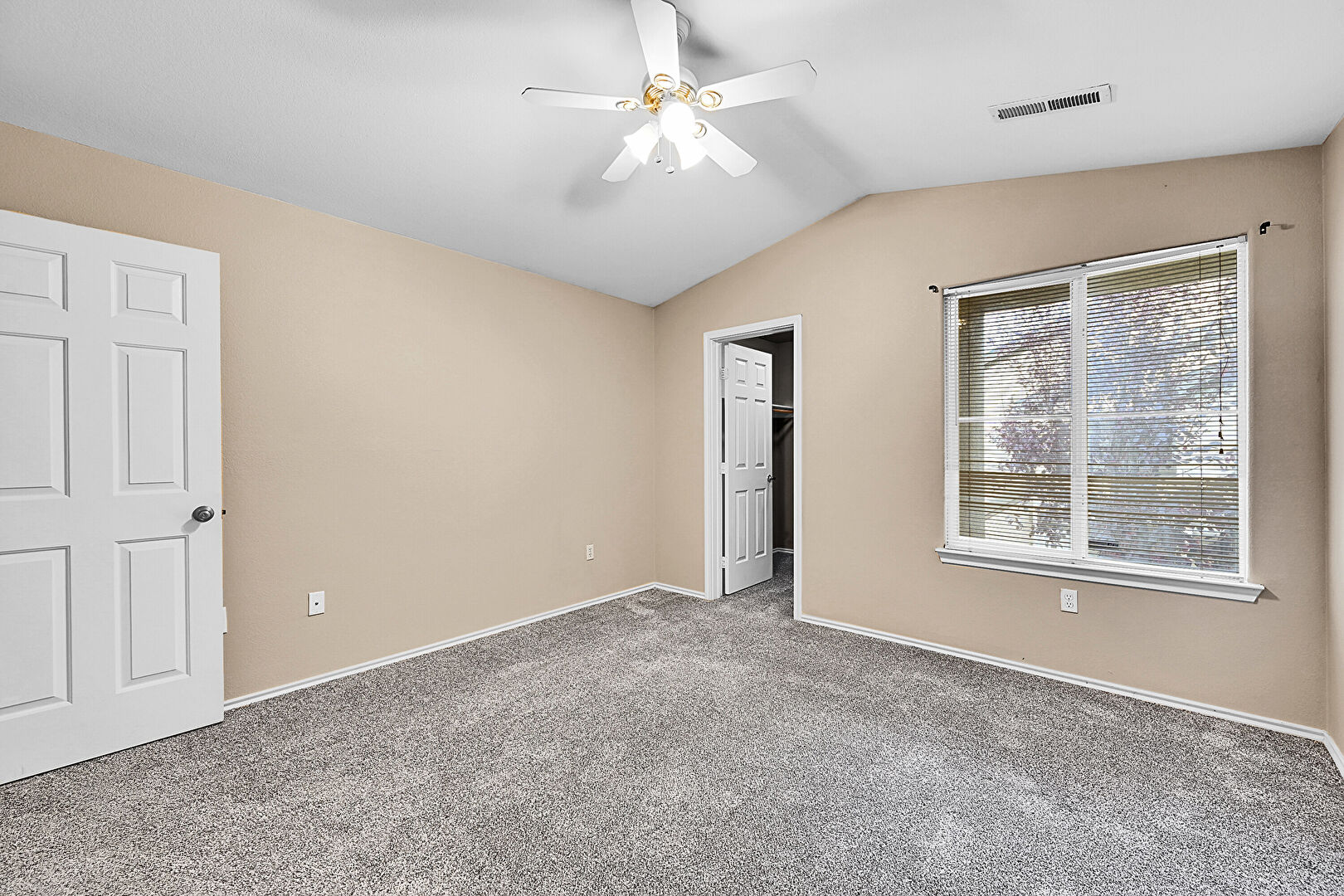 Baseboards Wall, Carpet, Cathedral Ceiling, Ceiling Fan, Drywall, Ensuite Bathroom, Natural Light, Smoke Carbon Monoxide Detector, Vaulted Ceiling, Vent, Walk In Closet, Baseboards Wall, Ceiling Fan, Natural Light