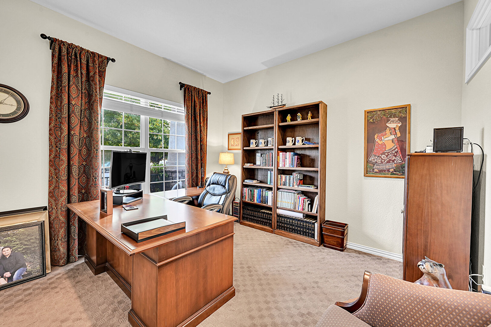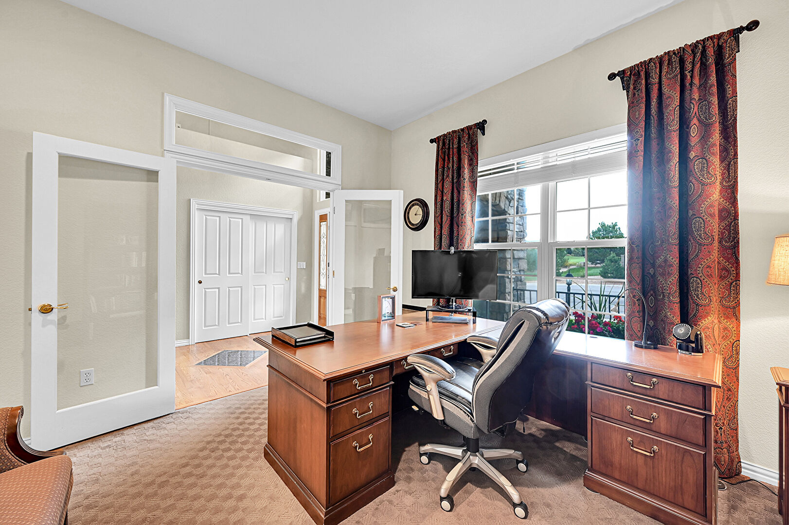 Baseboards Wall, Carpet, Drywall, French Doors, Natural Light, Office Area, Baseboards Wall, Office Area