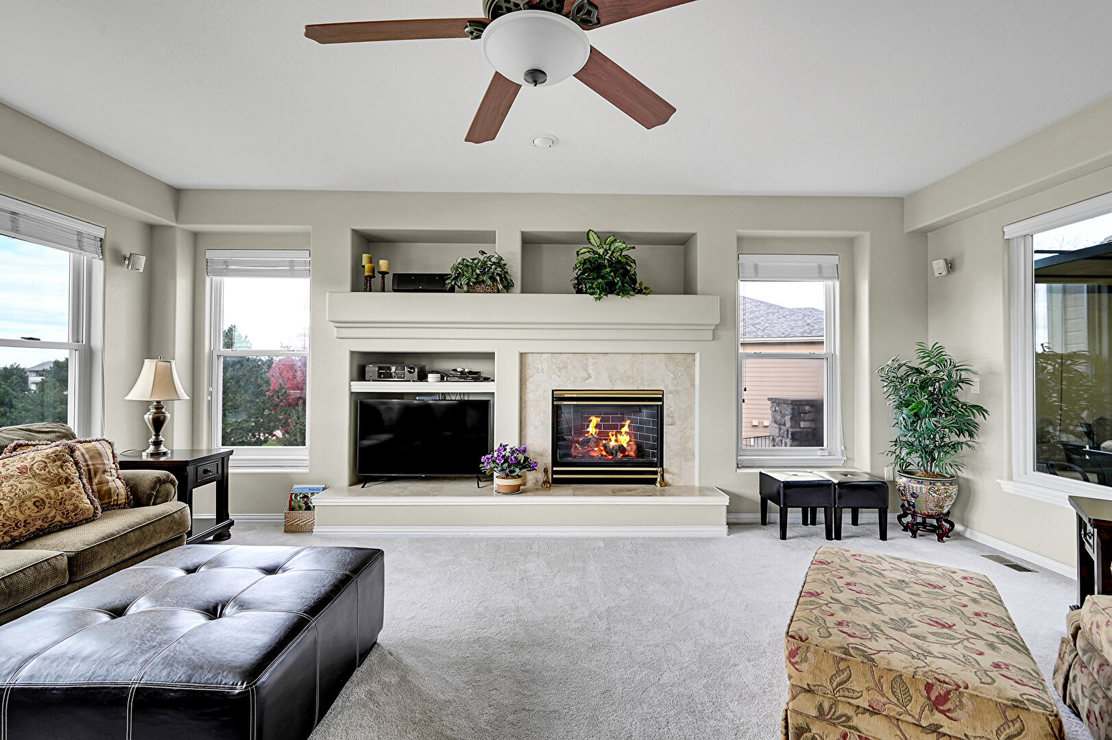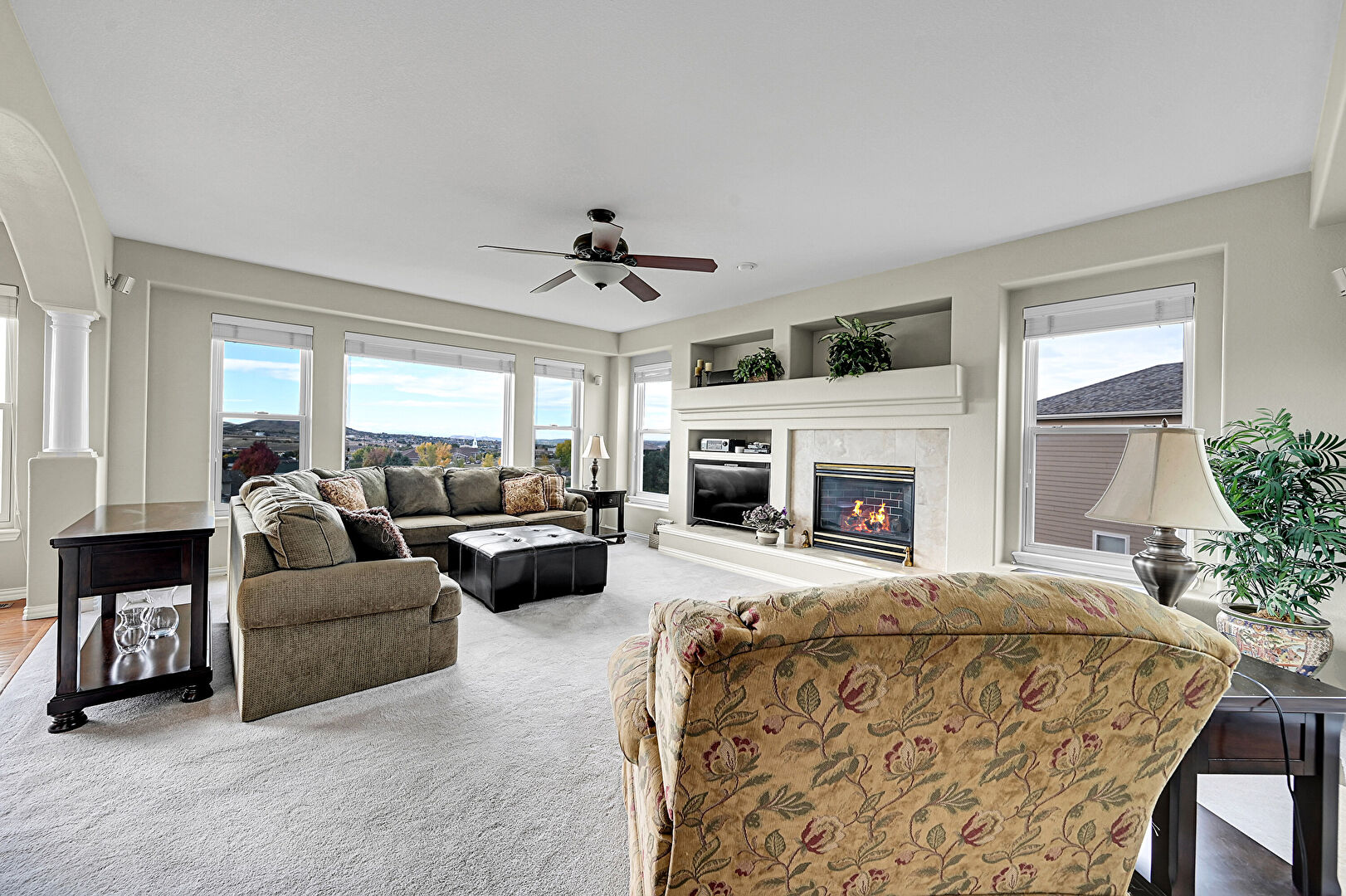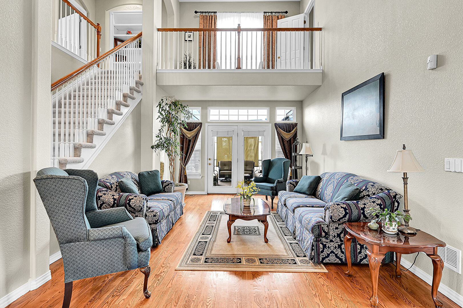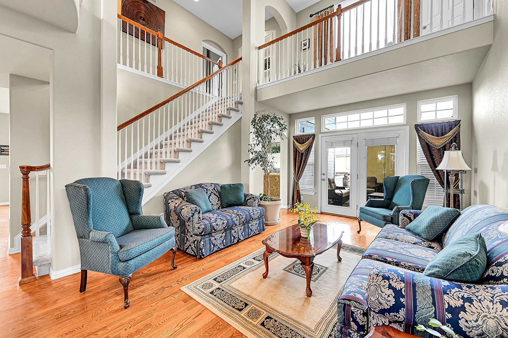 Arched Walkways, Baseboards Wall, Built In Shelves, Carpet, Ceiling Fan, Decorative Columns, Drywall, Fireplace, French Doors, High Ceiling, L Shaped Kitchen, Natural Light, Notable Chandelier, Stairs, Textured Wall, Vent, Wood Finish Floor, Baseboards Wall, Carpet, High Ceiling, Vent, Wood Finish Floor
