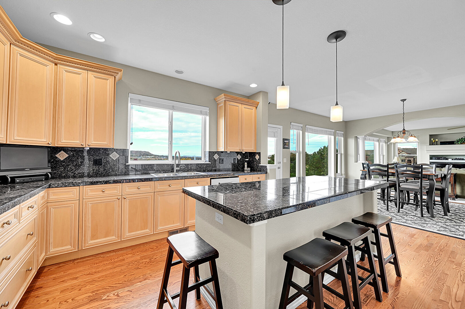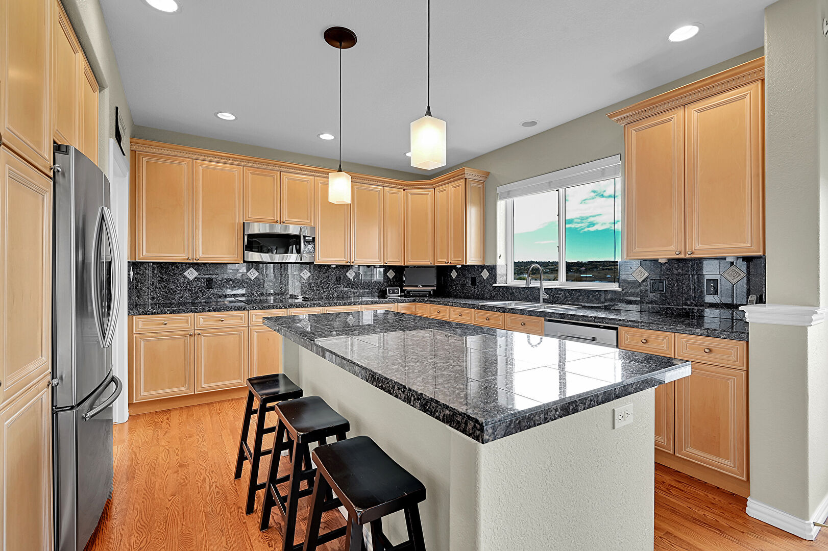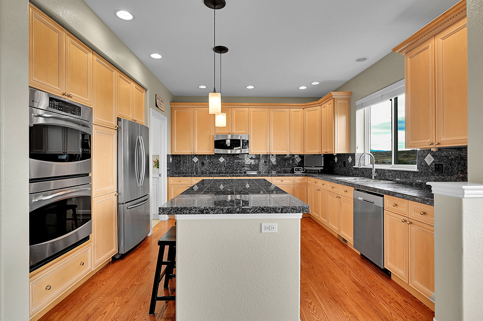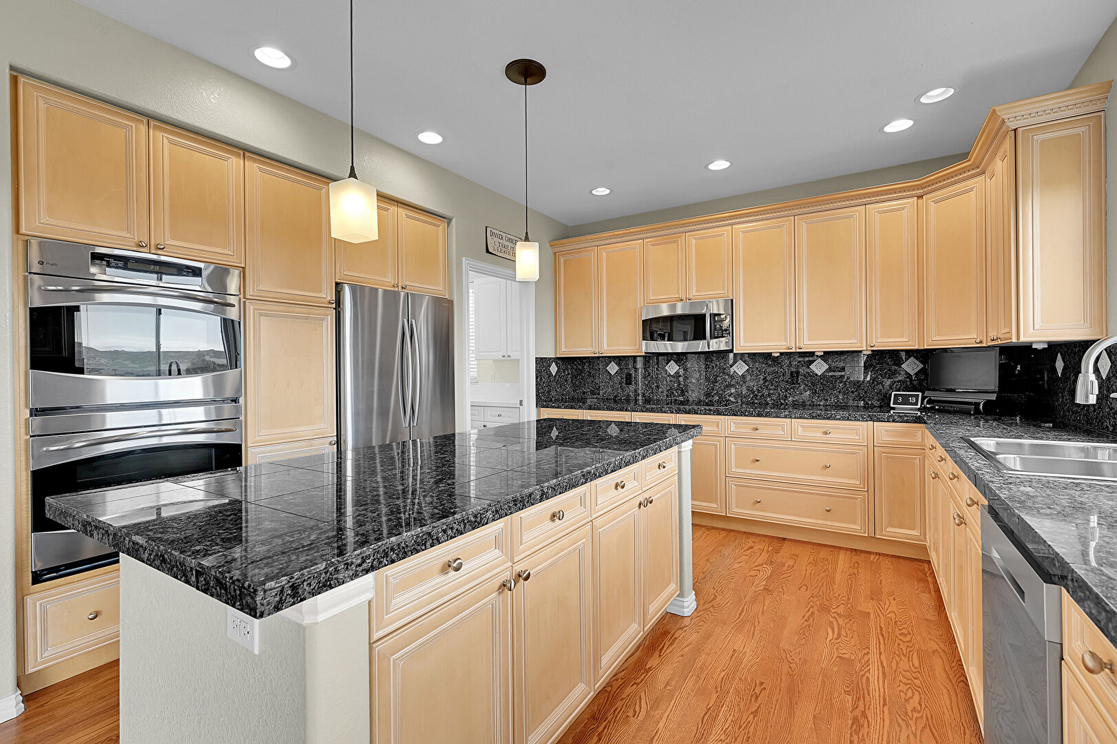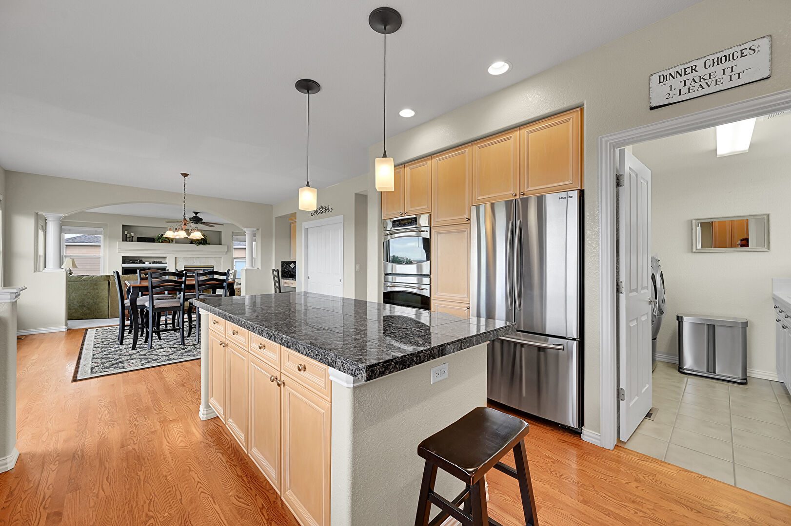 Arched Walkways, Baseboards Wall, Crown Molding Cabinets, Double Oven, Drywall, Kitchen Bar, Kitchen Island, Natural Light, Opens To Living Area, Pendant Lighting, Recessed Lighting, Shaker Cabinets, Stone Countertops, Stone Tile Countertops, Tile Floor, U Shaped Kitchen, Vent, Wood Finish Floor, Arched Walkways, Kitchen Island, Natural Light, Recessed Lighting, Stone Tile Countertops