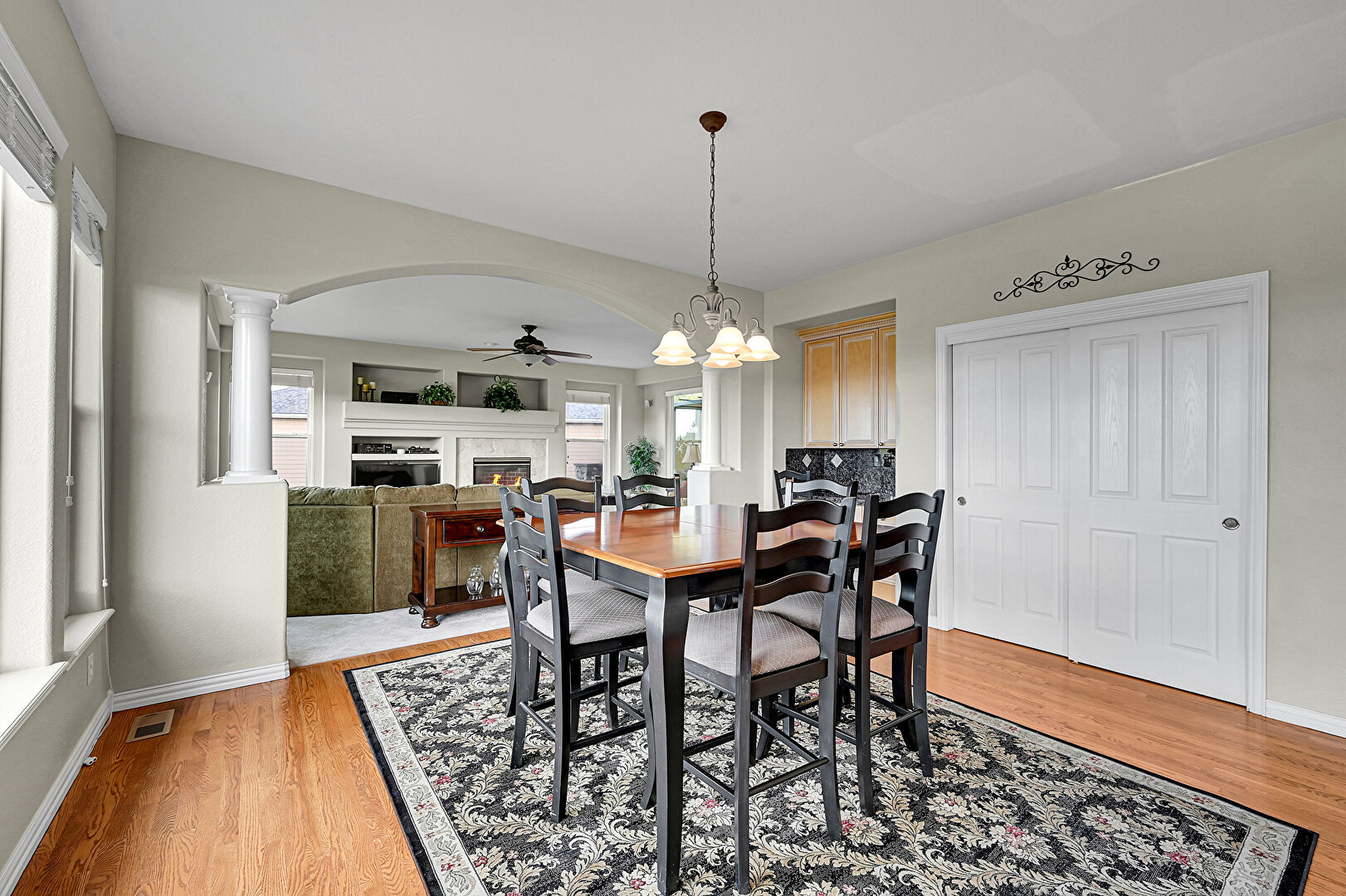 Baseboards Wall, Ceiling Fan, Decorative Columns, Drywall, Fireplace, French Doors, Natural Light, Notable Chandelier, Recessed Lighting, Stairs, U Shaped Kitchen, Vent, Water View, Wood Finish Floor, Arched Walkways, Fireplace, High Ceiling, Natural Light, Vent, Wood Finish Floor