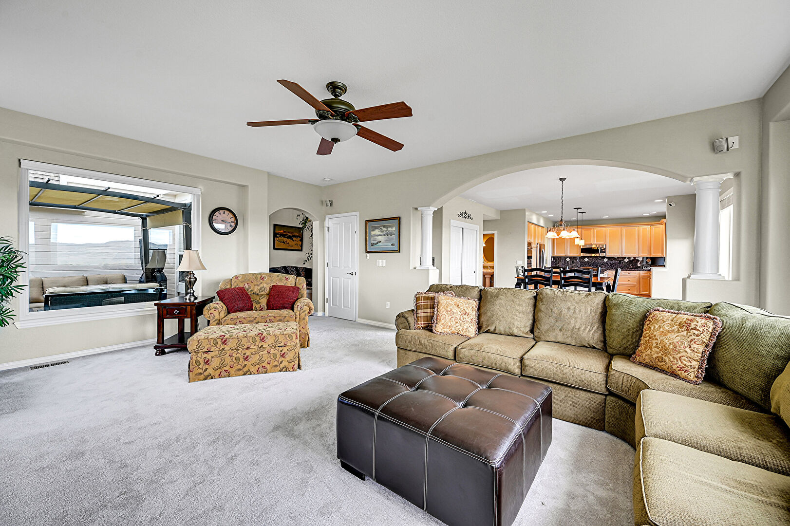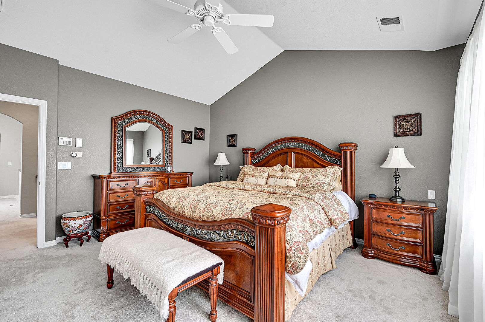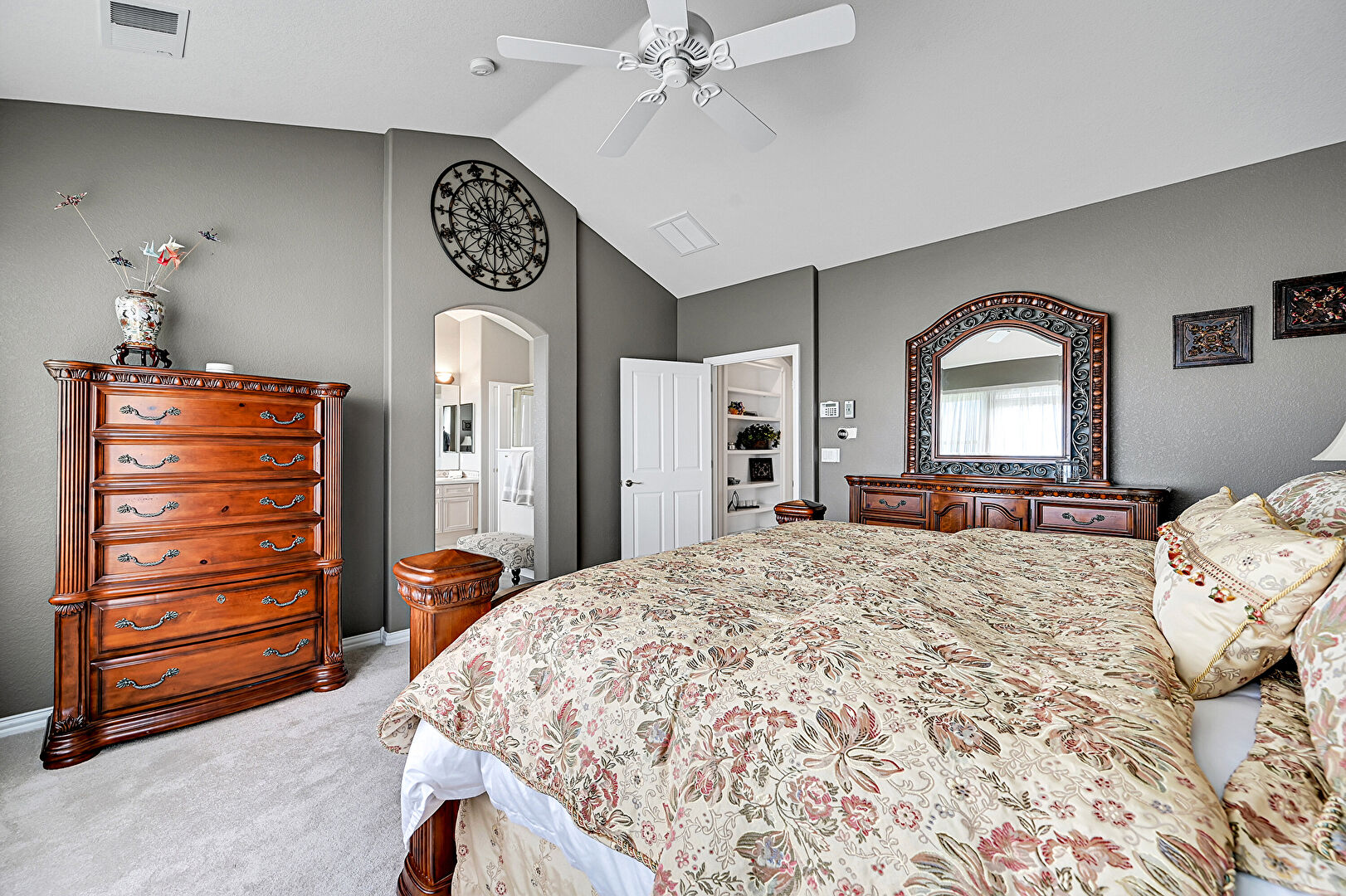 Arched Walkways, Baseboards Wall, Carpet, Cathedral Ceiling, Ceiling Fan, Drywall, Ensuite Bathroom, High Ceiling, Natural Light, Vaulted Ceiling, Vent, Cathedral Ceiling, Ceiling Fan, Natural Light