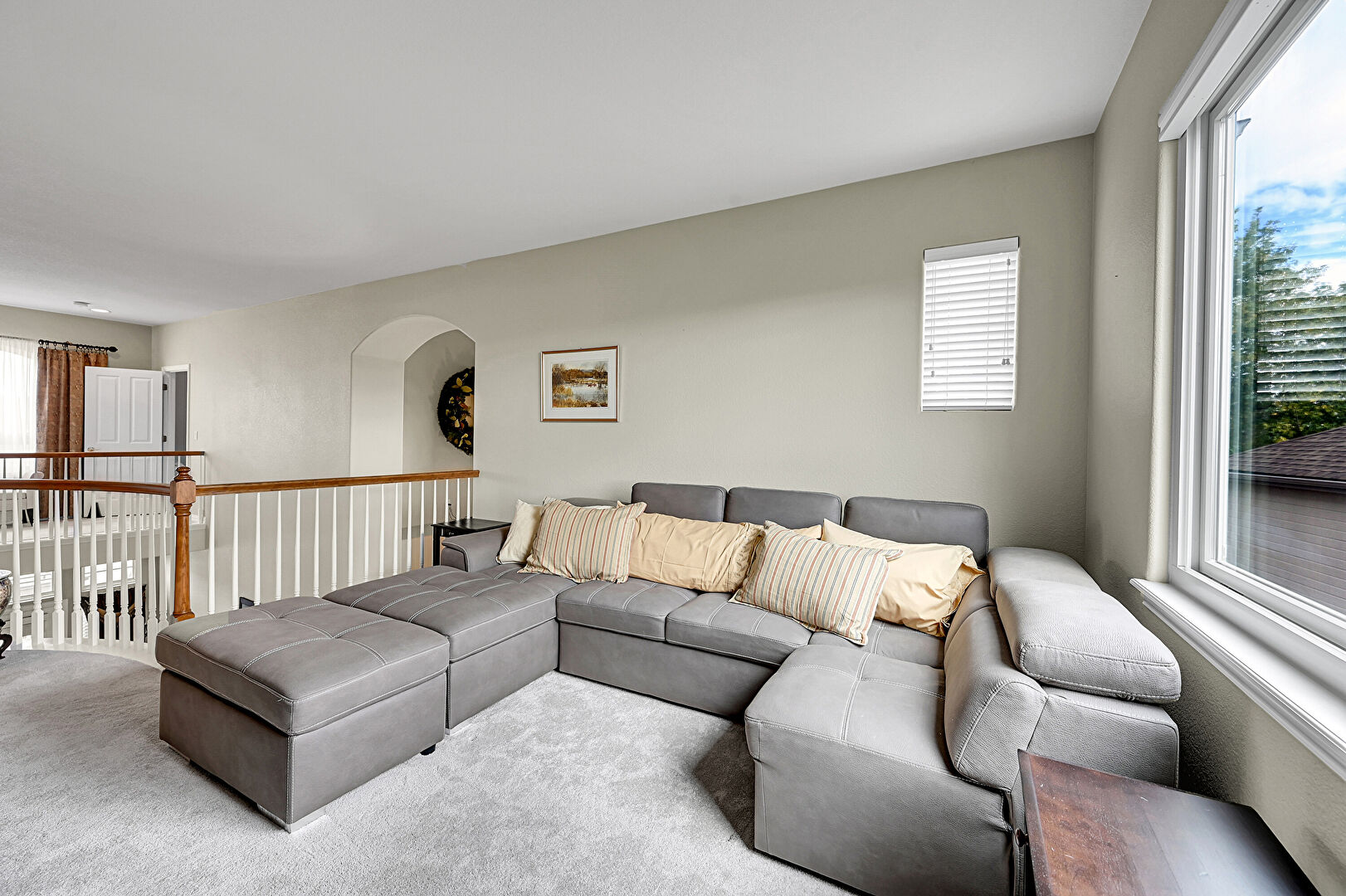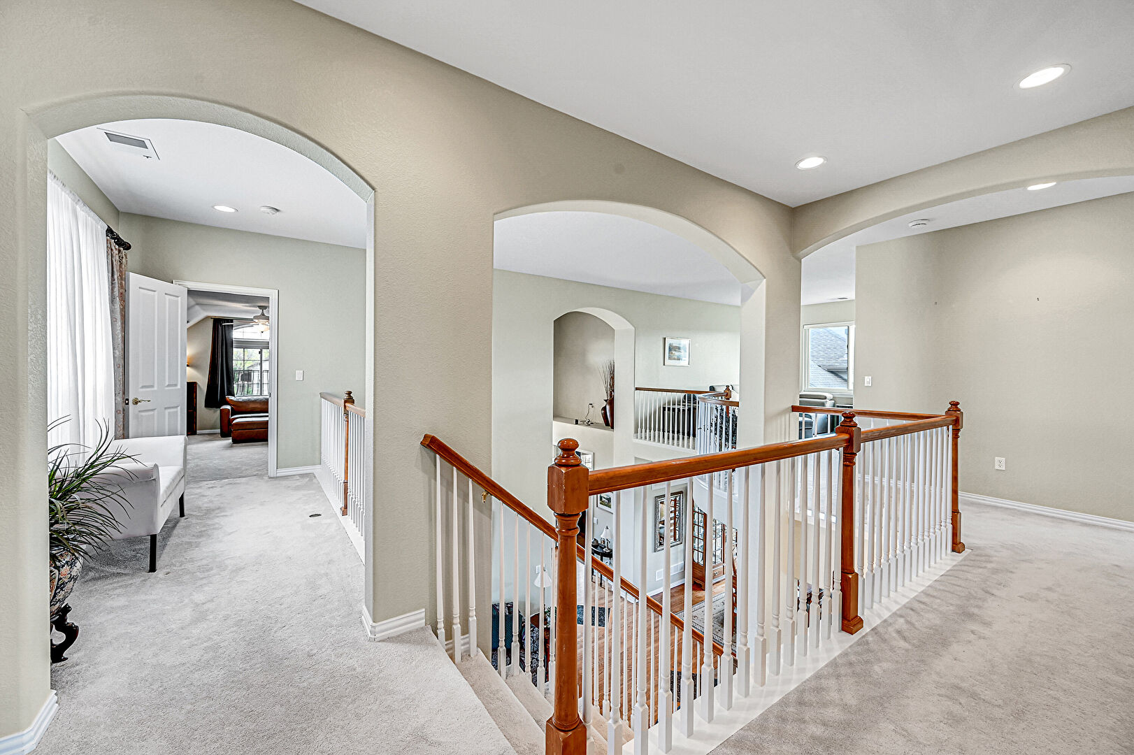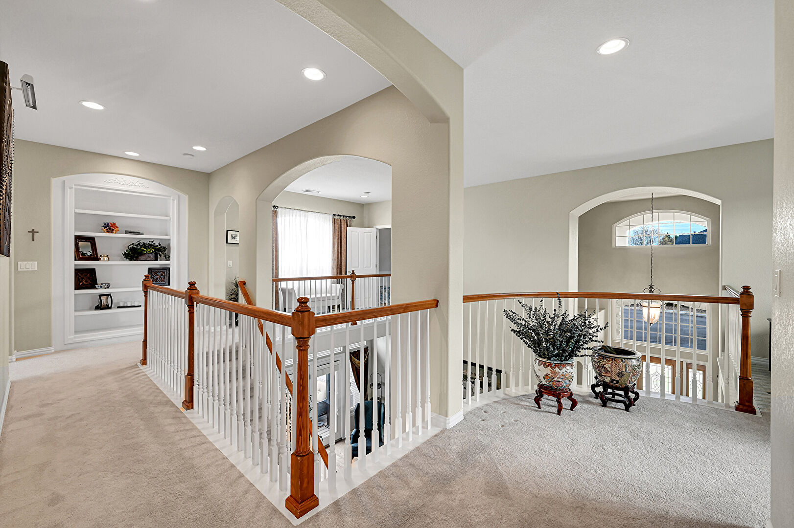 Arched Walkways, Baseboards Wall, Carpet, Drywall, Loft, Natural Light, Recessed Lighting, Upstairs Landing, Vent, Arched Walkways, Built In Shelves, Carpet