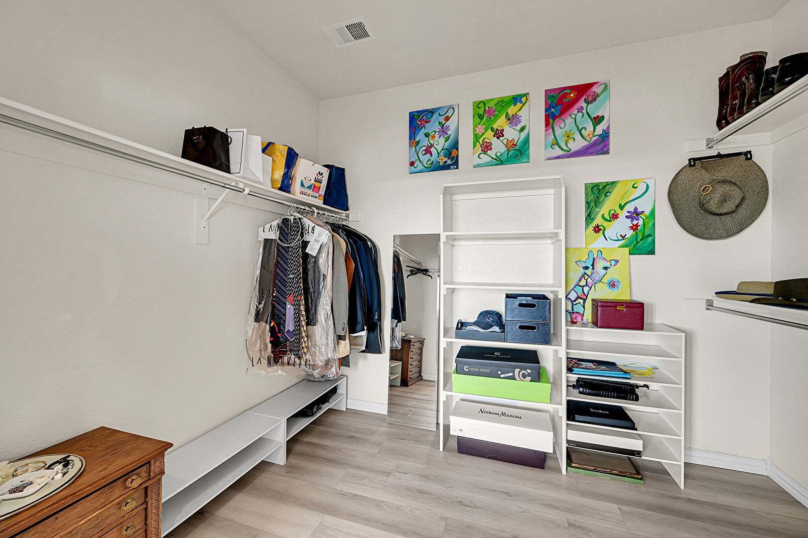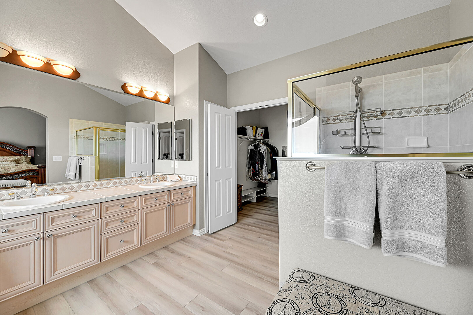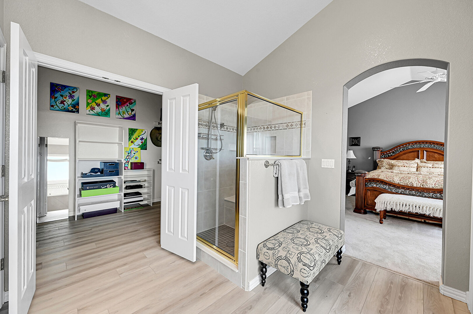 Baseboards Wall, Double Vanity, Drywall, Ensuite Bathroom, Full Bathroom, Natural Light, Recessed Lighting, Vaulted Ceiling, Wood Finish Floor, Ceiling Fan, Full Bathroom, Recessed Lighting, Walk In Closet