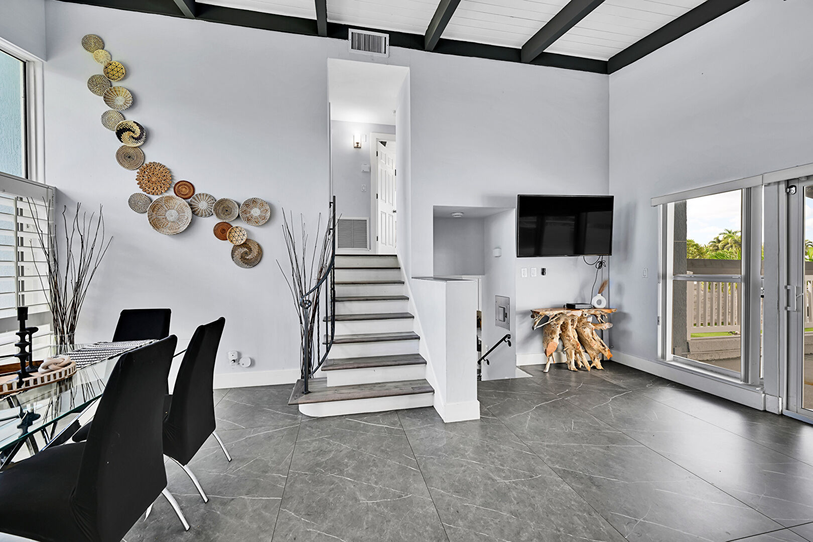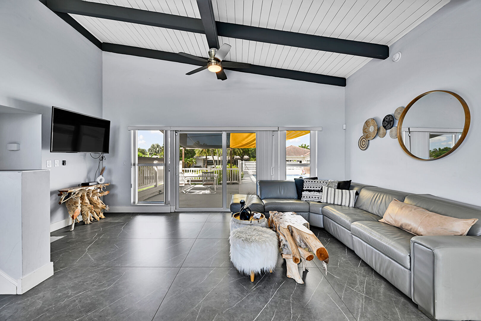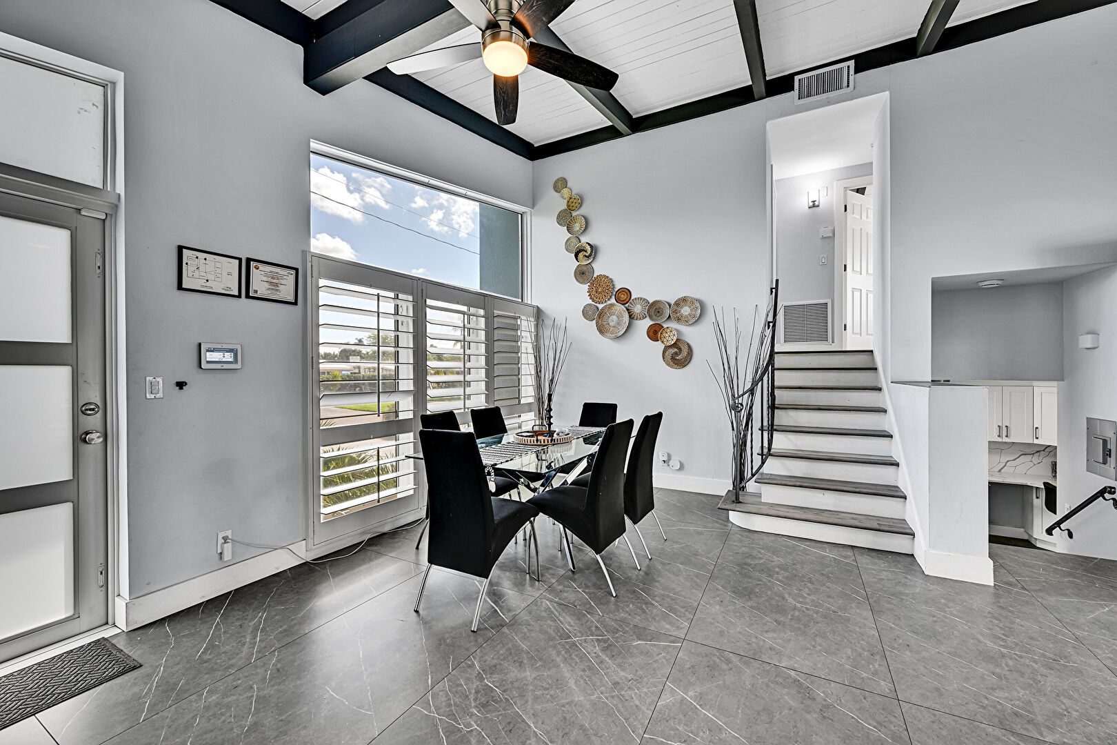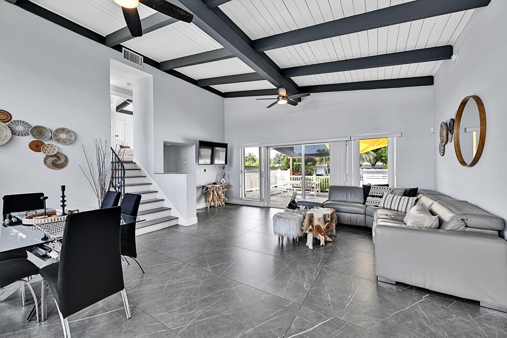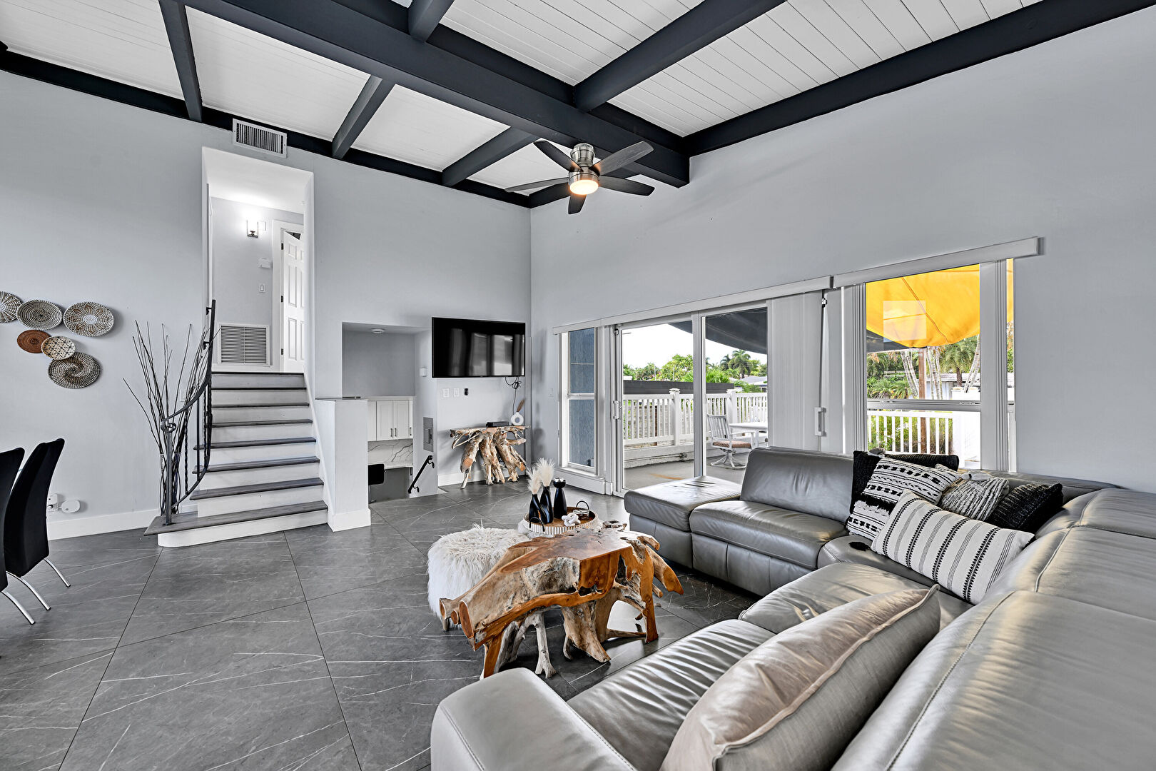 Baseboards Wall, Beamed Ceiling, Ceiling Fan, Coffered Ceiling, Drywall, High Ceiling, Marble Finish Floor, Natural Light, Stairs, Tile Floor, Vaulted Ceiling, Vent, Wood Ceiling, Beamed Ceiling, Ceiling Fan, Natural Light, Pool View, Vaulted Ceiling, Wood Ceiling