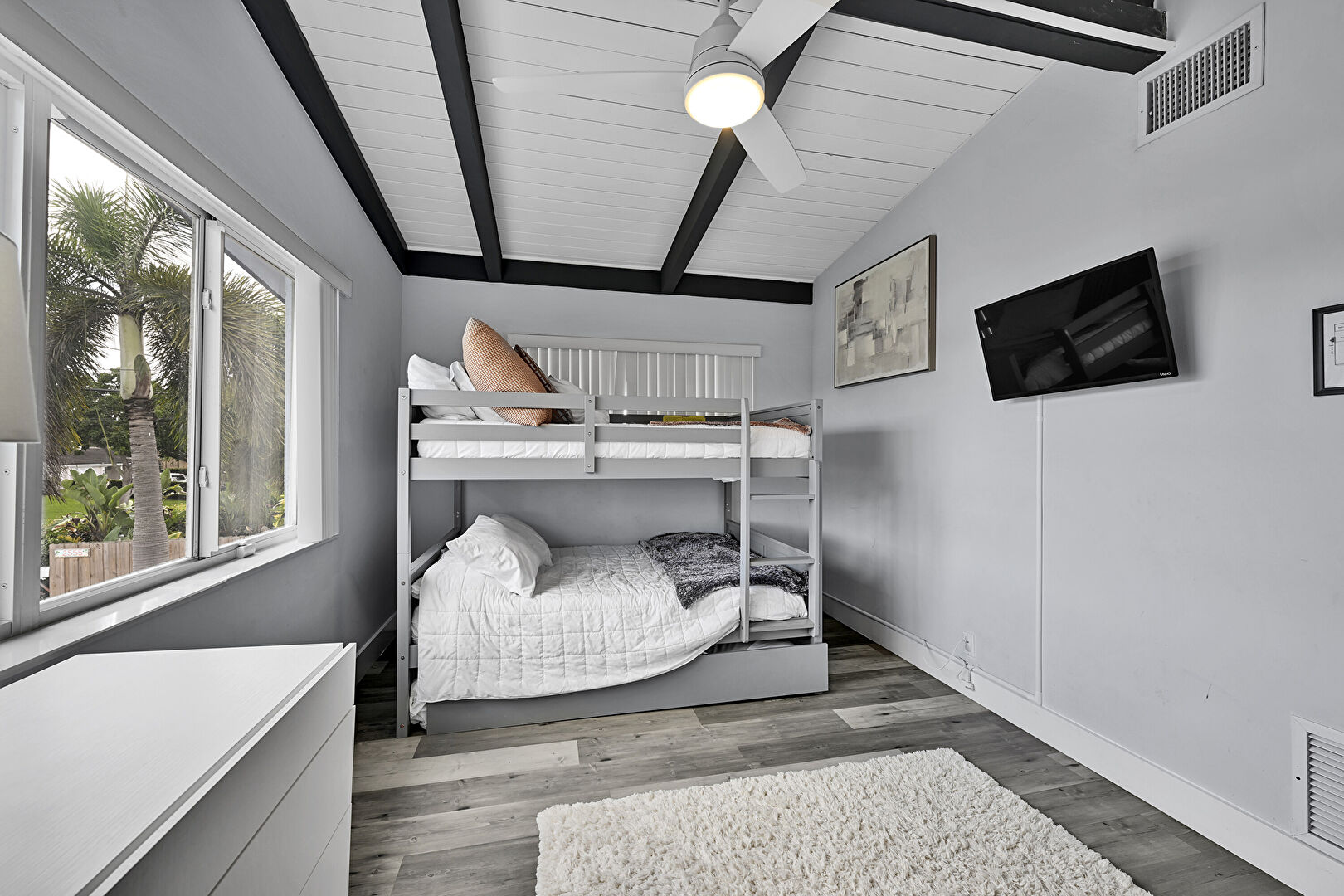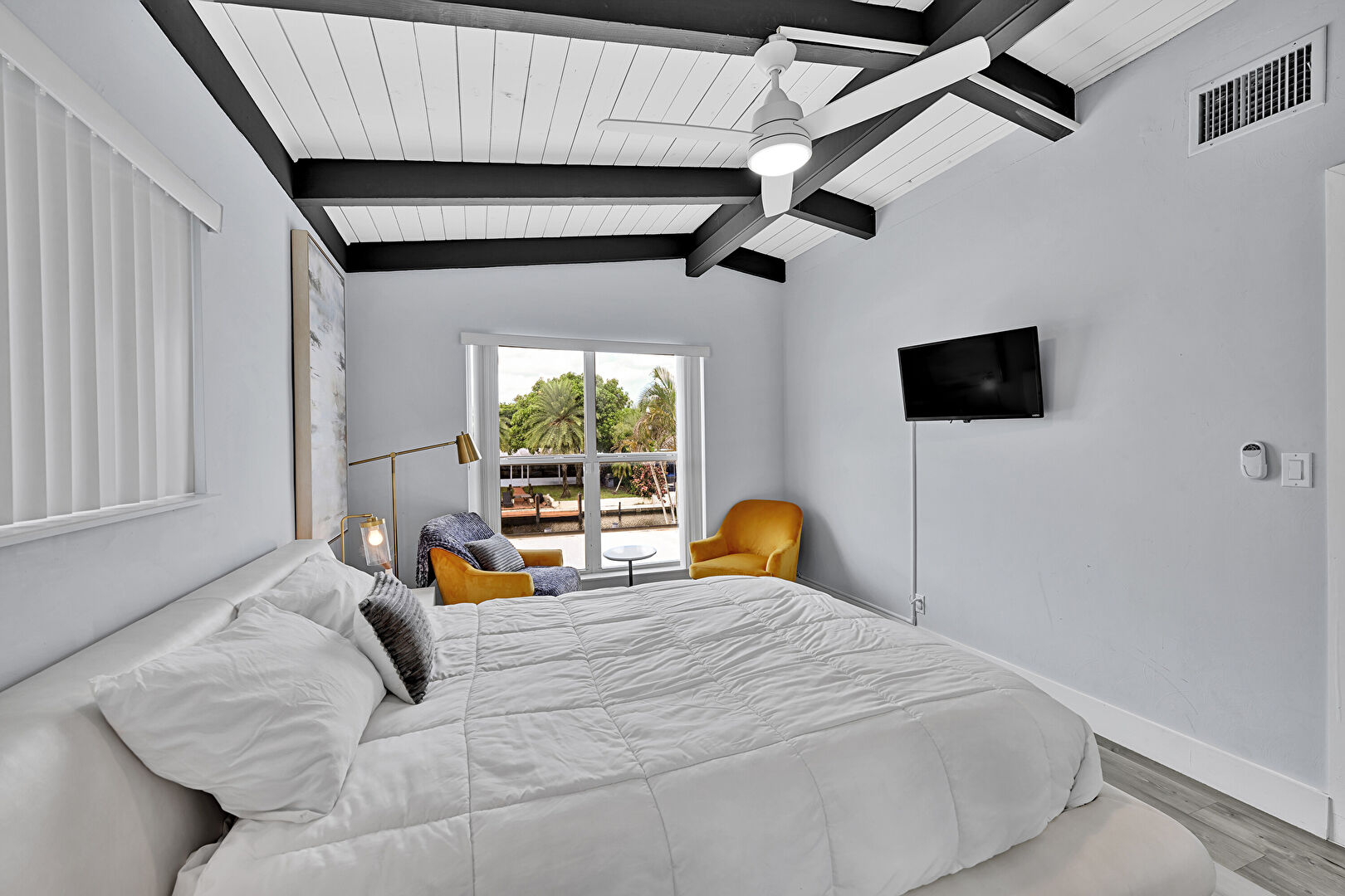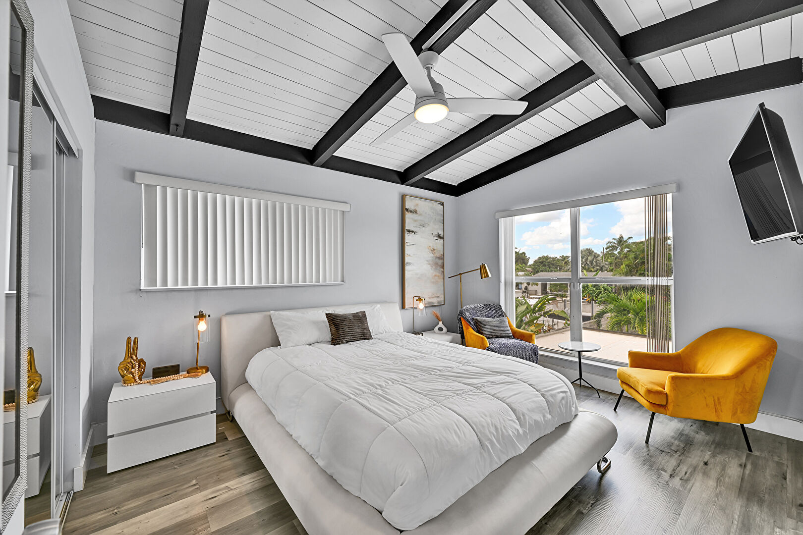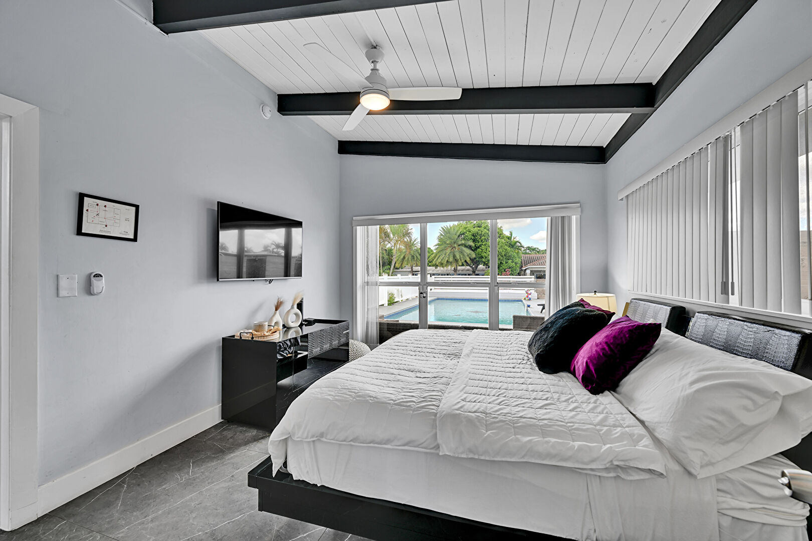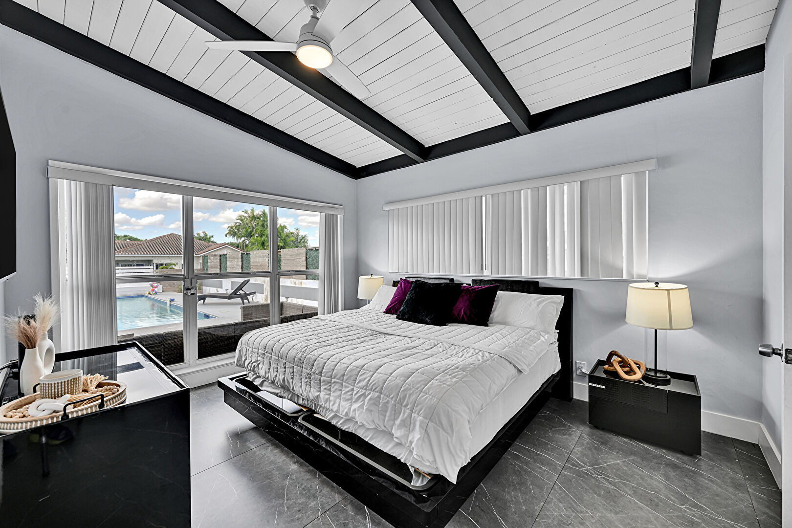 Access To Exterior, Baseboards Wall, Beamed Ceiling, Cathedral Ceiling, Ceiling Fan, Closet, Drywall, French Doors, Natural Light, Pool View, Tile Floor, Vaulted Ceiling, Vent, Wood Ceiling, Wood Finish Floor, Baseboards Wall, Ceiling Fan, Drywall, Vaulted Ceiling, Wood Ceiling, Wood Finish Floor