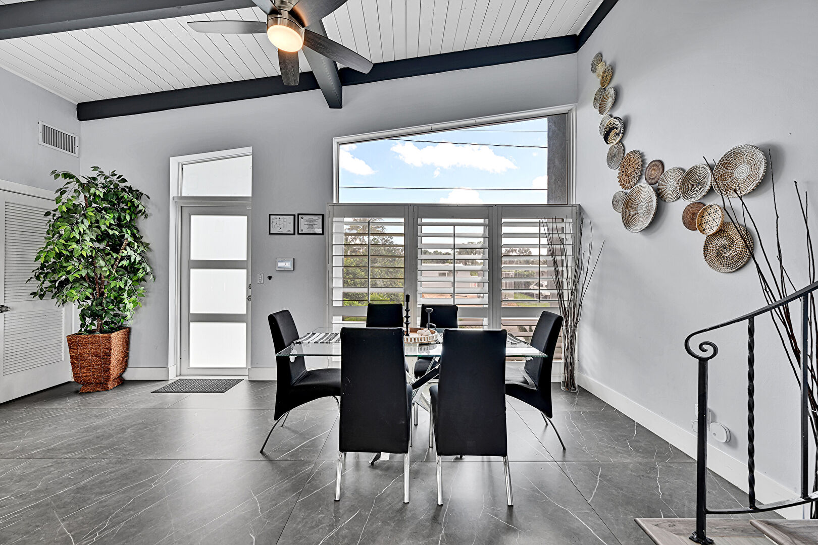 Baseboards Wall, Beamed Ceiling, Ceiling Fan, Drywall, High Ceiling, Natural Light, Stairs, Tile Floor, Vent, Wood Ceiling, Drywall, Natural Light, Wood Ceiling