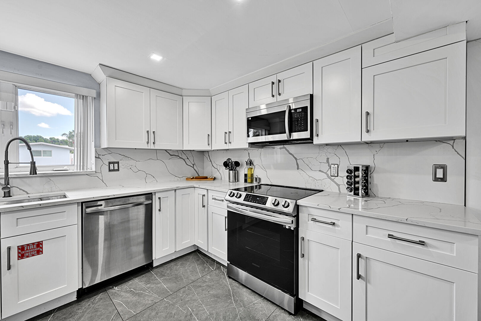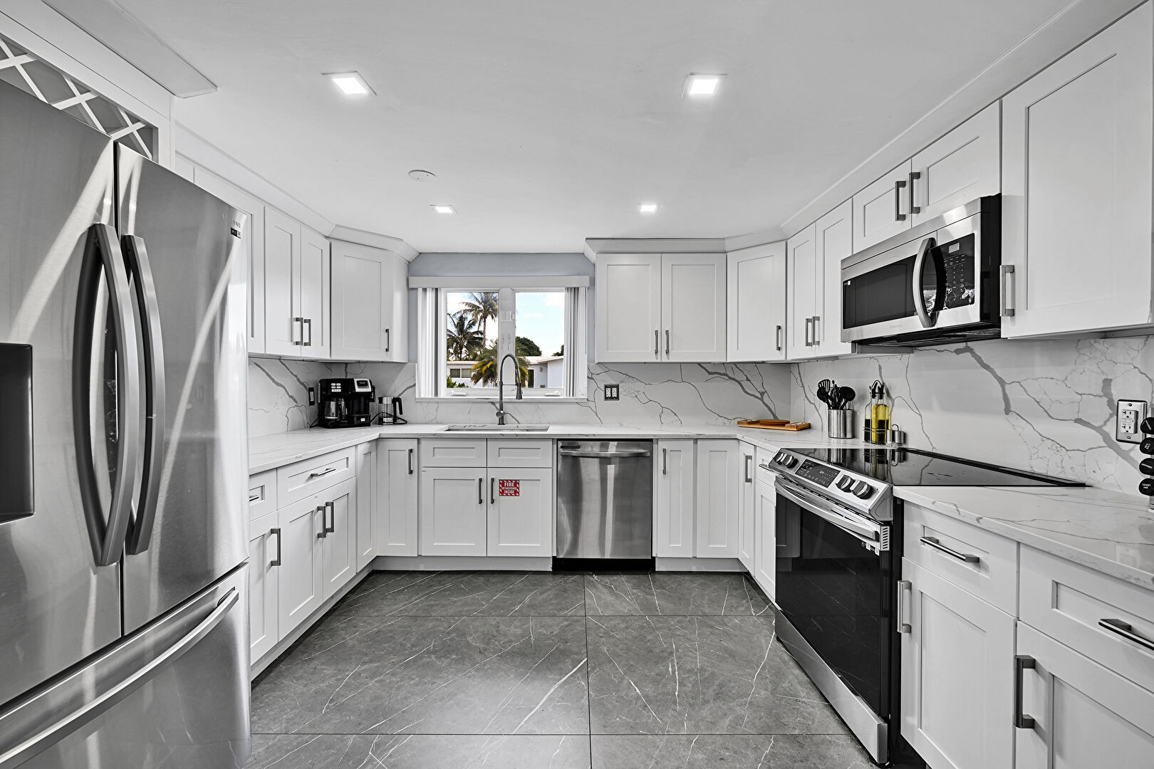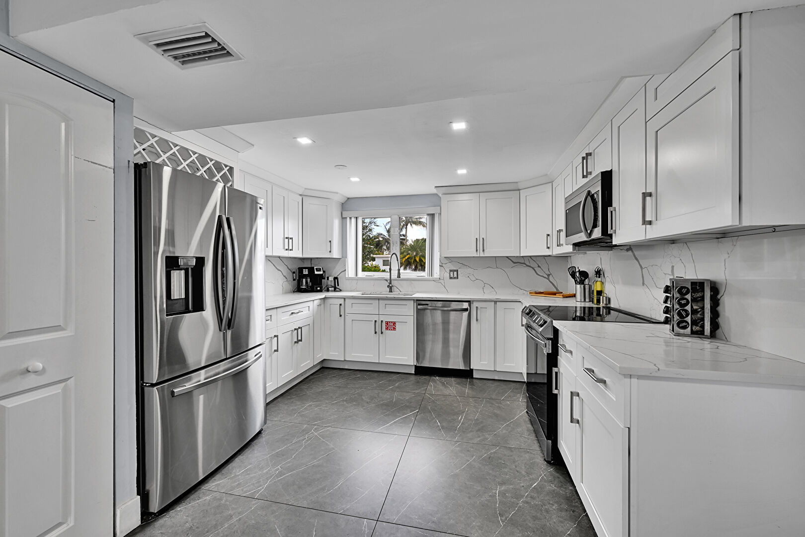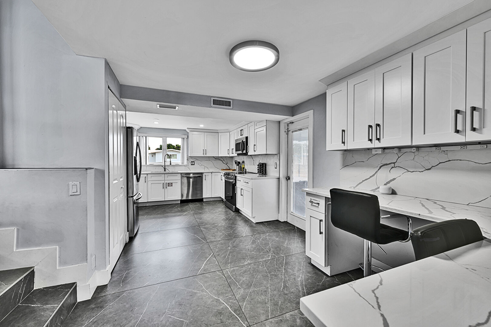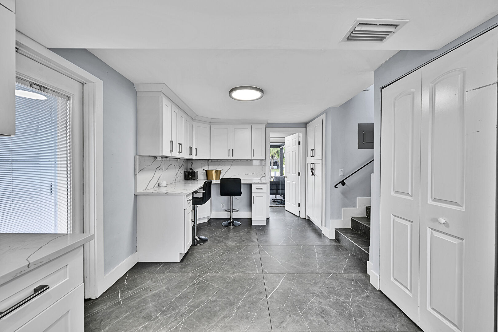Baseboards Wall, Built In Desk, Crown Molding Cabinets, Drywall, G Shaped Kitchen, Natural Light, Office Area, Recessed Lighting, Shaker Cabinets, Stone Countertops, Tile Floor, U Shaped Kitchen, Vent, Crown Molding Cabinets, Drywall, Marble Finish Floor, Shaker Cabinets, Tile Floor, Vent