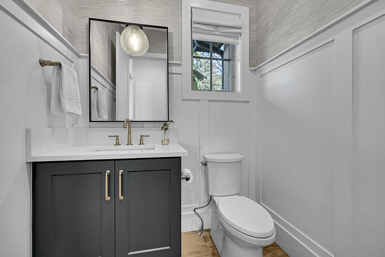 Baseboards Wall, Built In Shelves, Combined Bath Shower, Drywall, Full Bathroom, Half Bathroom, Natural Light, Paneling Wall, Recessed Lighting, Tile Floor, Vanity, Vent, Vinyl Floor, Wood Finish Floor, Baseboards Wall, Full Bathroom, Half Bathroom, Natural Light, Notable Chandelier
