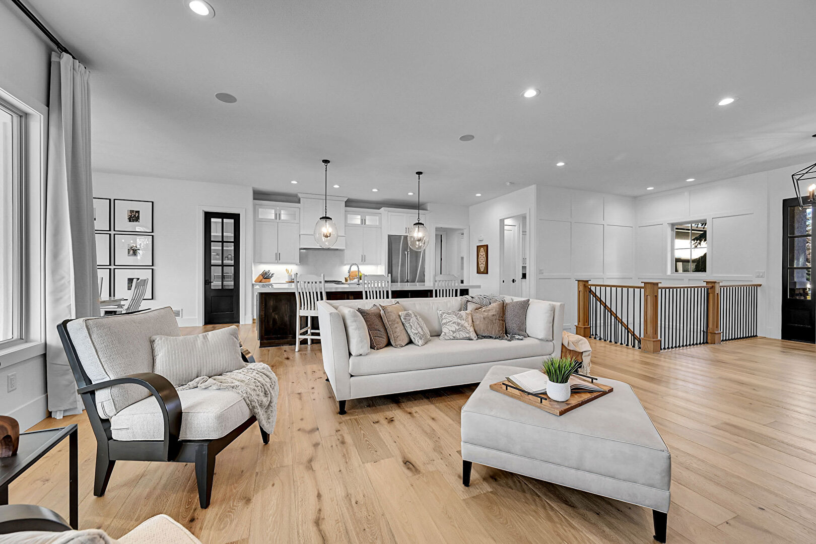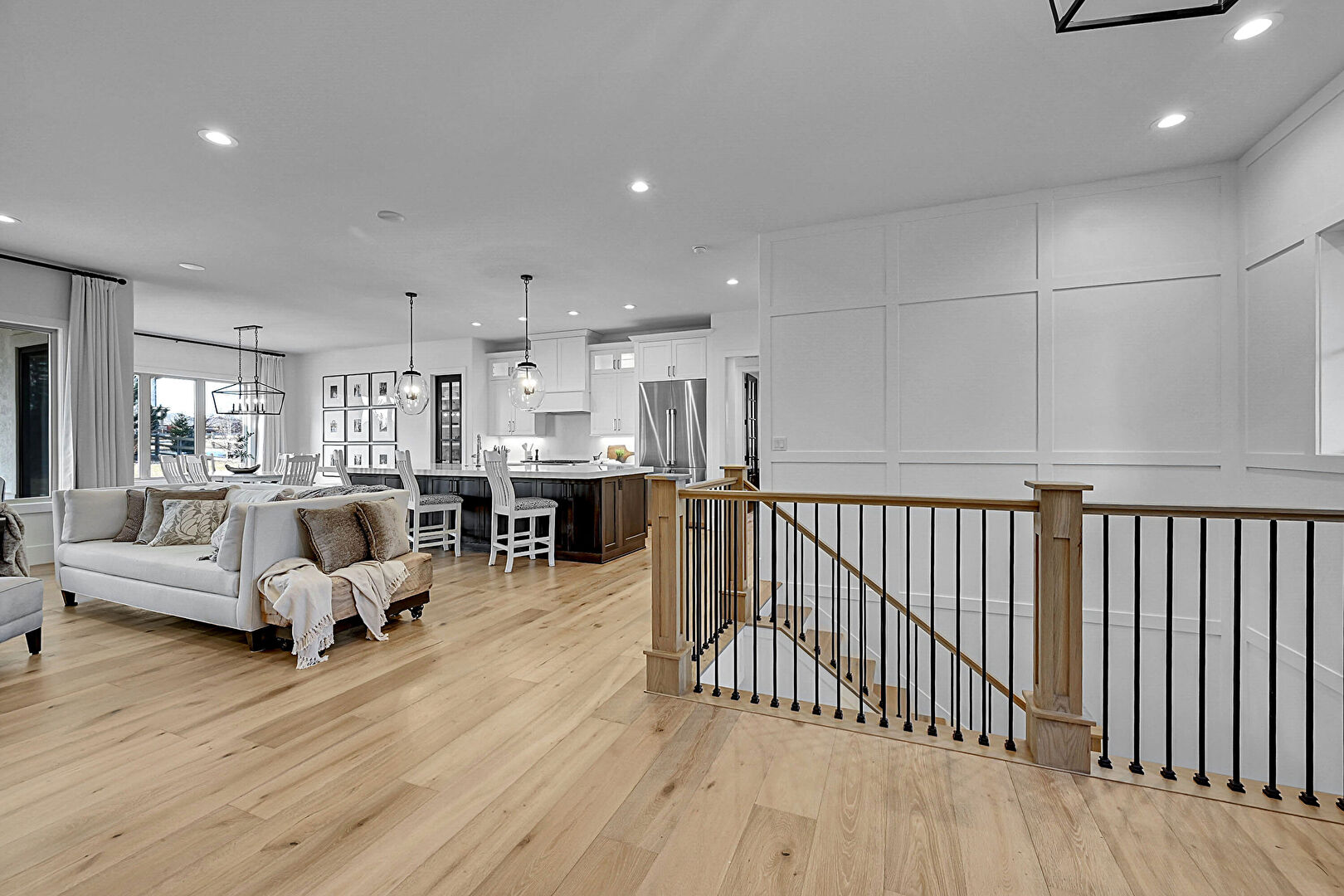 Baseboards Wall, Drywall, Natural Light, Notable Chandelier, Recessed Lighting, Wood Finish Floor, Paneling Wall, Upstairs Landing