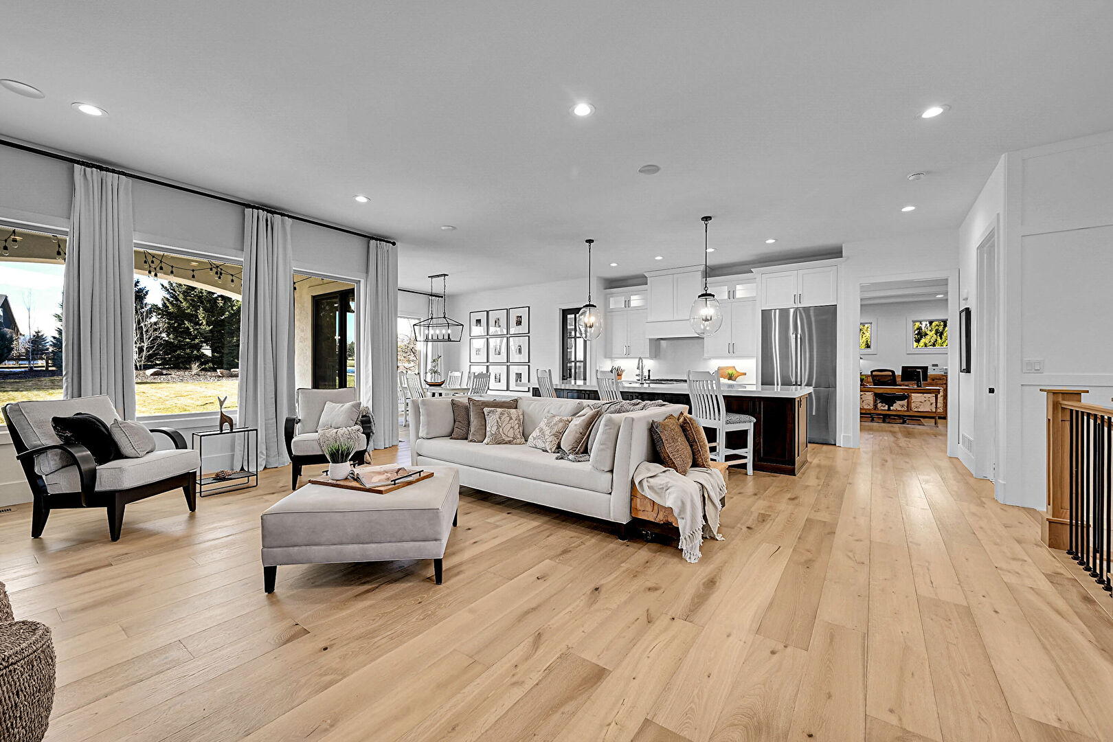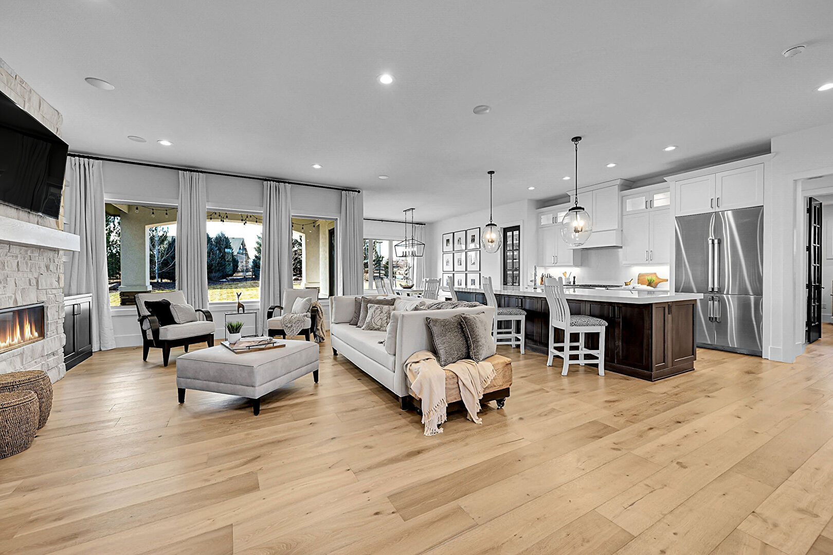 Baseboards Wall, Drywall, Fireplace, L Shaped Kitchen, Natural Light, Notable Chandelier, One Wall Kitchen, Paneling Wall, Recessed Lighting, Wood Finish Floor, Built In Shelves, Drywall, Fireplace, L Shaped Kitchen