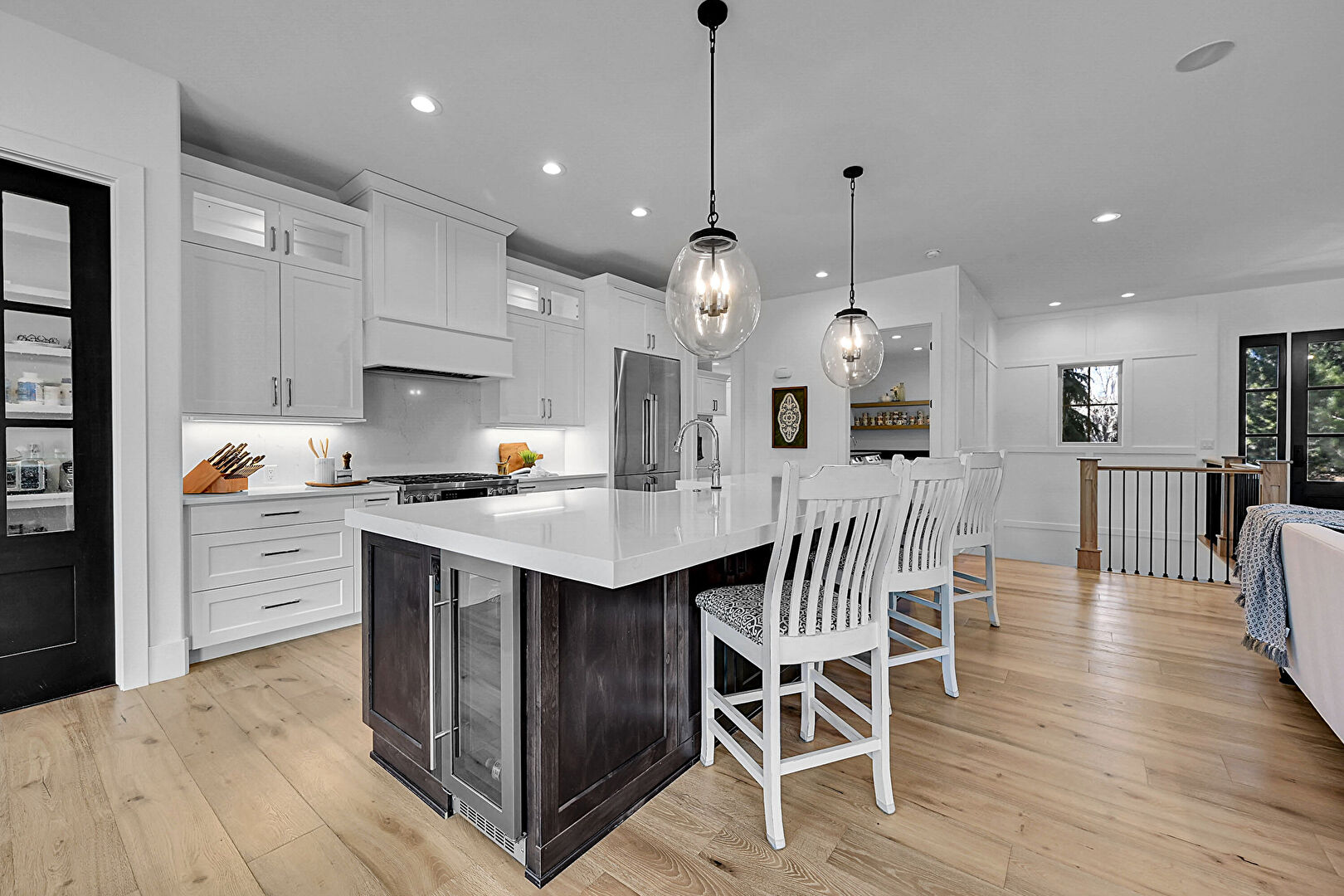 Baseboards Wall, Built In Shelves, Crown Molding Cabinets, Dark Brown Cabinets, Drywall, Fireplace, Glass Insert Cabinets, Kitchen Bar, Kitchen Island, Kitchen Peninsula, Natural Light, Notable Chandelier, One Wall Kitchen, Open Shelves, Opens To Living Area, Pendant Lighting, Recessed Lighting, Shaker Cabinets, Stone Countertops, Vent, Wine Cooler, Wood Finish Floor, Crown Molding Cabinets, One Wall Kitchen, Shaker Cabinets, Stone Countertops, Vent