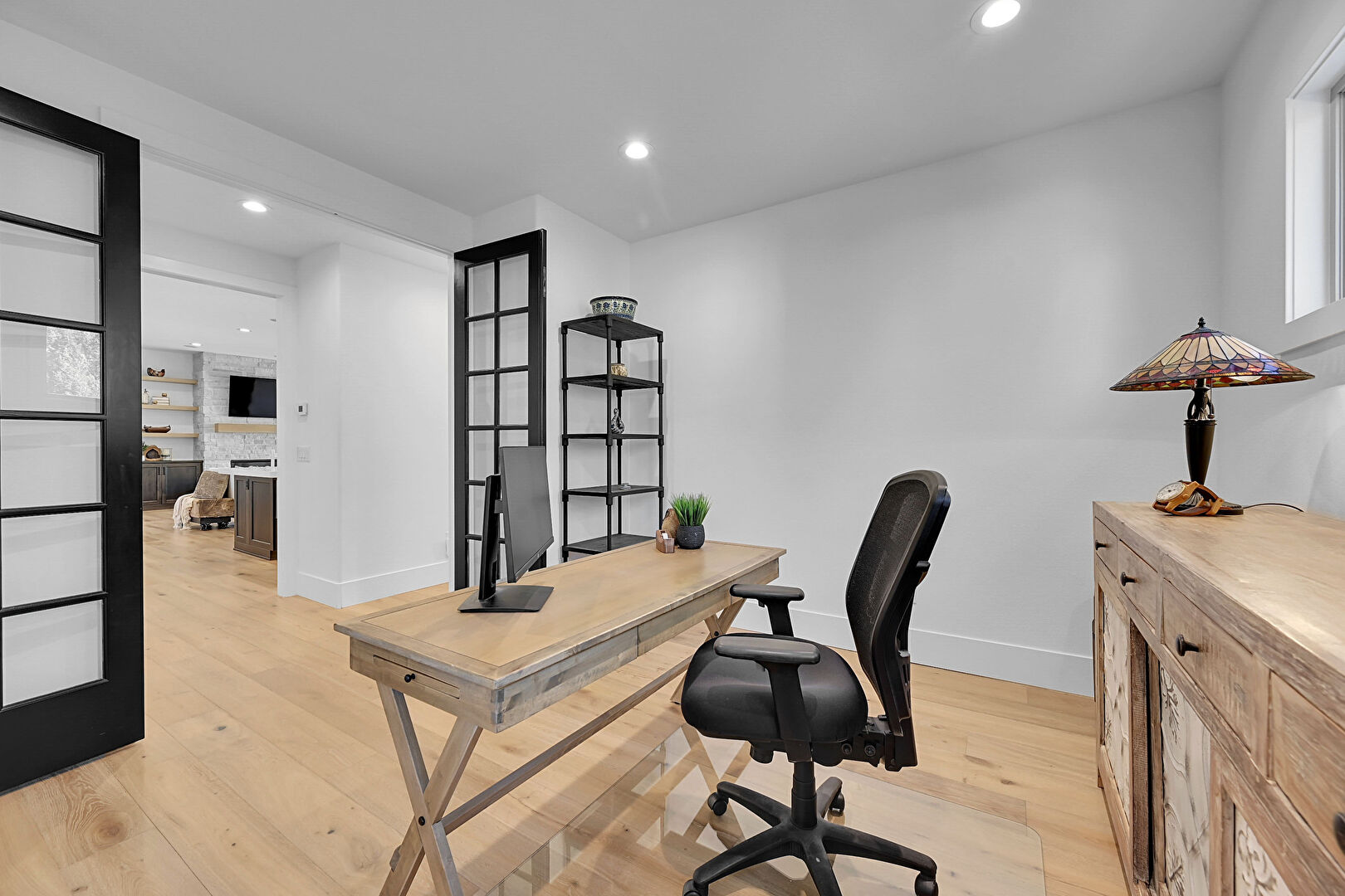 Baseboards Wall, Office Area, Recessed Lighting, Wood Finish Floor, Drywall
