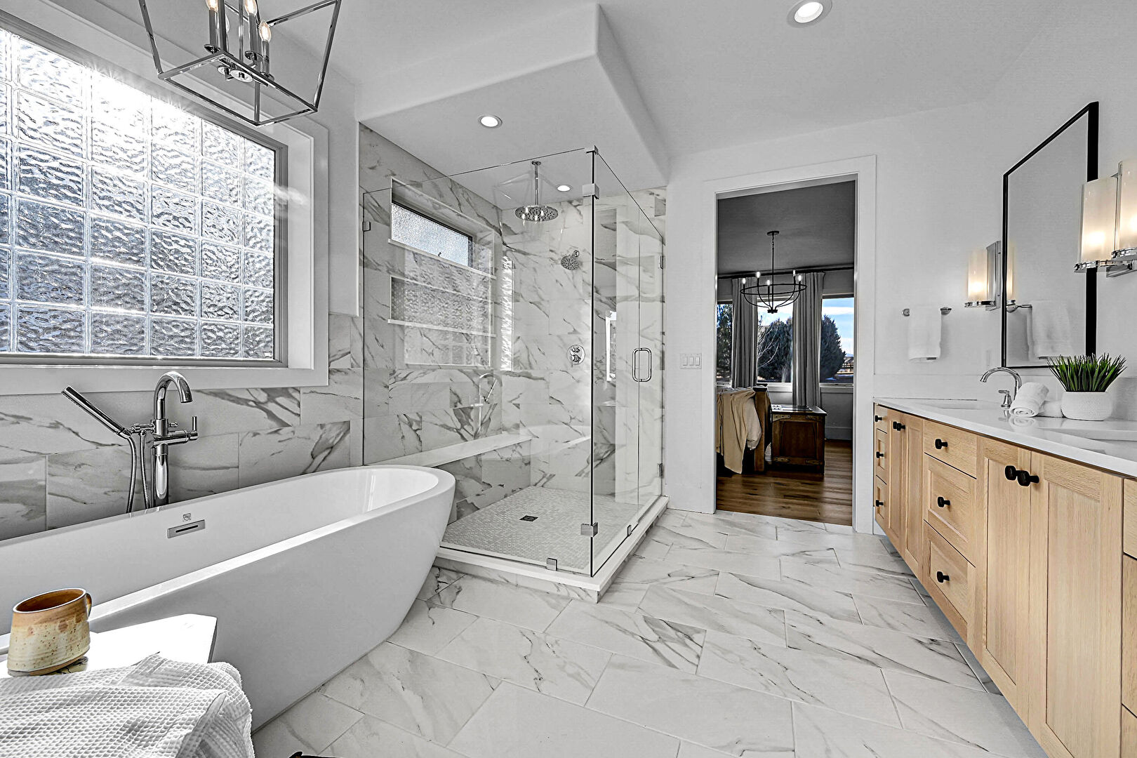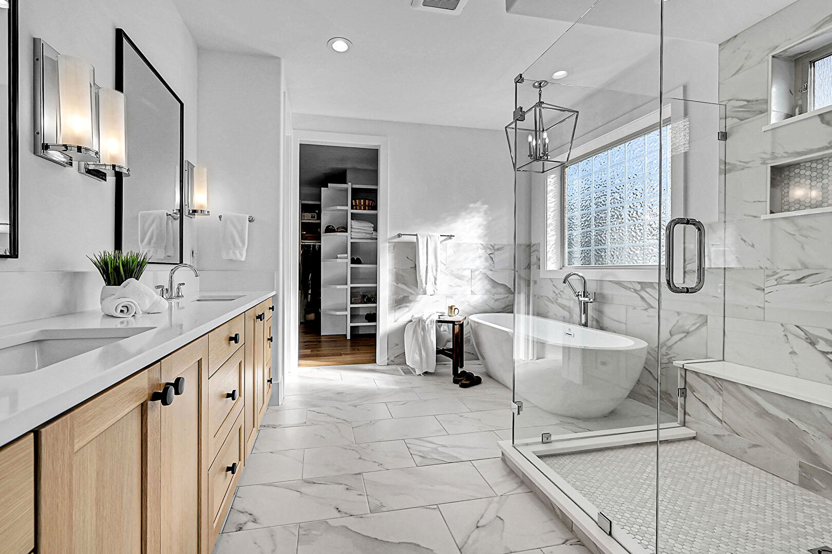 Double Vanity, Drywall, Full Bathroom, Marble Finish Floor, Natural Light, Notable Chandelier, Recessed Lighting, Walk In Closet, Drywall, Notable Chandelier