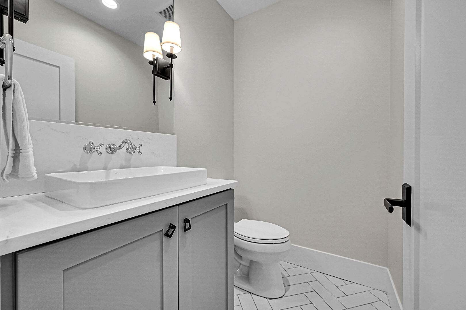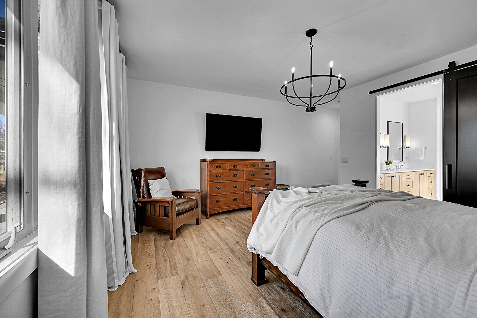 Barn Door, Drywall, Natural Light, Notable Chandelier, Wood Finish Floor, Baseboards Wall, Ensuite Bathroom, Wood Finish Floor